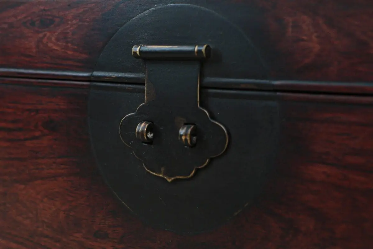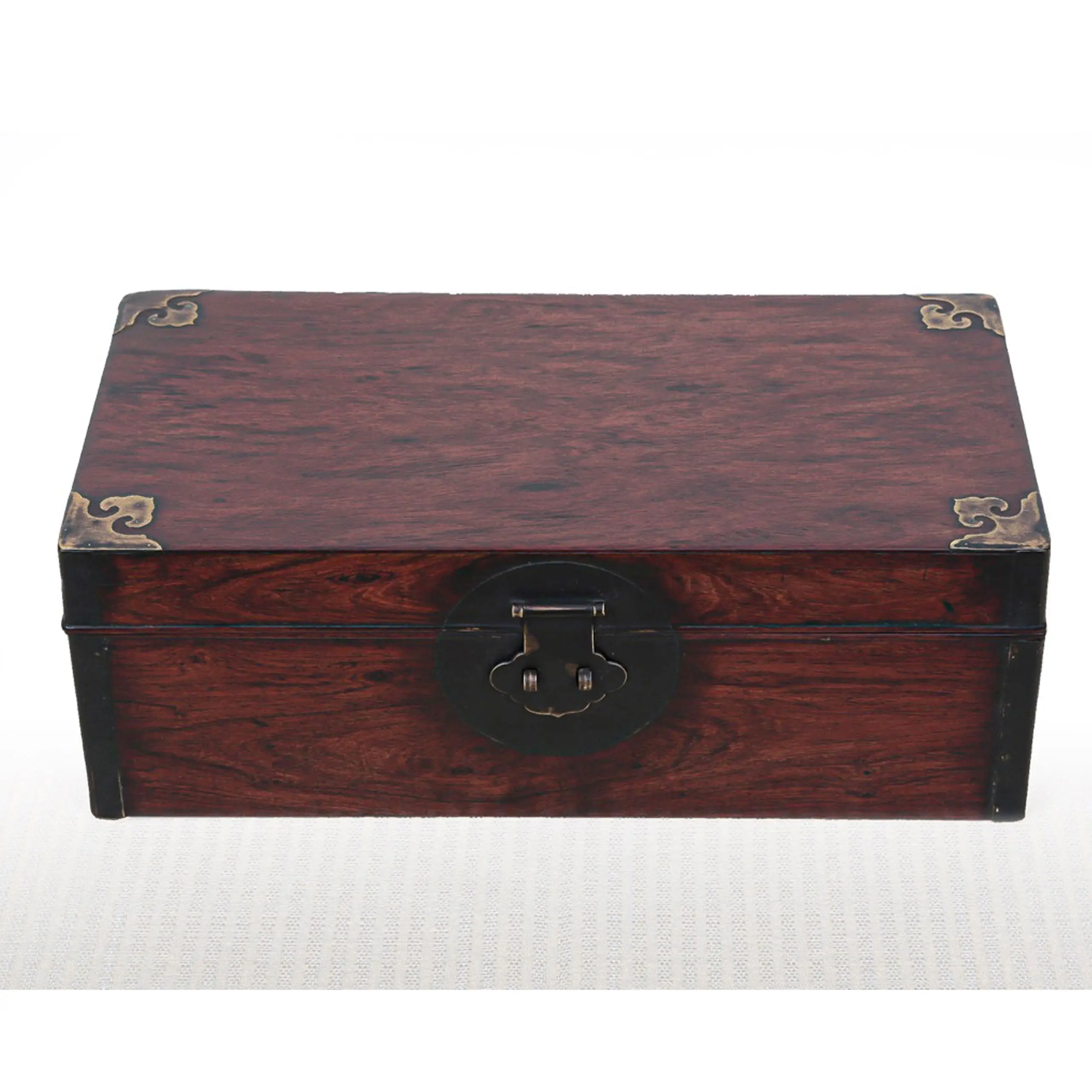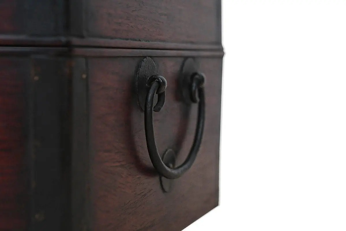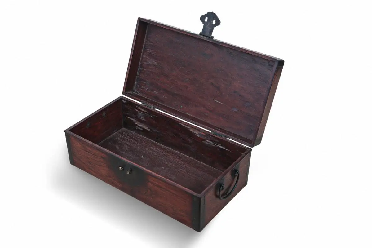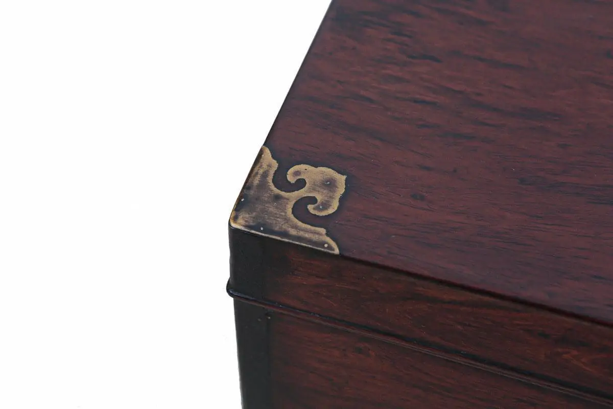 | Description | Small, top lifting, document box with brass lock plate, brass copper decorative hardware on sides. |