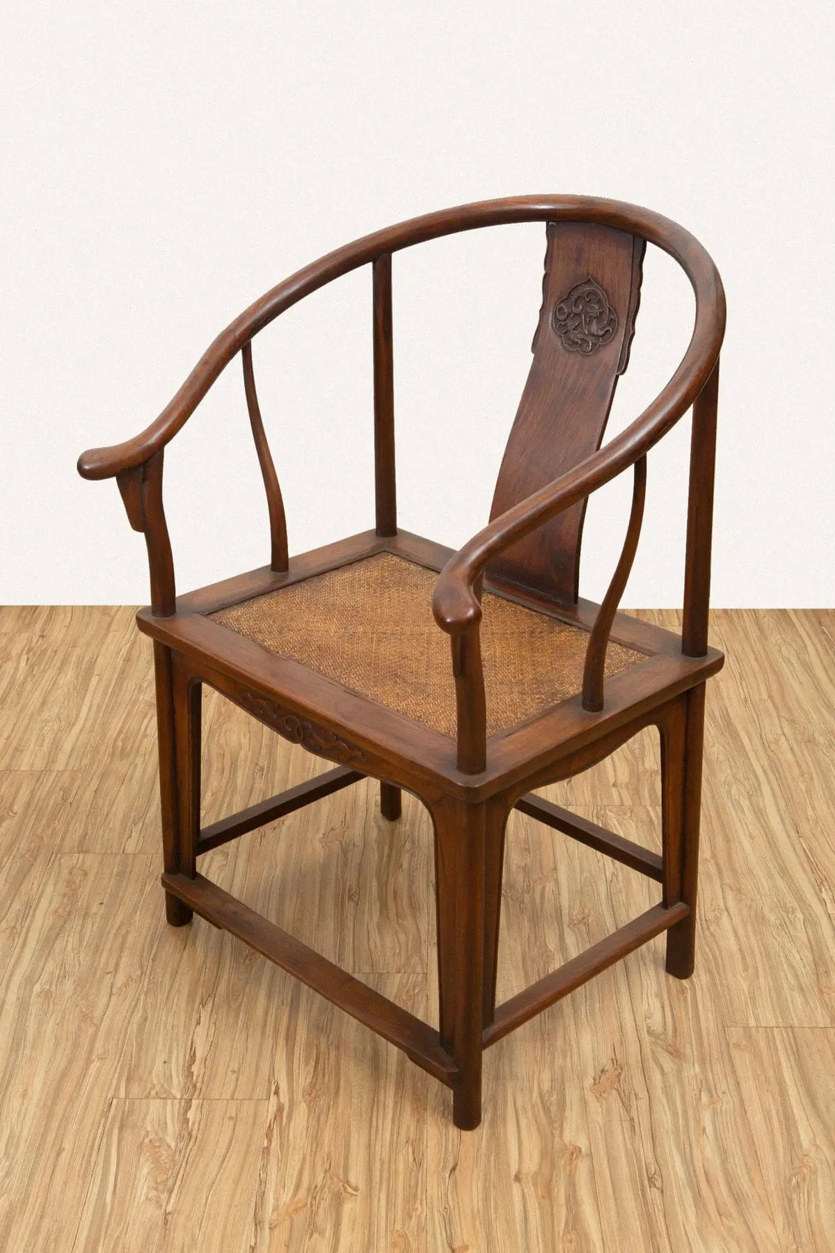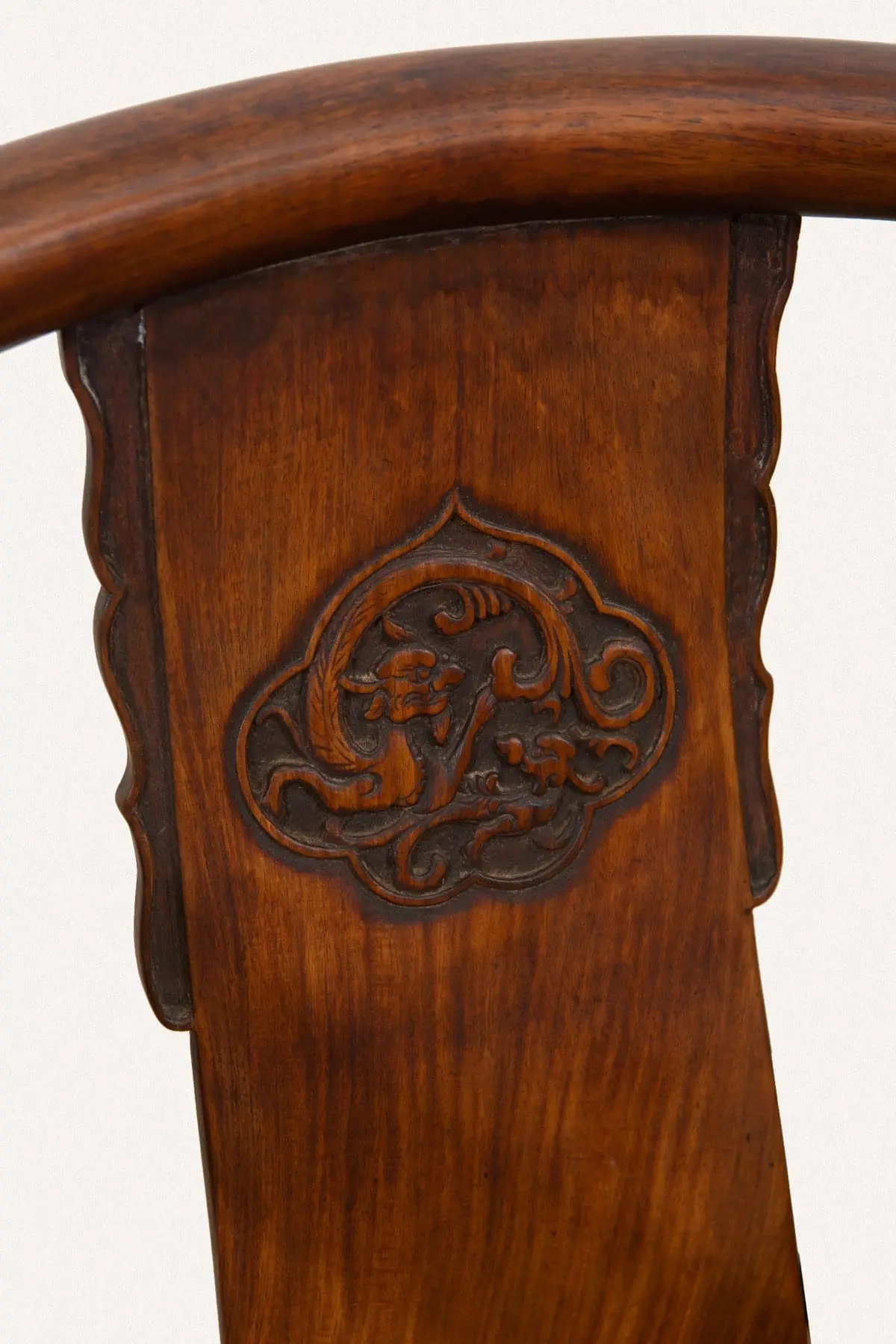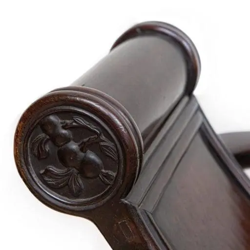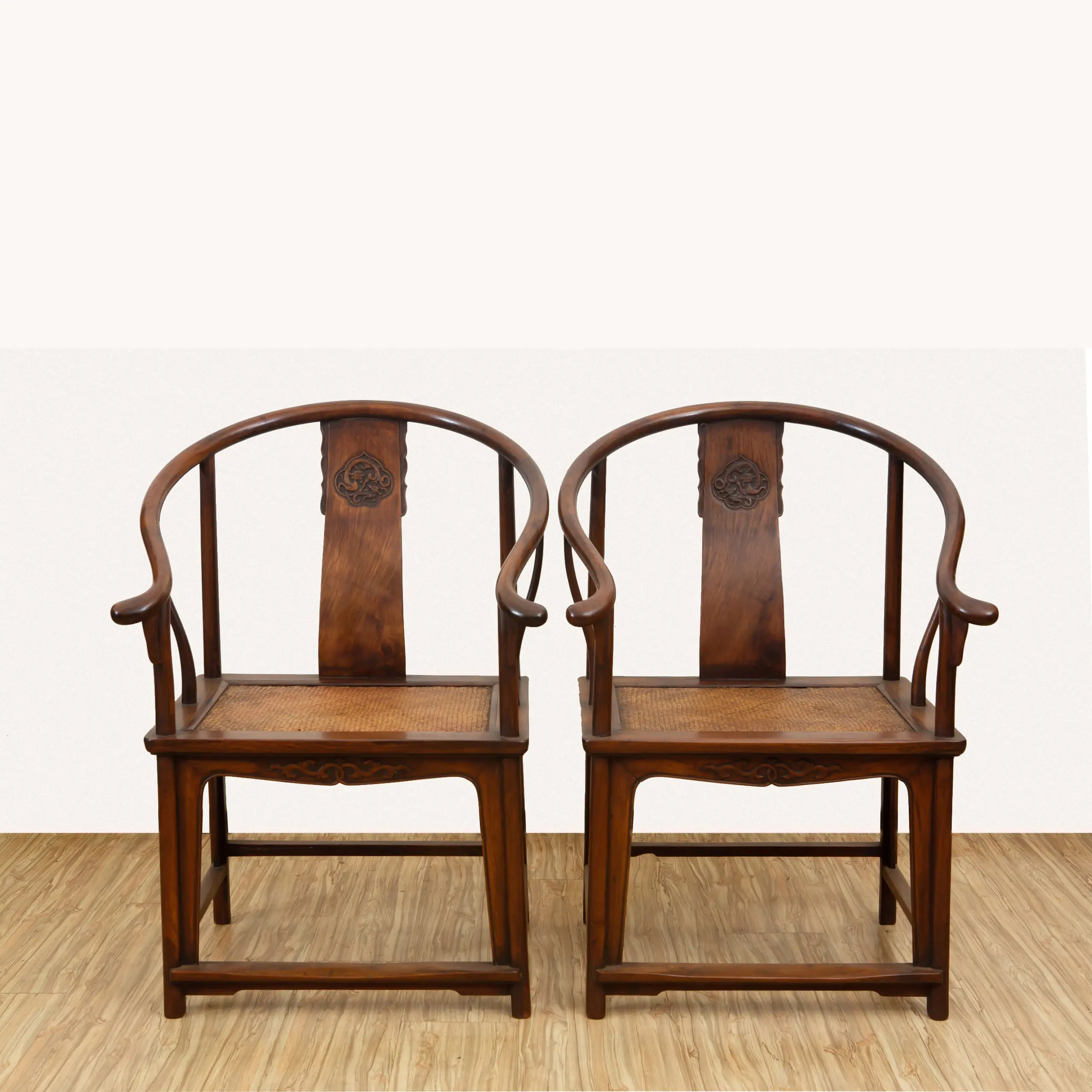 | Description | Horseshoe Backed Chairs: A fine pair of horseshoe back chairs, with gently sloped back splats, repousse carvings of two archaic dragons, twirly vines on the front aprons. |