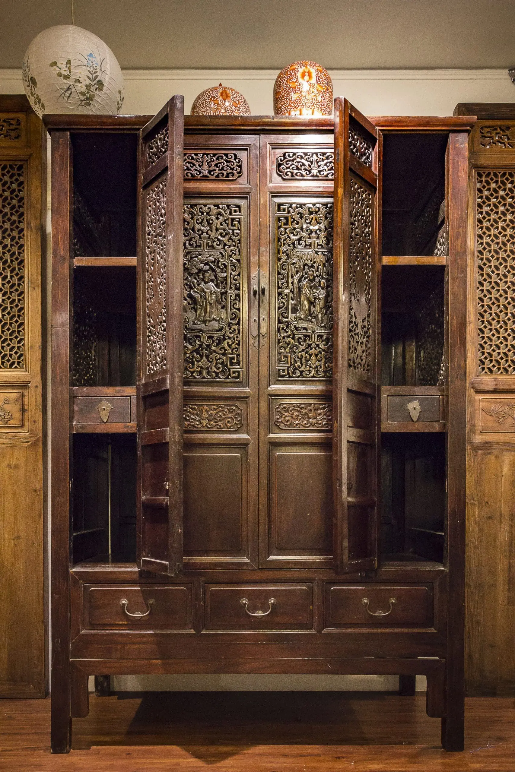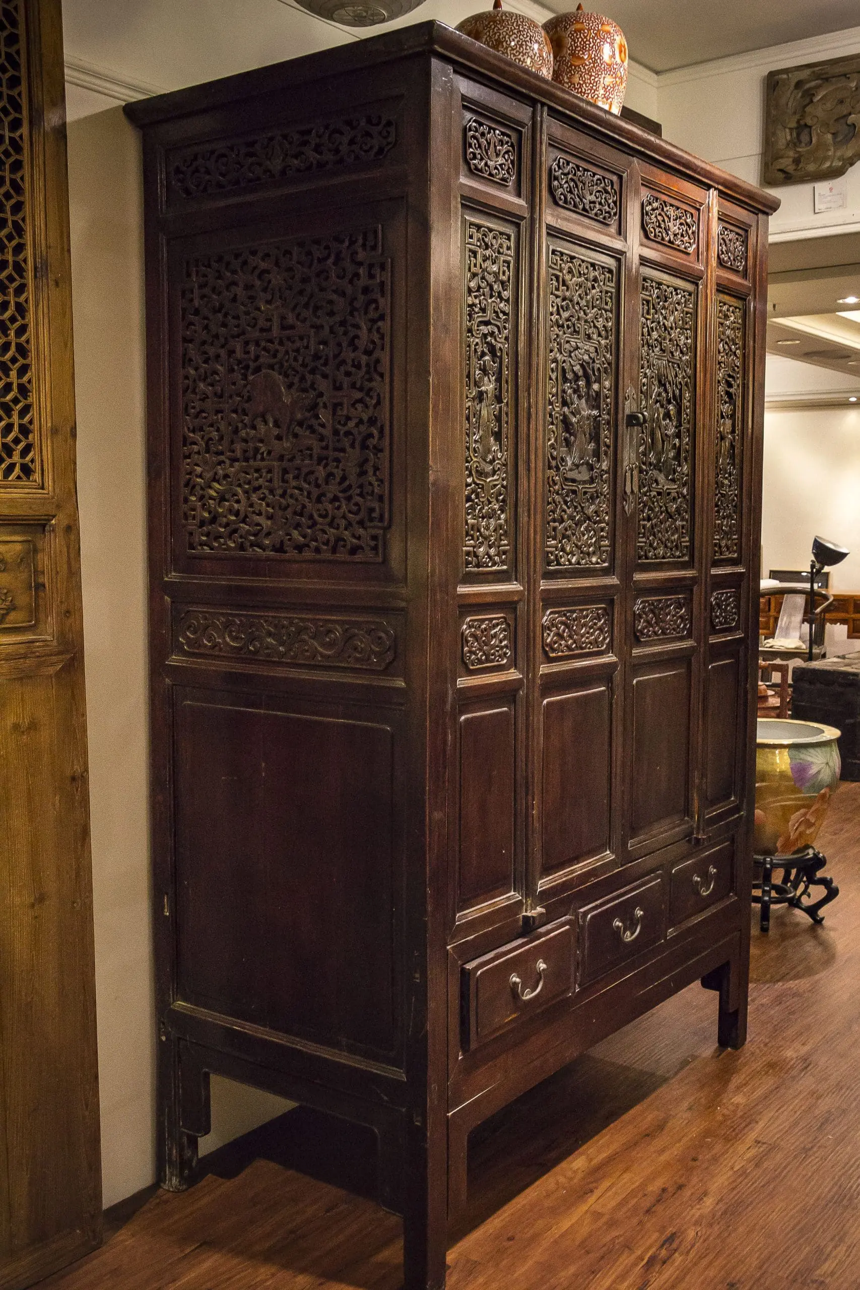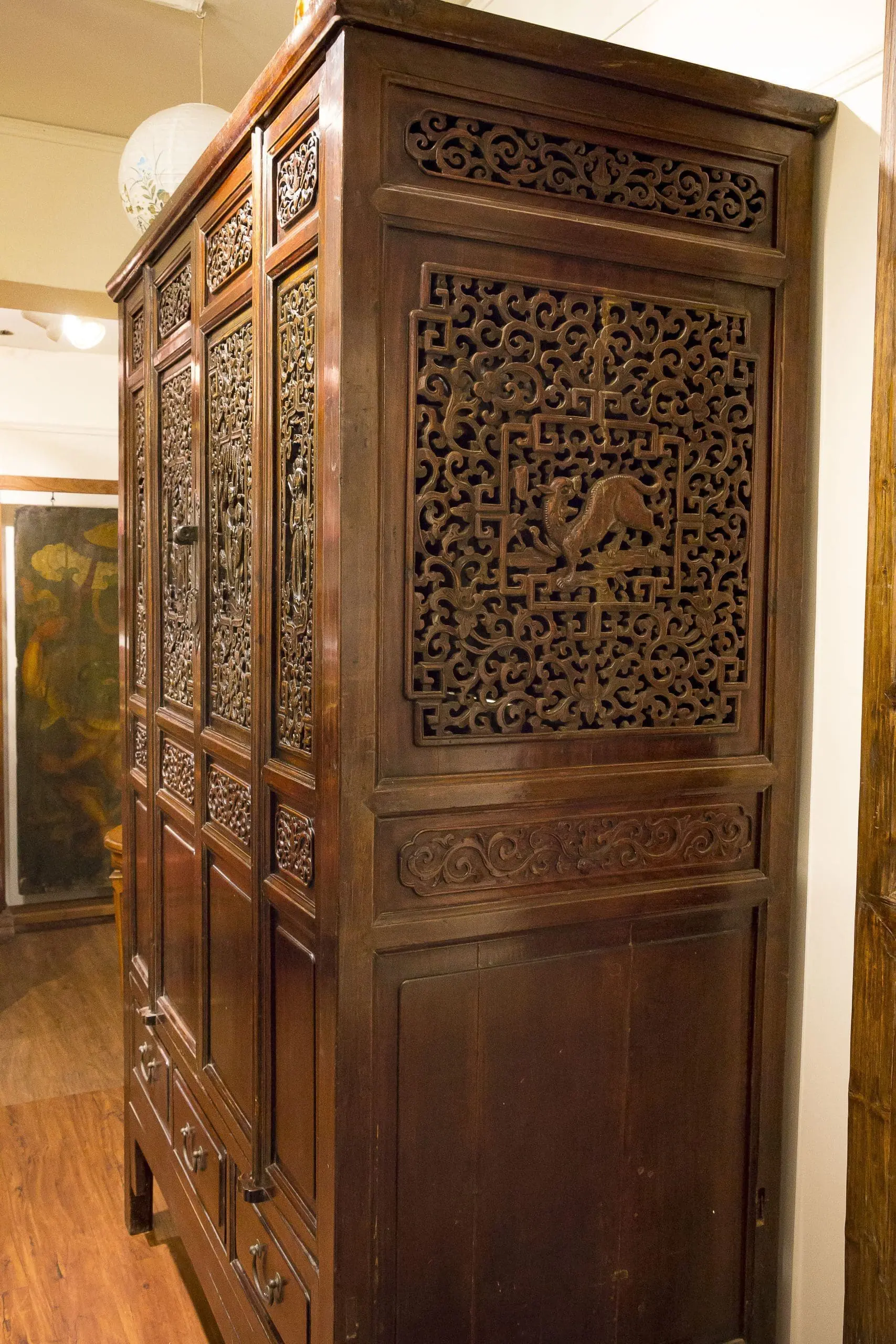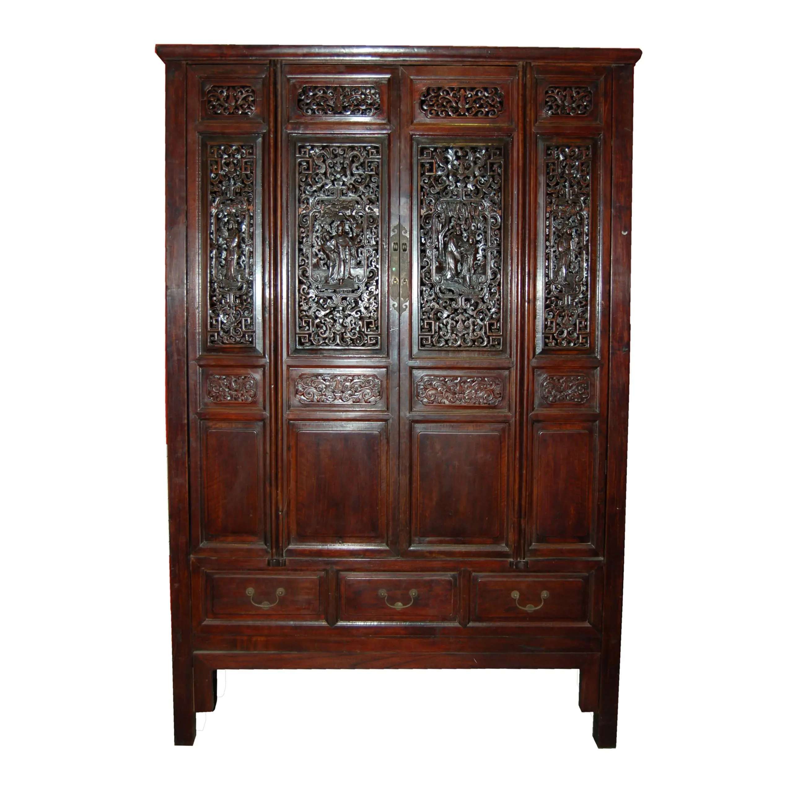 | Description | A large and elaborately carved cabinet with 4 removable doors. 3 drawers below. shelves and drawers inside. well executed carvings of courting scenes and a beautiful woman surrounded by lotus. Key and other floral designs with carvings of unicorns and floral relief on the side. original dark brown / black lacquer. |
