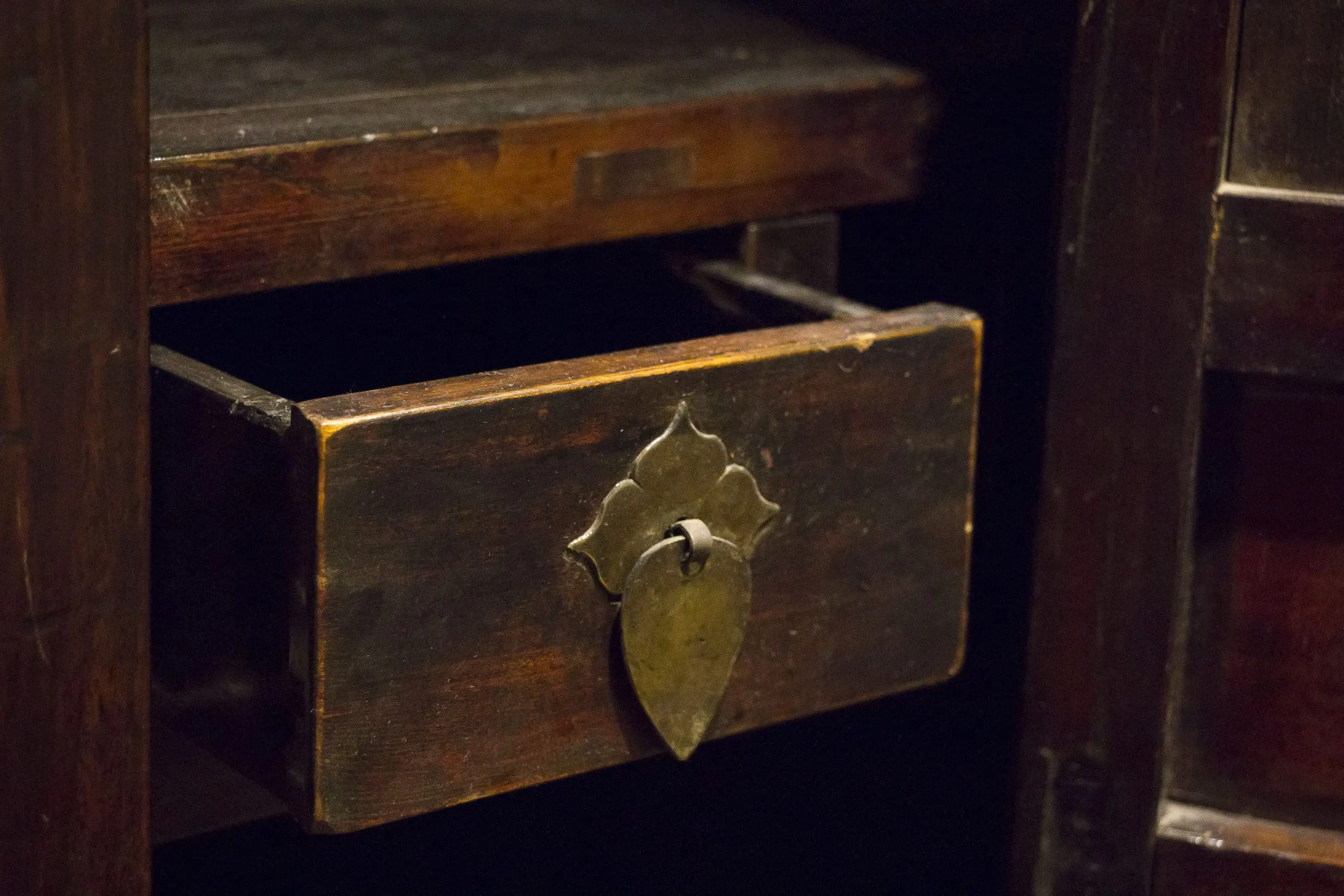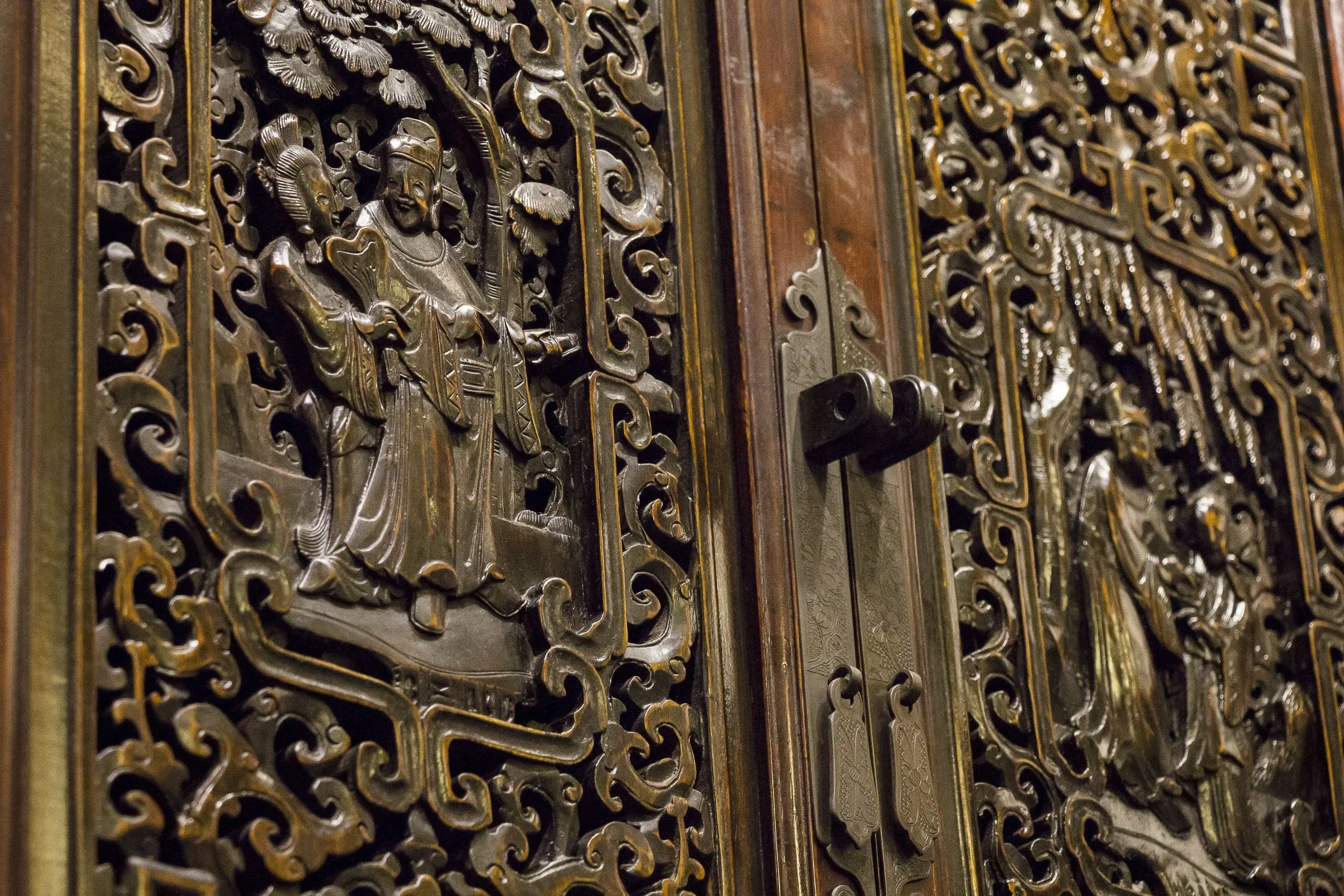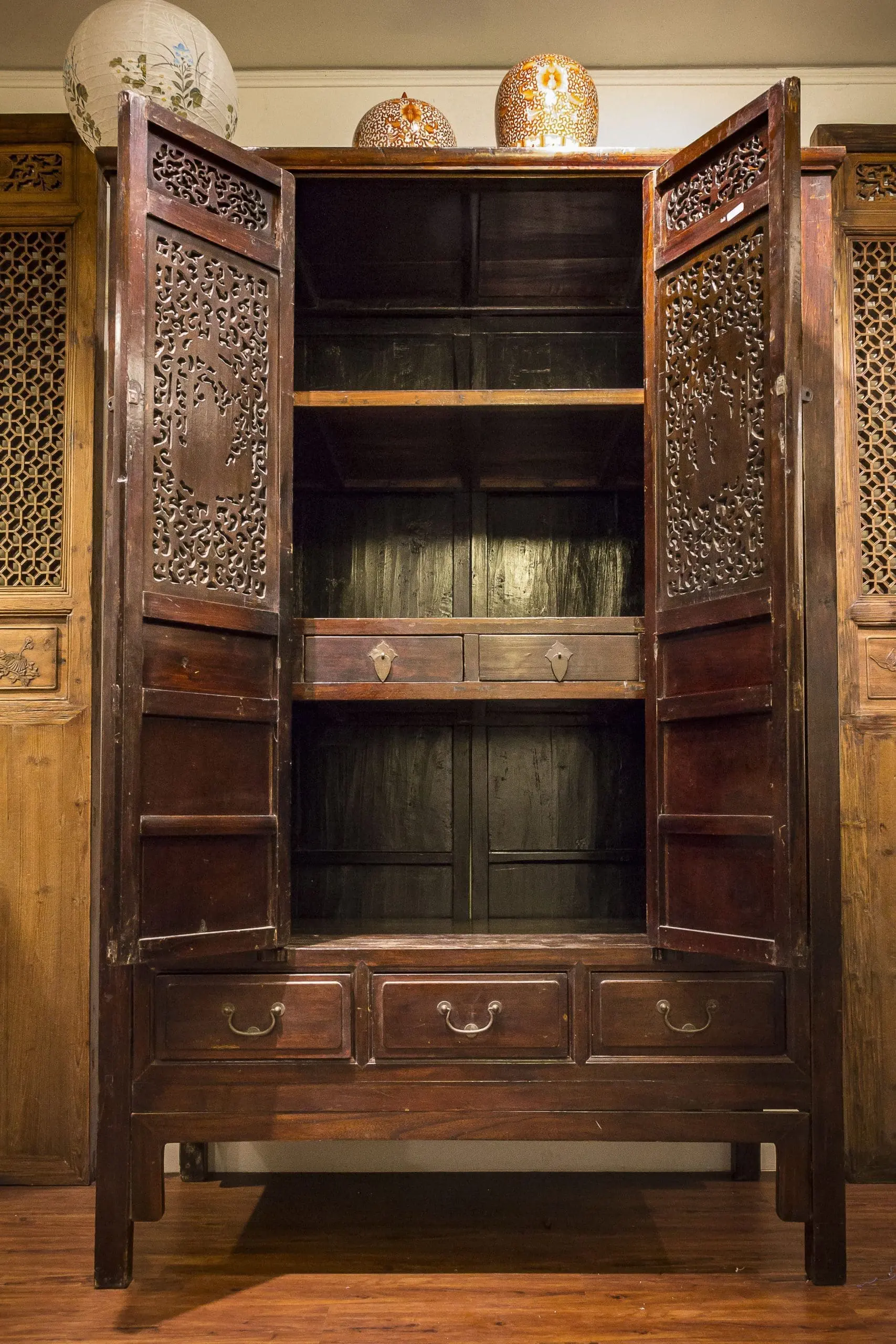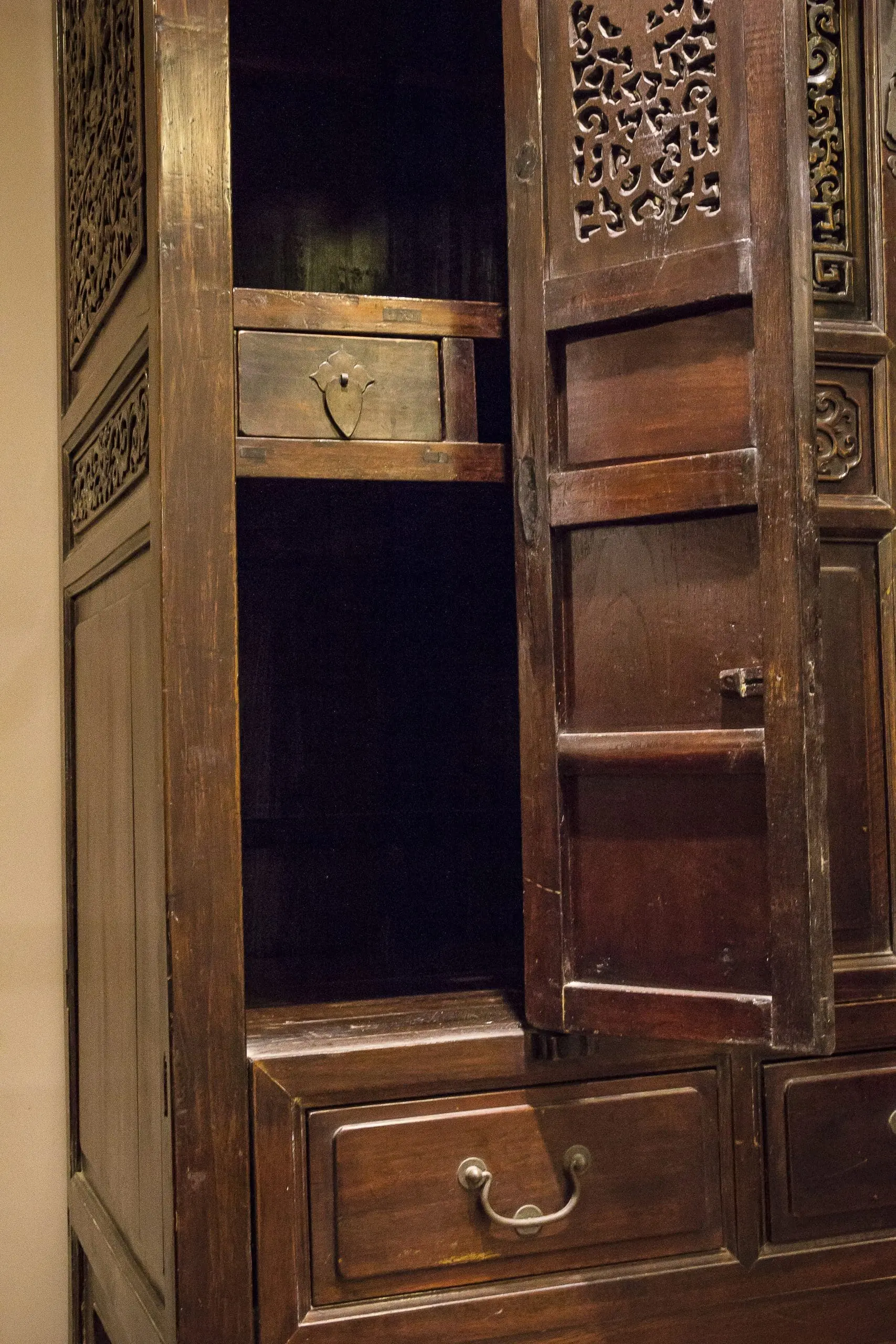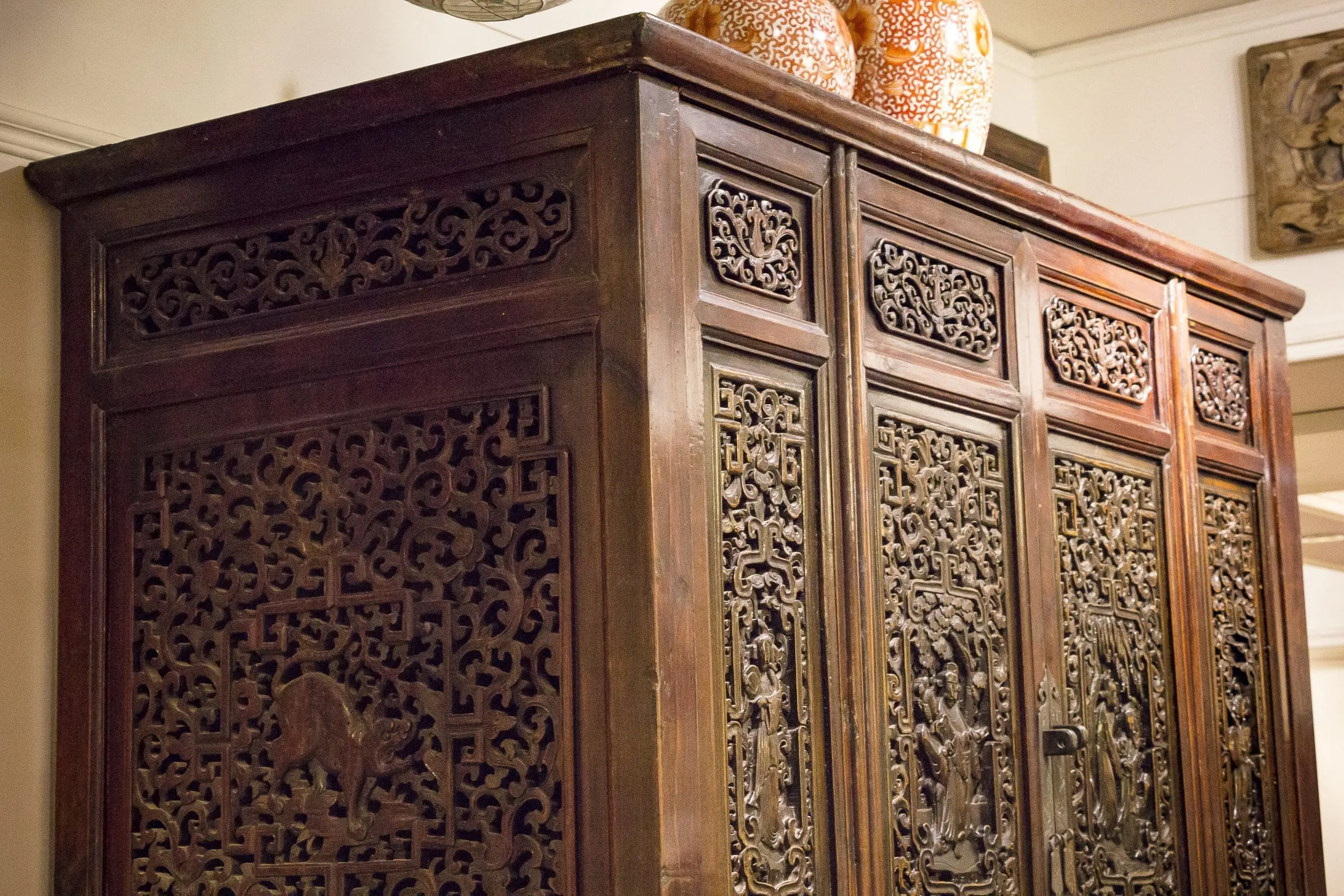 | Description | A large and elaborately carved cabinet with 4 removable doors. 3 drawers below. shelves and drawers inside. well executed carvings of courting scenes and a beautiful woman surrounded by lotus. Key and other floral designs with carvings of unicorns and floral relief on the side. original dark brown / black lacquer. |