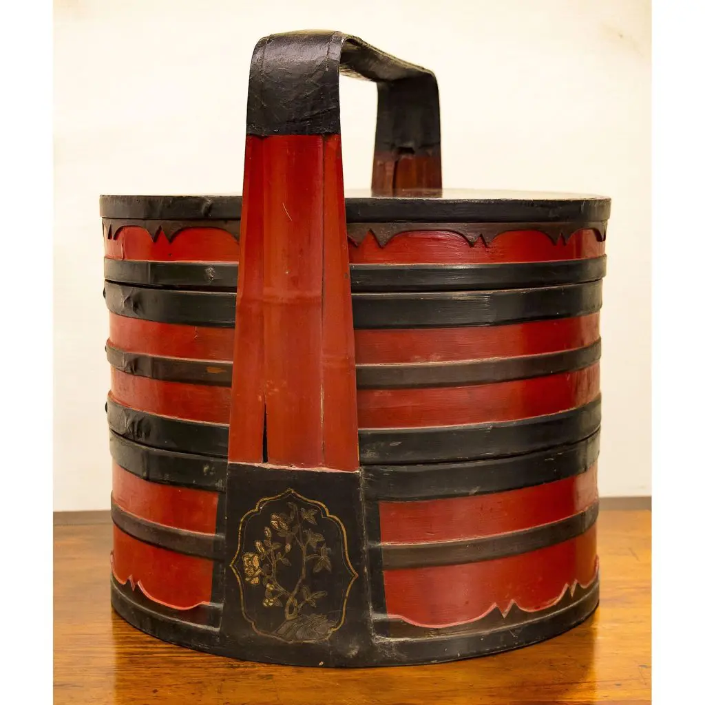 | Description | A round wooden tiered offering basket richly lacquered in red and black with gilt decoration. The lid and sides feature delicately painted court scenes and floral motifs, framed by scalloped borders. The sturdy handle rises from tapered supports. |