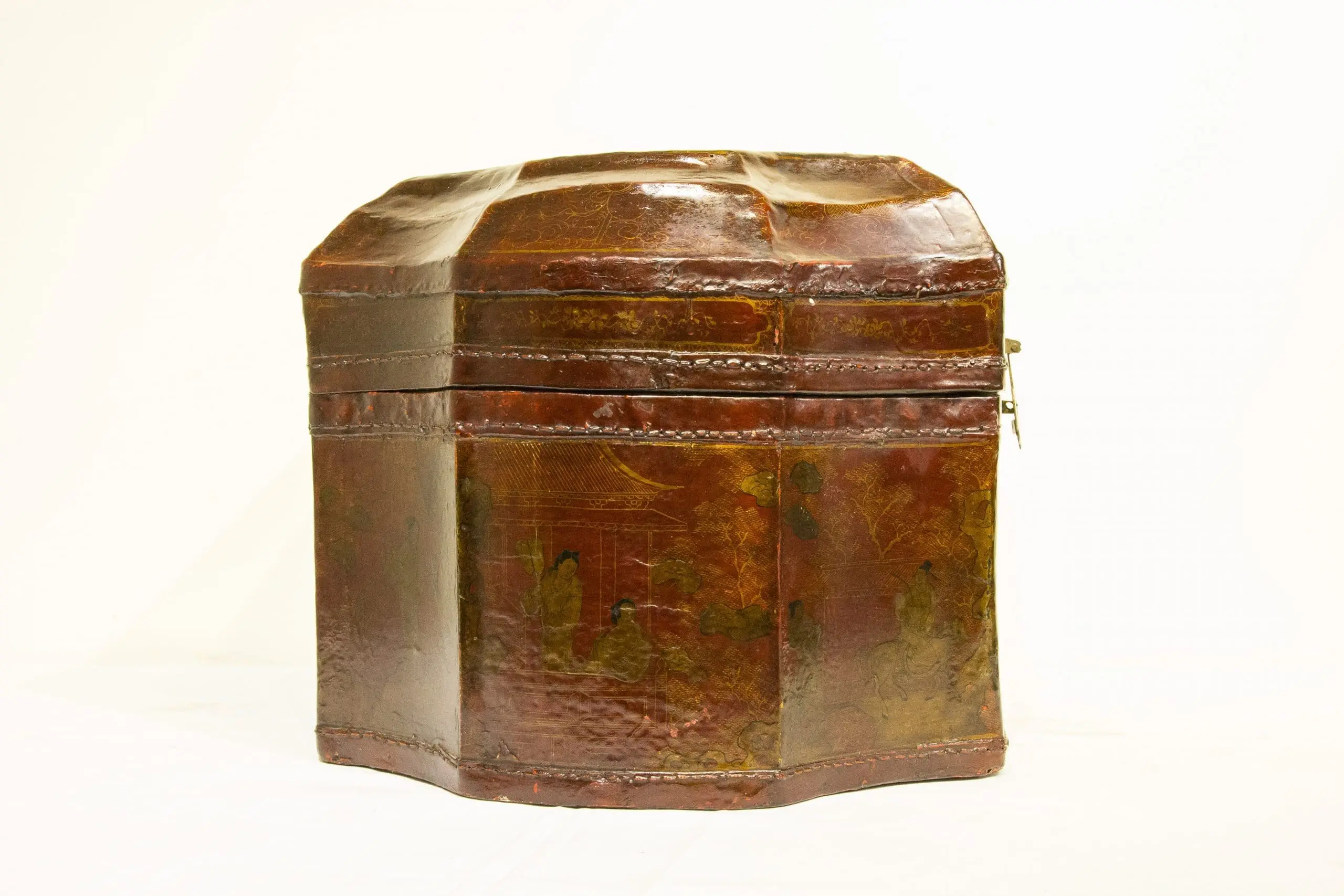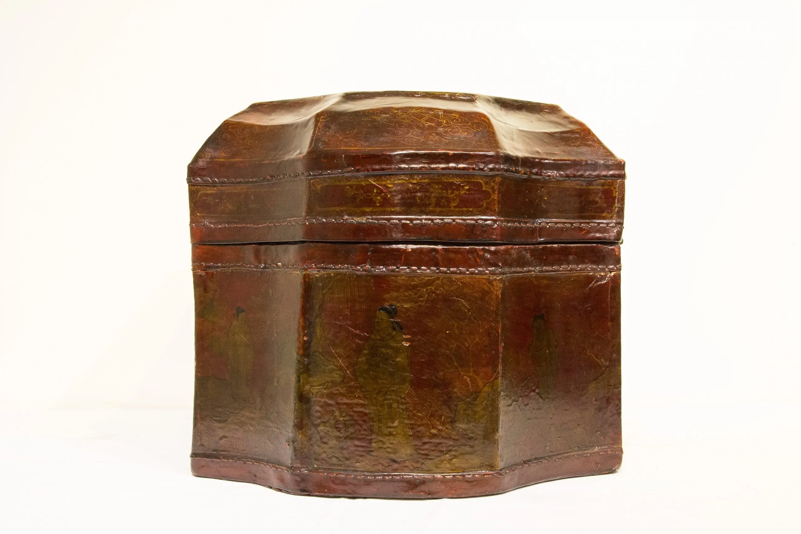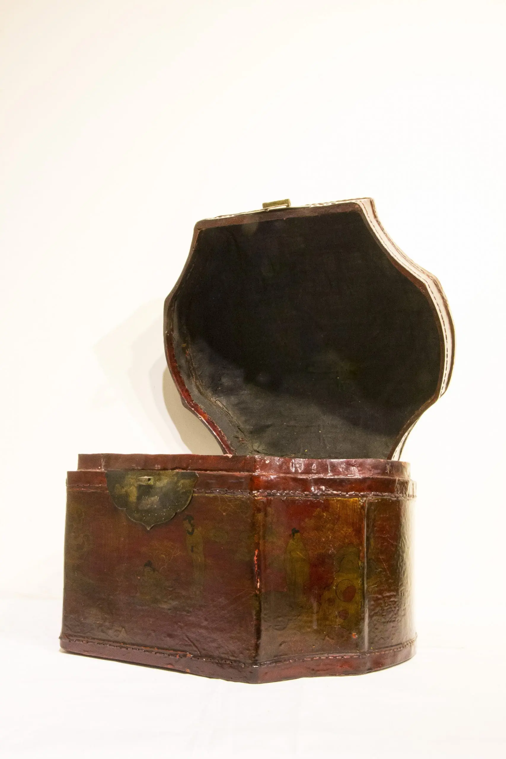| Description | Pleasantly shaped leather hat box with faded but well-executed gold gilt paintings on front and sides. the lid has a scene of two women sitting at a table. |