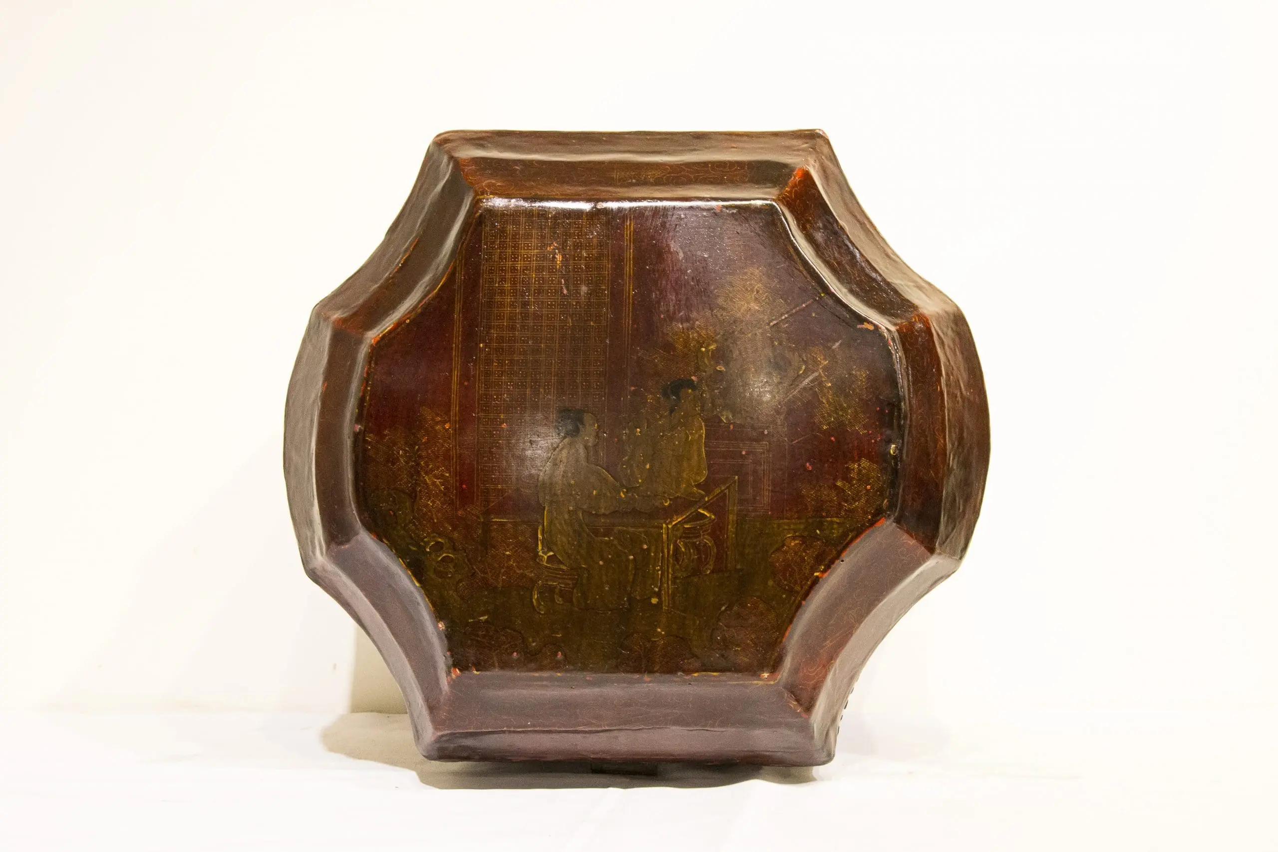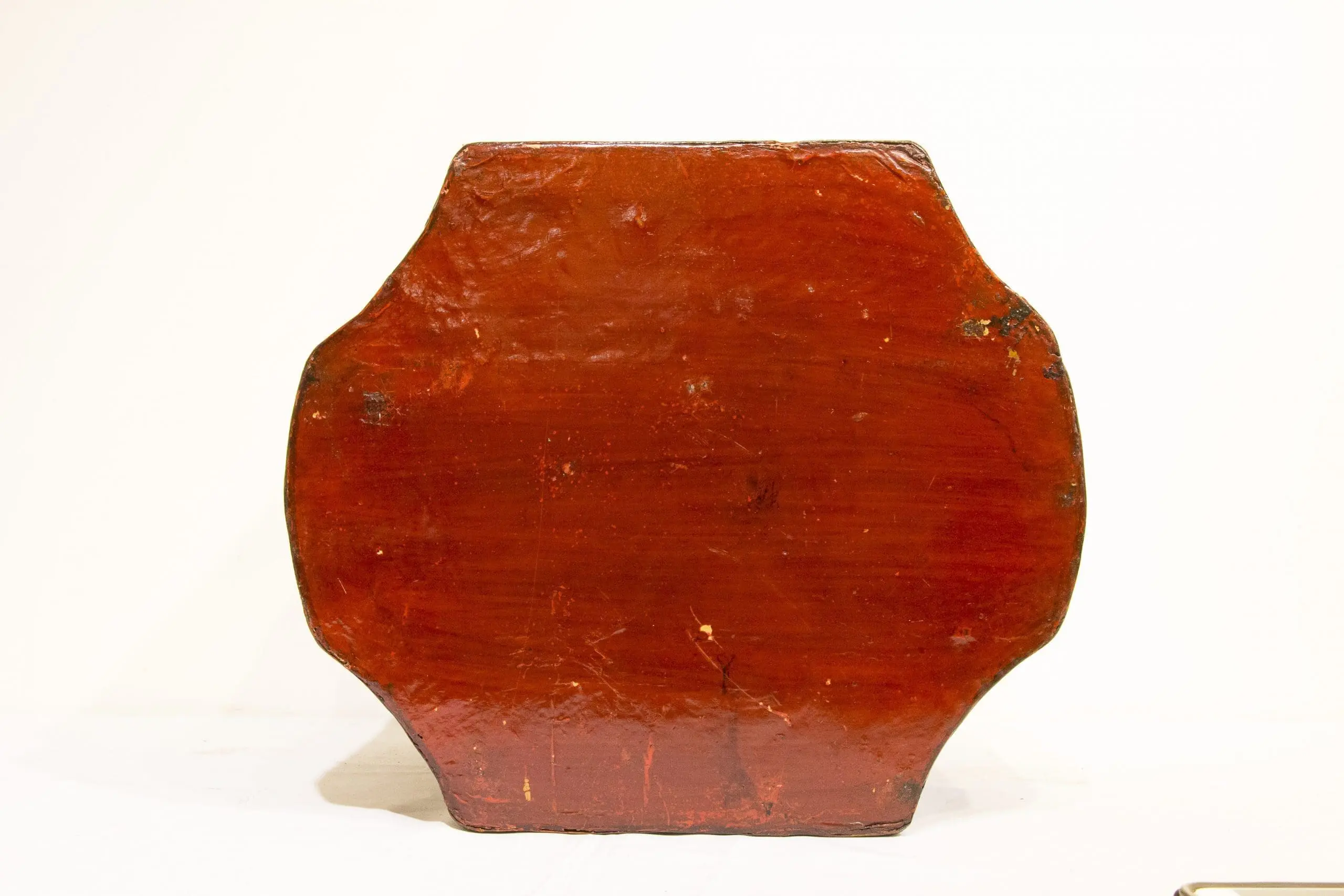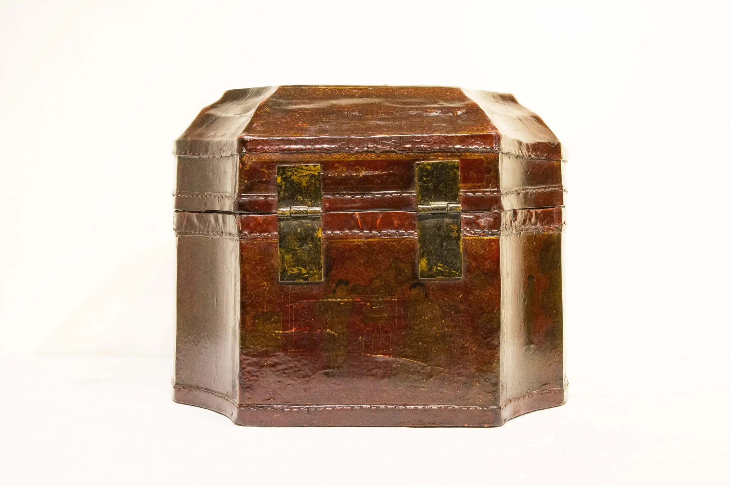 | Description | Pleasantly shaped leather hat box with faded but well-executed gold gilt paintings on front and sides. the lid has a scene of two women sitting at a table. |