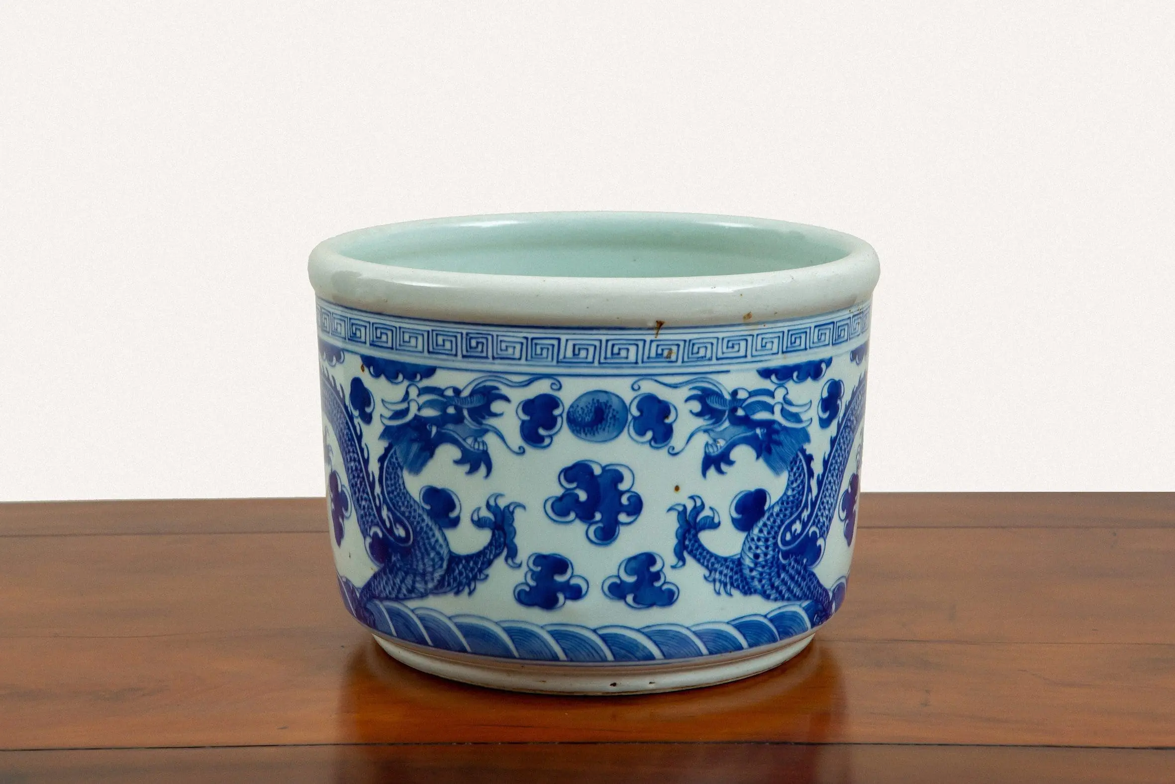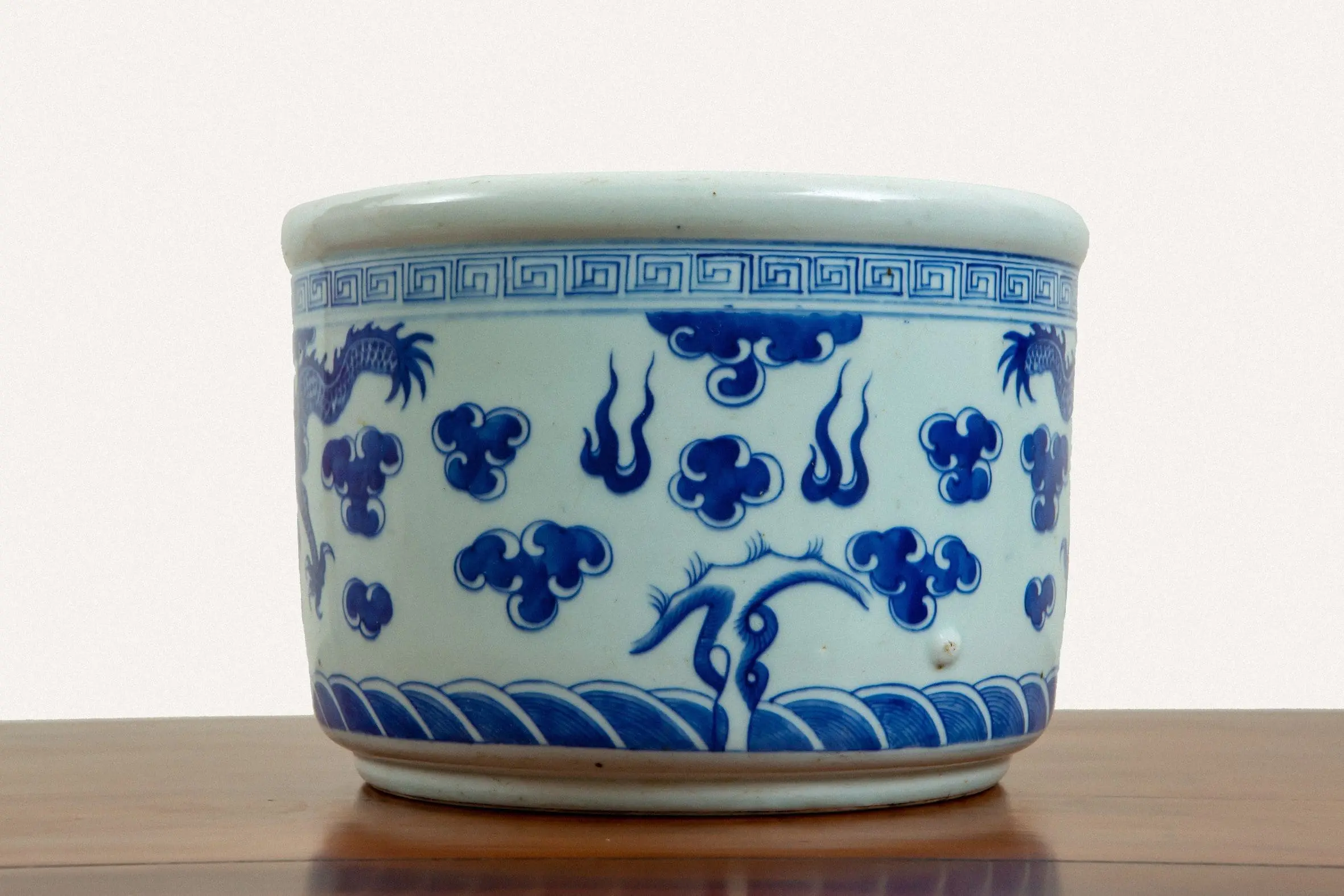 | Description | Large brush pot with underglaze paintings of blue dragons chasing a pearl amidst waves and clouds with a geometric pattern above. |