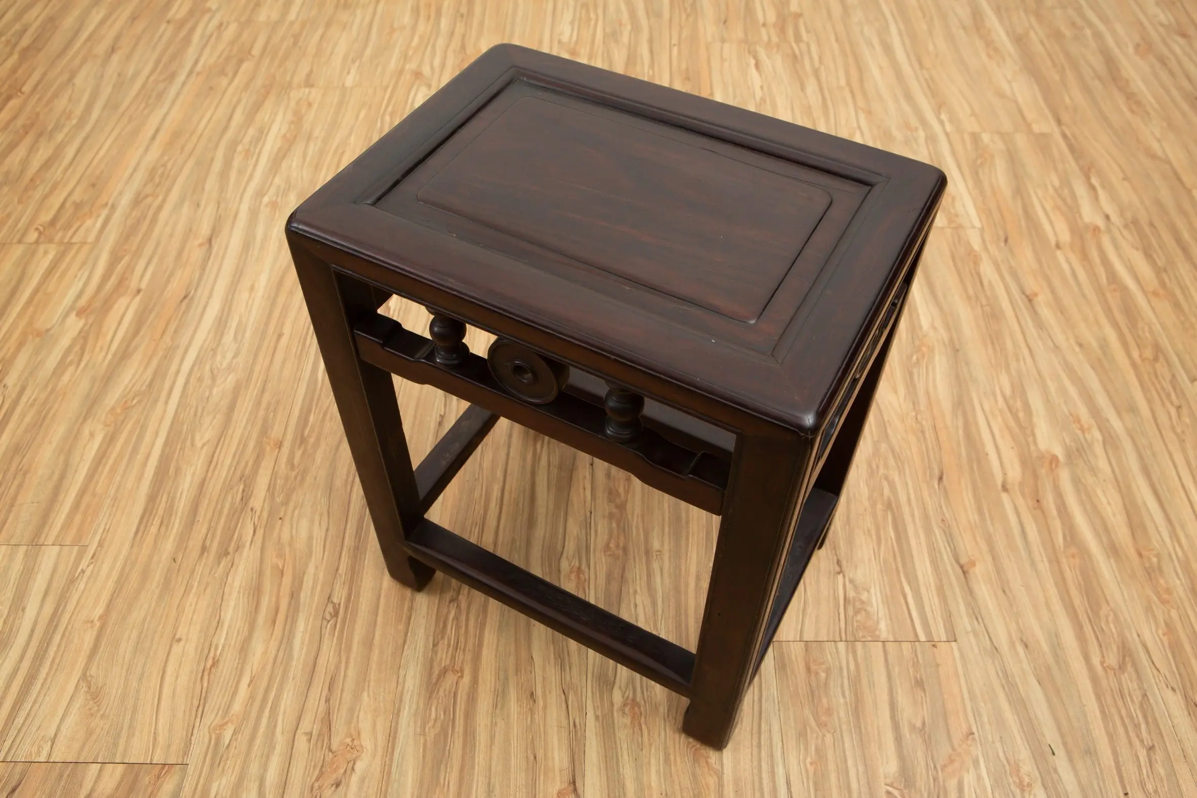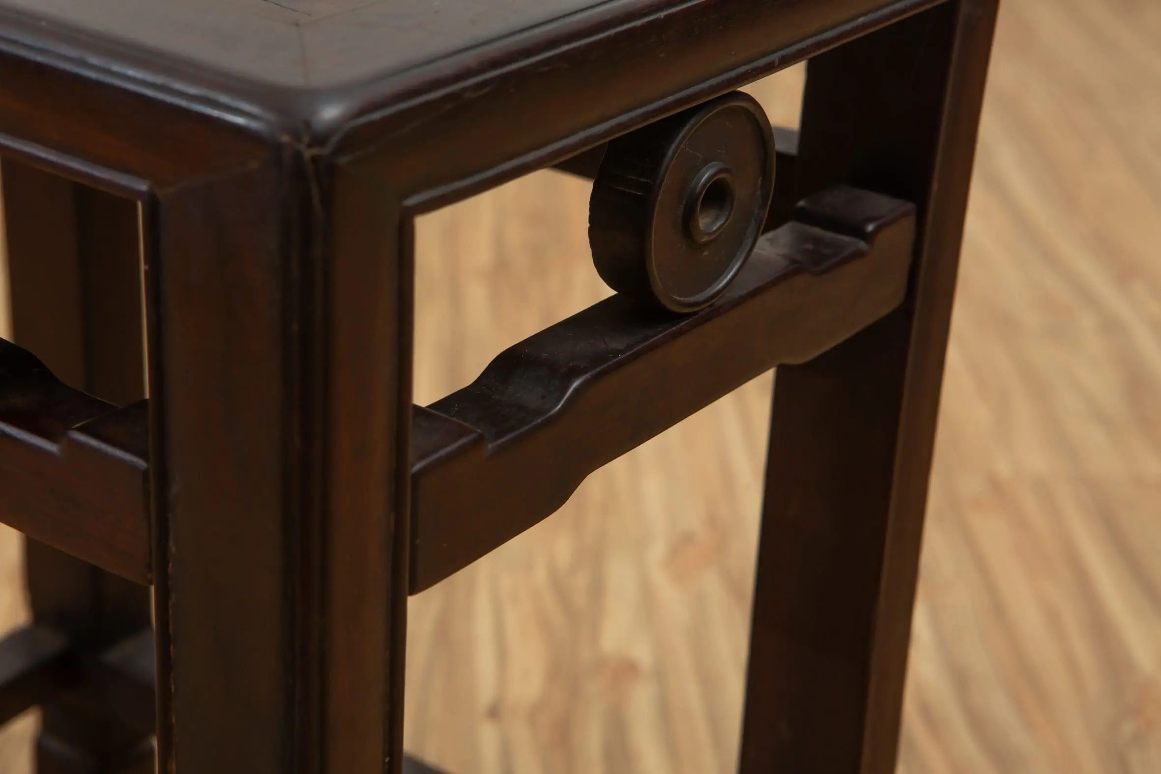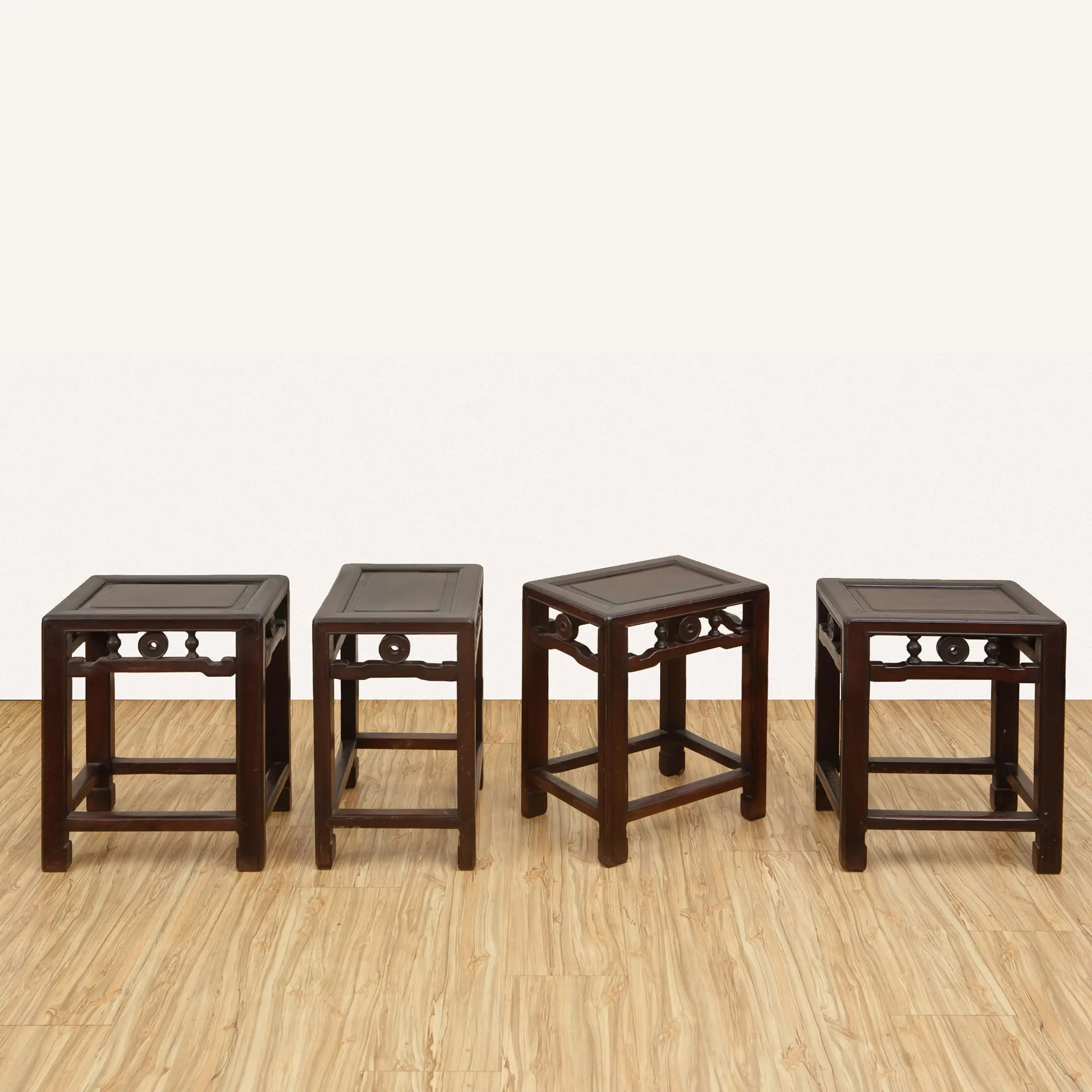 | Description | Set of four rosewood stools with medallions inset on the sides, recessed tops, lower stretchers serving as foot rests, and modified hoof feet. |