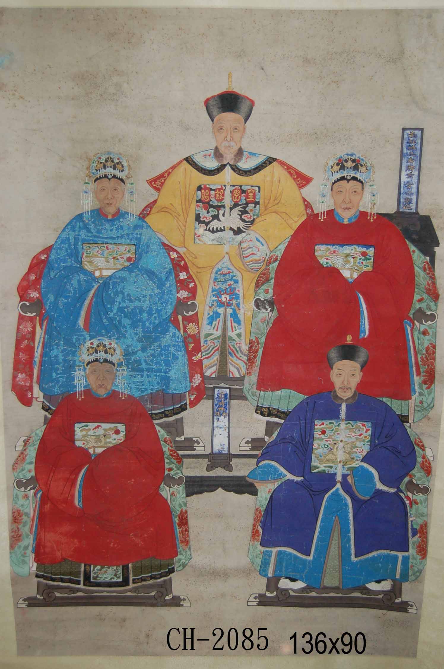 | Description | Qing Dynasty portrait: patriarch in gold, flanked by wives and sons. Bird badges signify civil ranks. Ornate attire and memorial tablet emphasize status and lineage. Formal poses and vivid colors reflect Confucian values and wealth. |