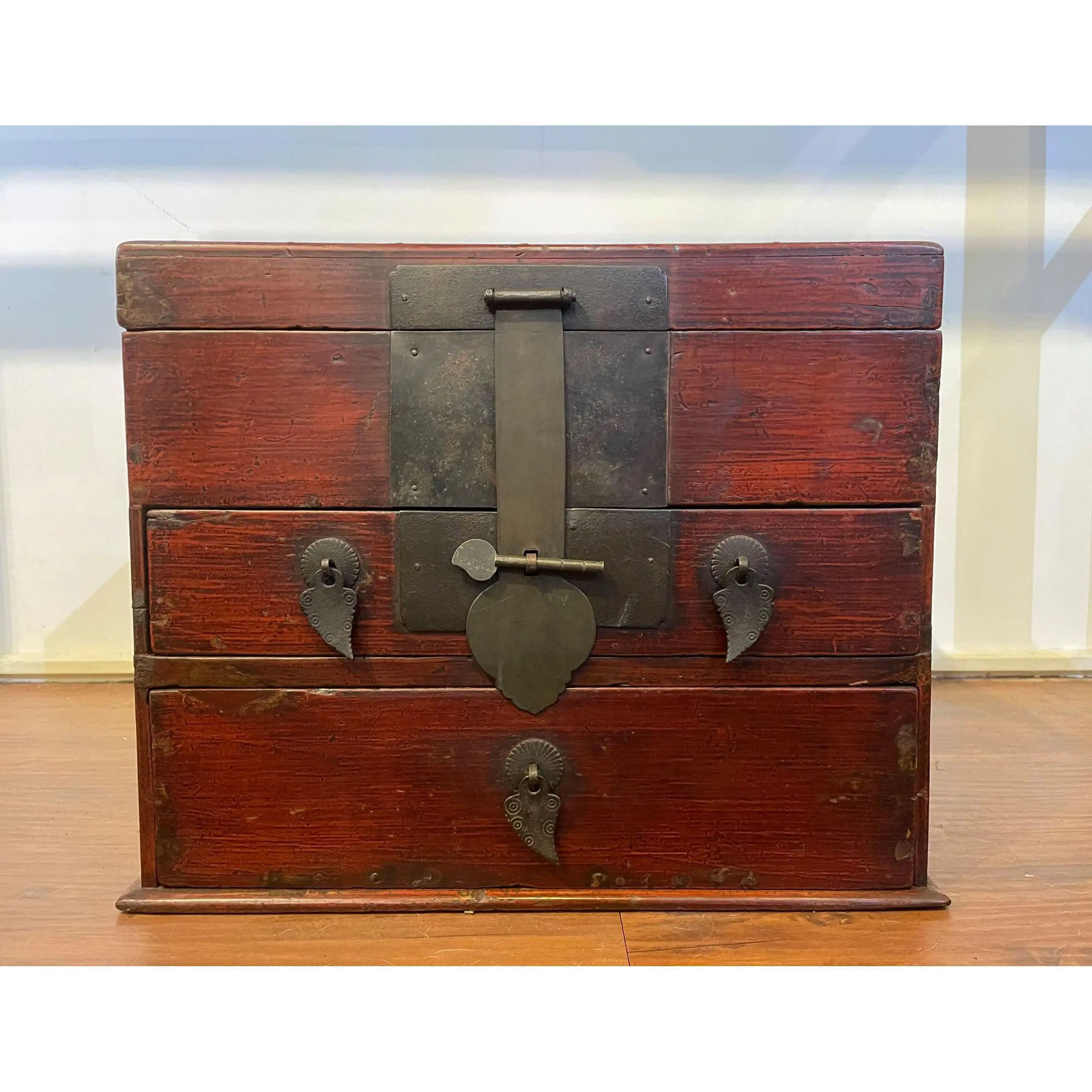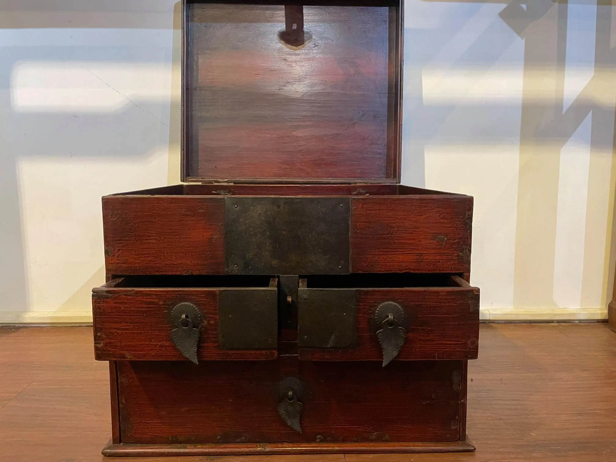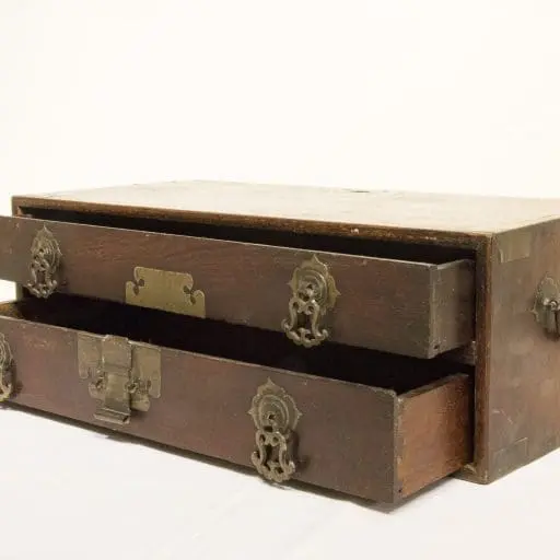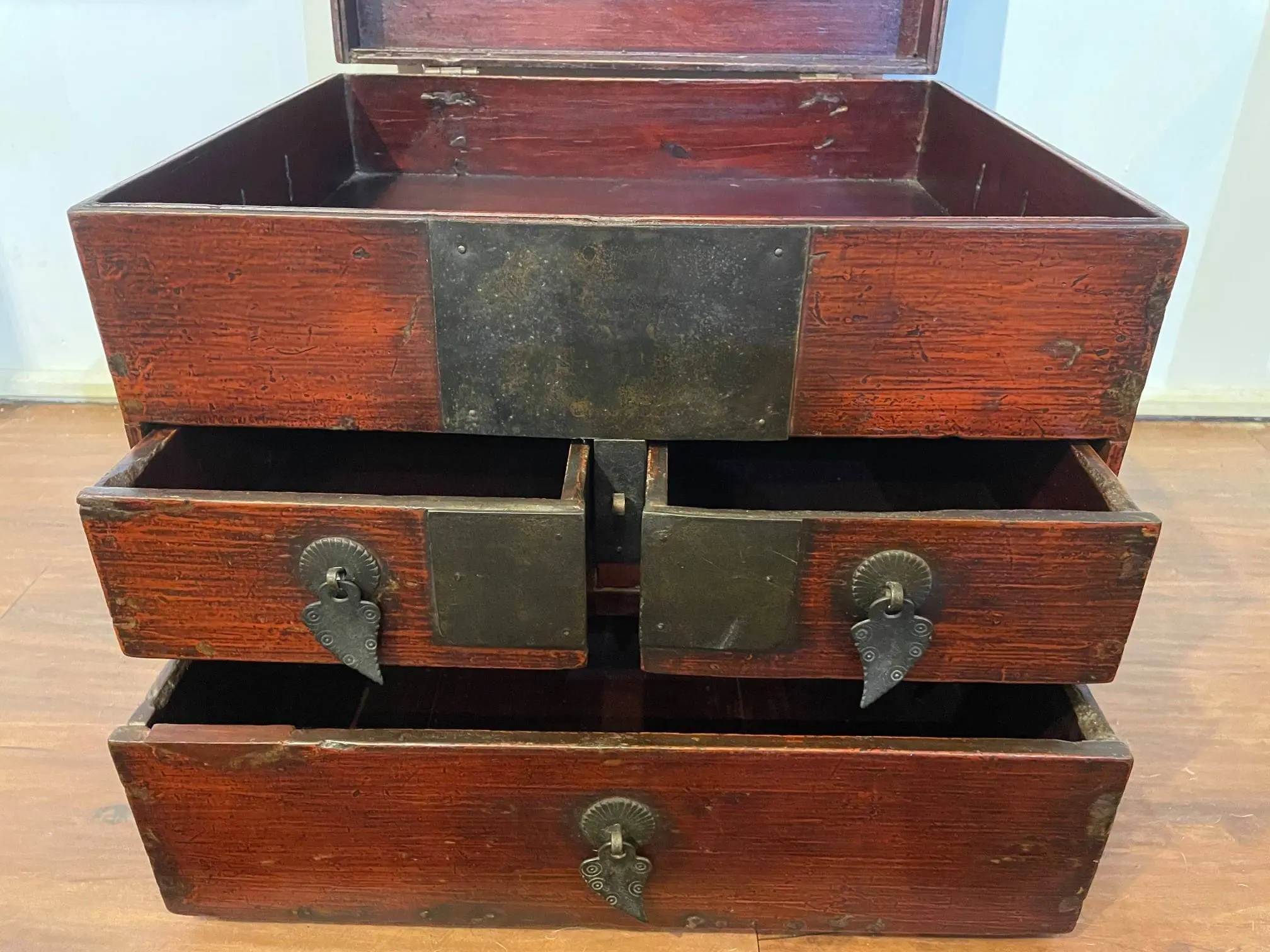 | Description | Large jewelry box with drawers front, brass hardware and long lock bar, top lifting |