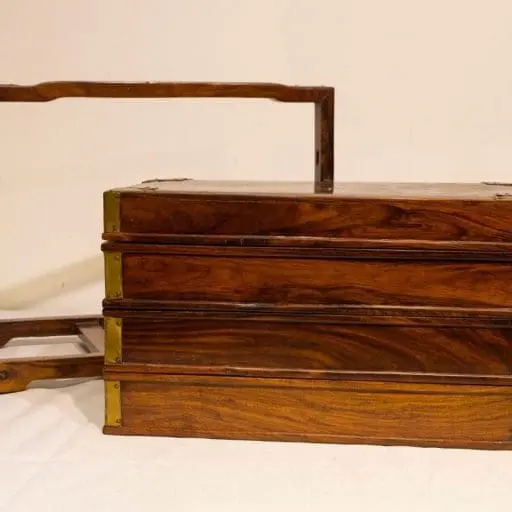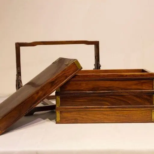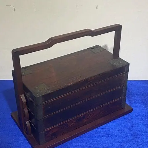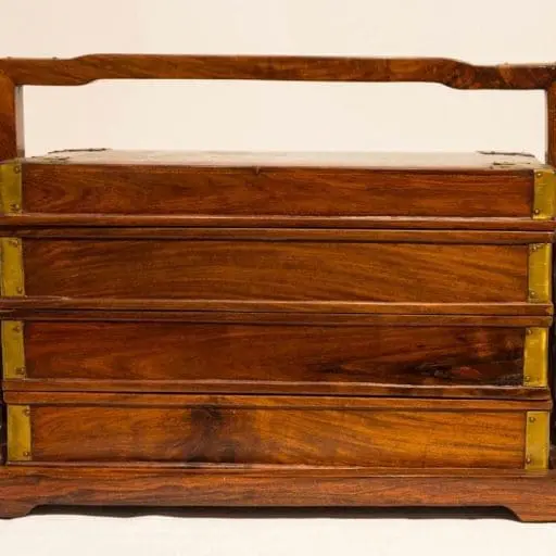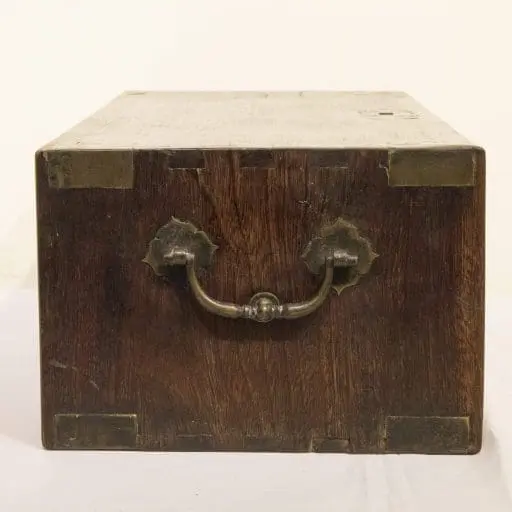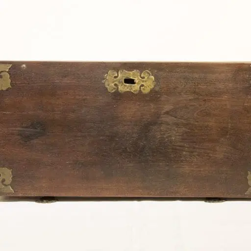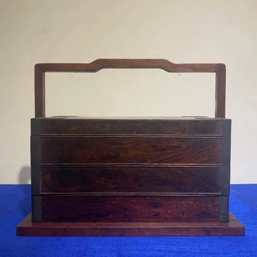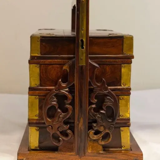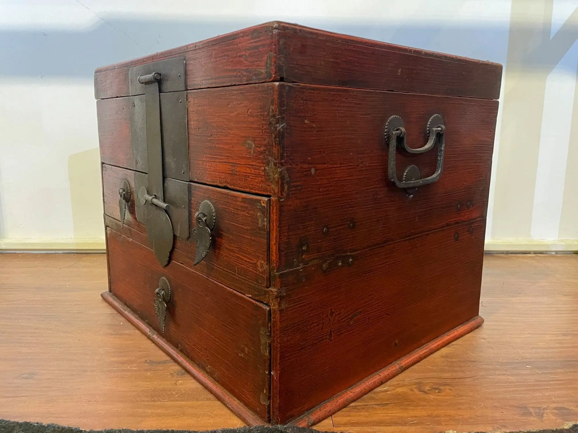 | Description | Large jewelry box with drawers front, brass hardware and long lock bar, top lifting |