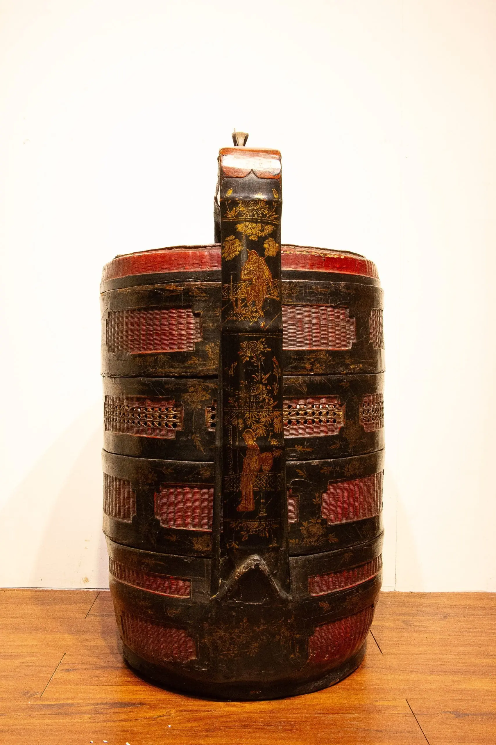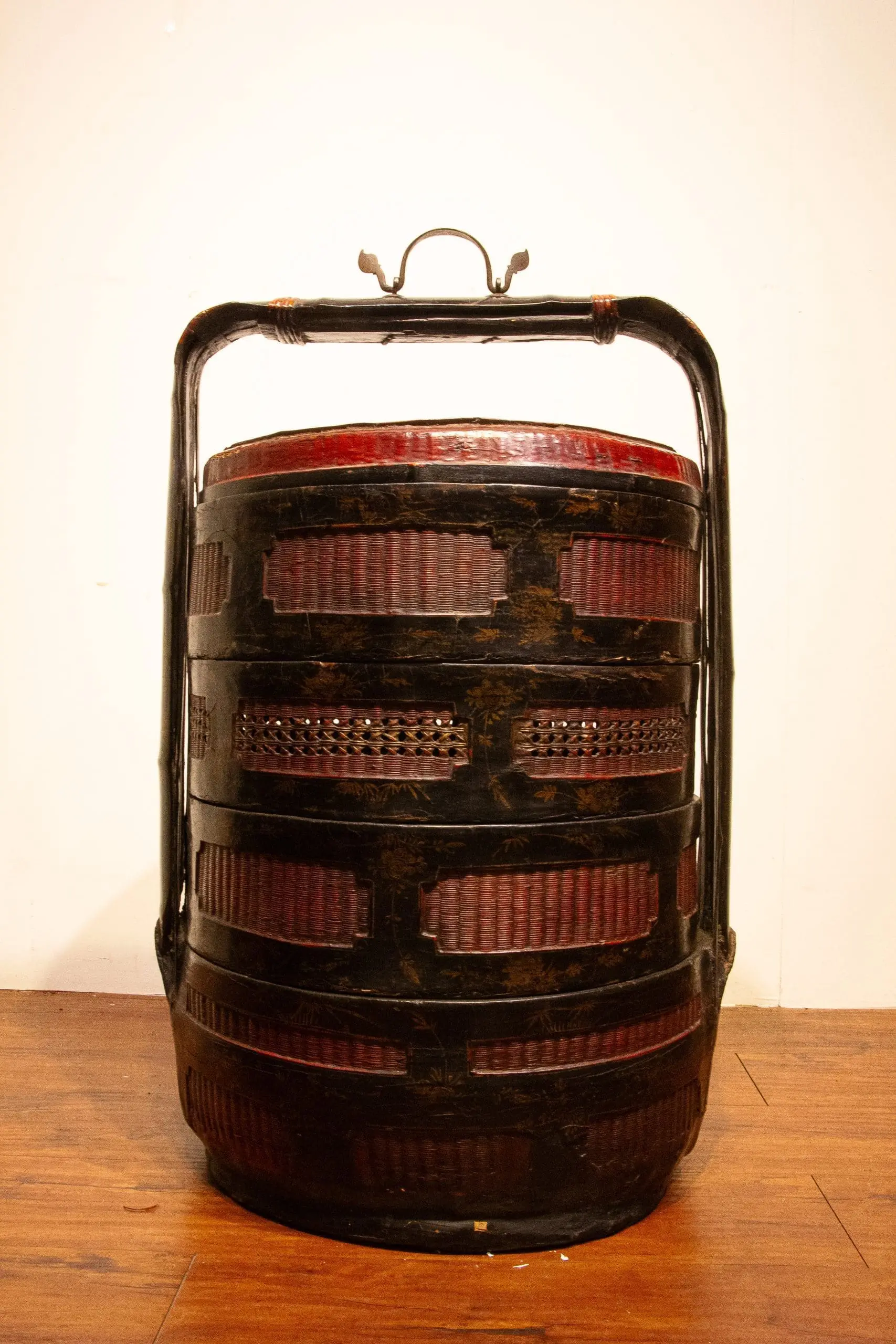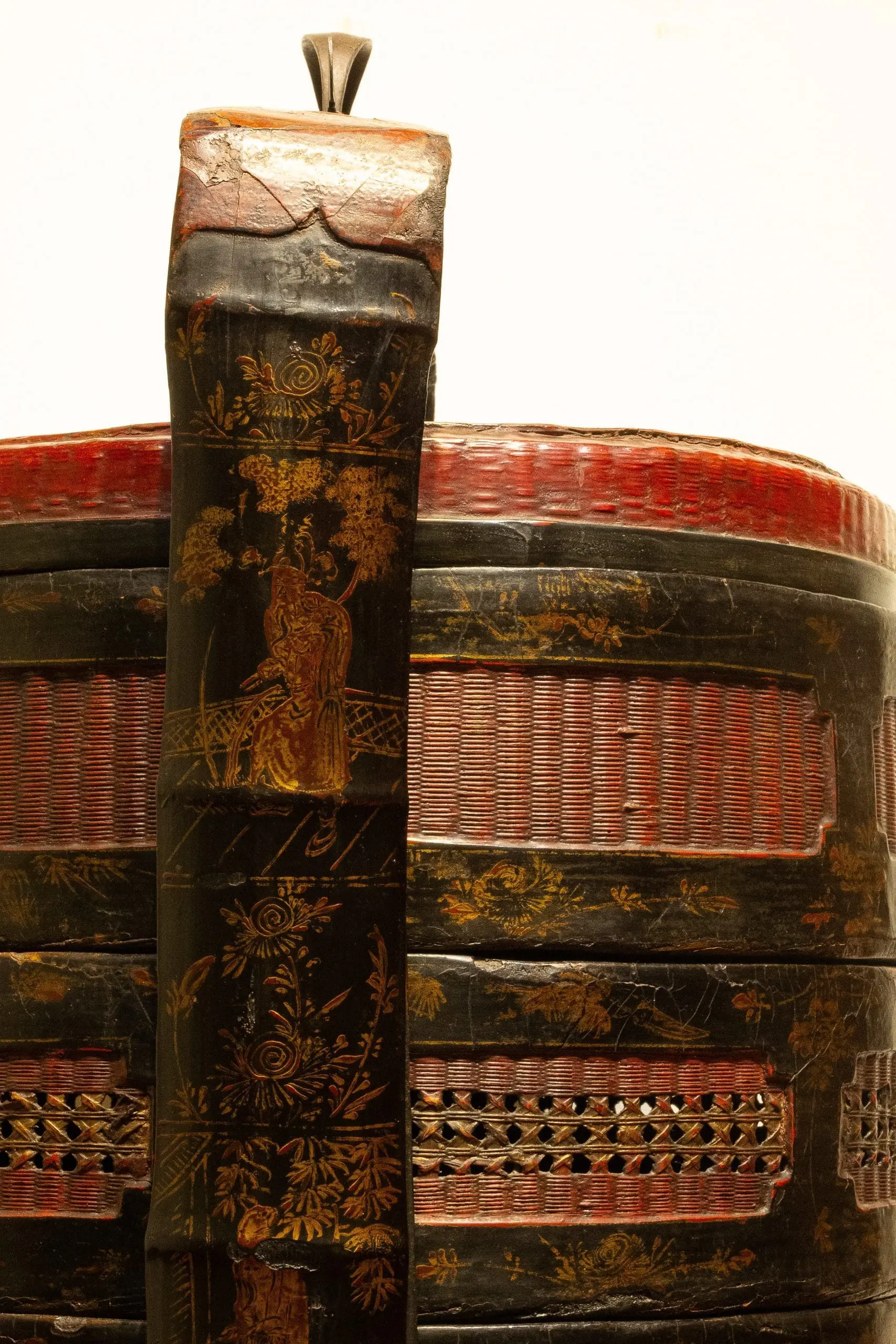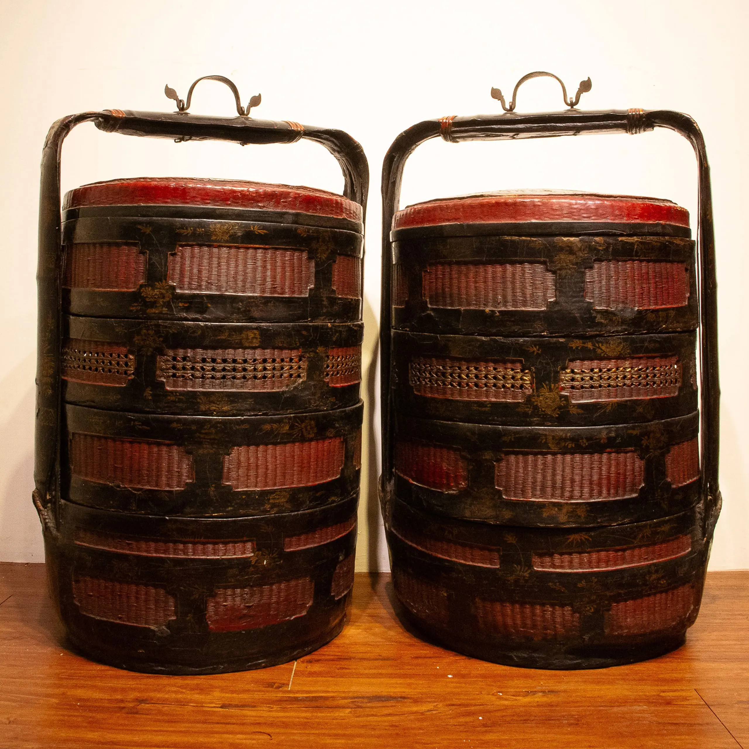 | Description | A very rare and unique pair of 4 tiered offering baskets of finely woven rattan with bamboo and handles with brass hardware, gilded paintings of couples, birds and flowers, on the lids and sides indicating that they might be wedding offering baskets. |