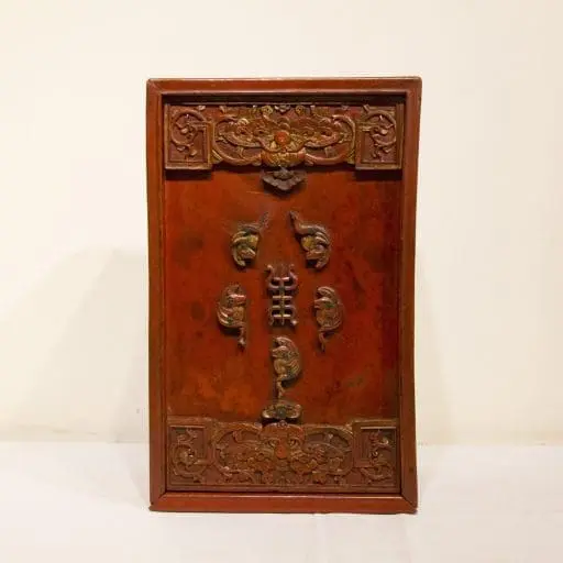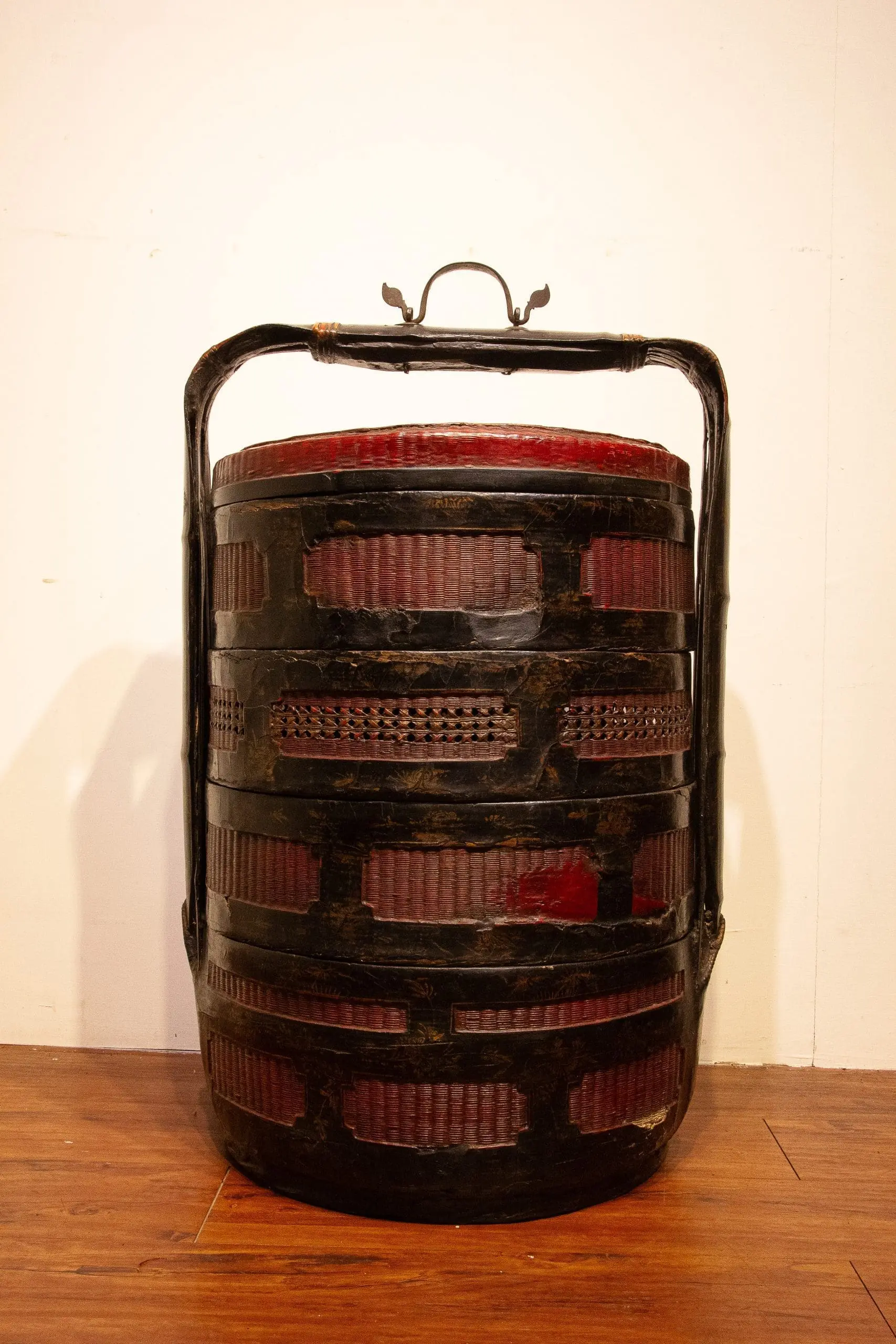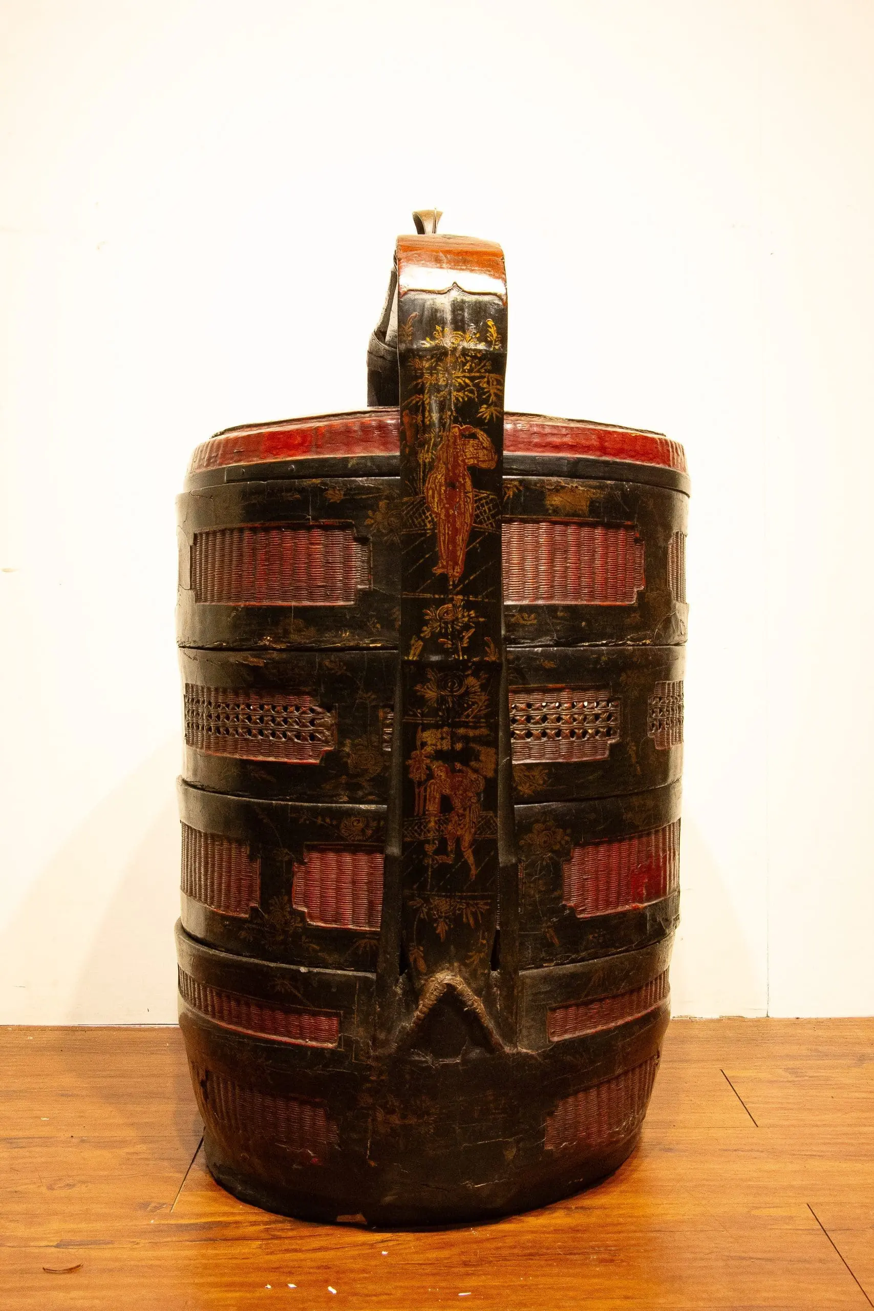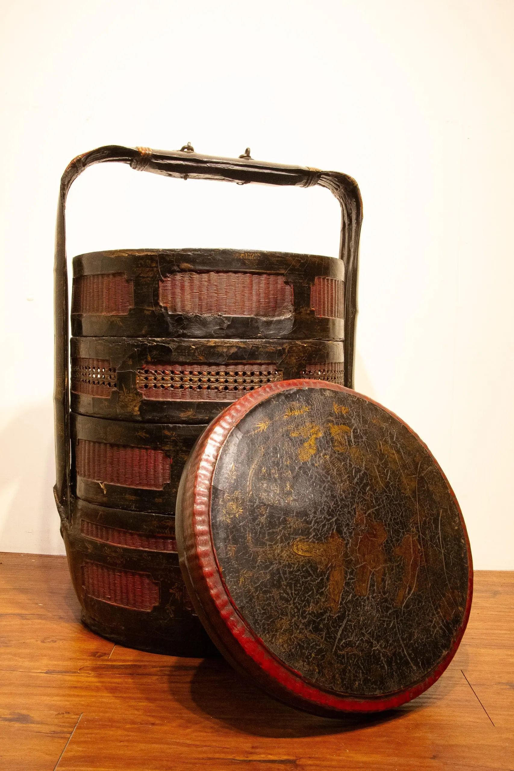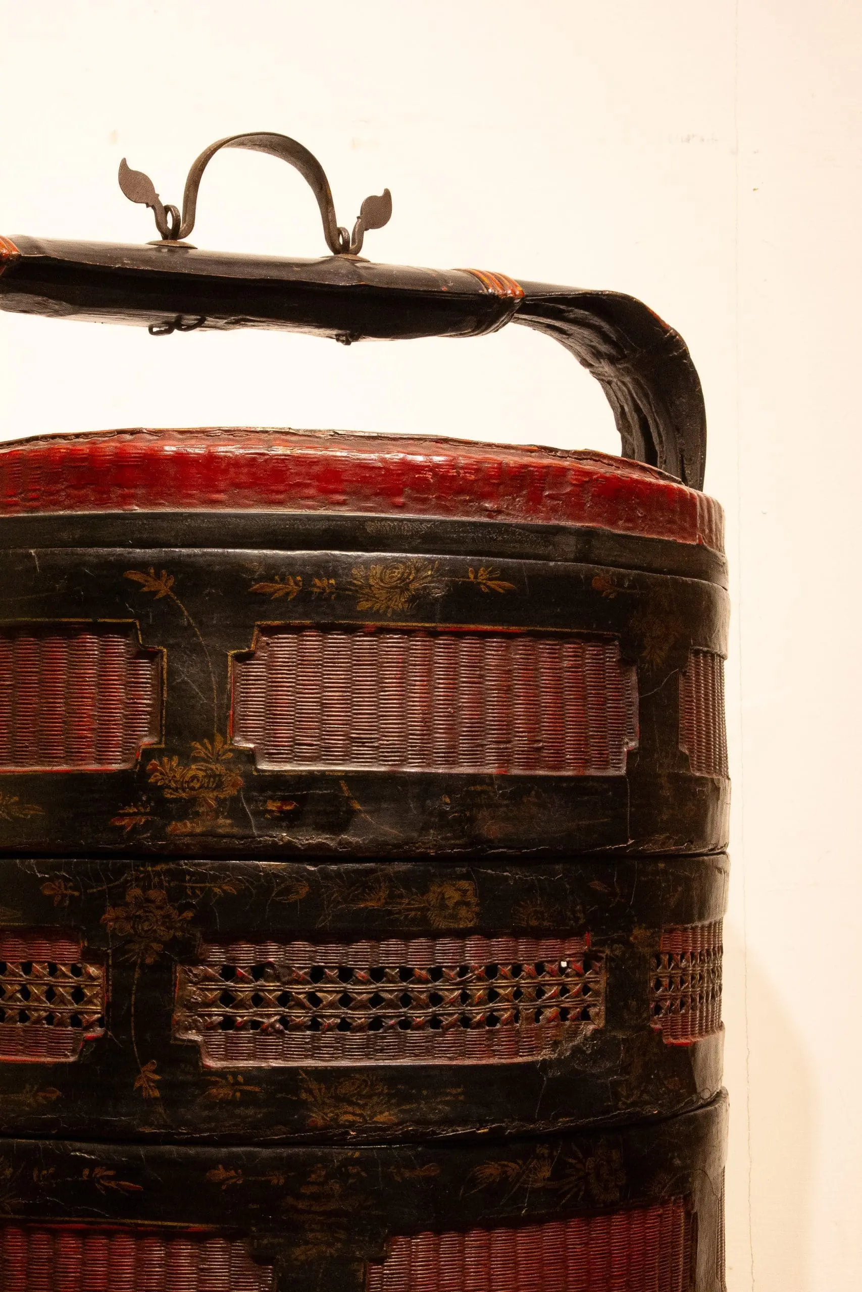 | Description | A very rare and unique pair of 4 tiered offering baskets of finely woven rattan with bamboo and handles with brass hardware, gilded paintings of couples, birds and flowers, on the lids and sides indicating that they might be wedding offering baskets. |