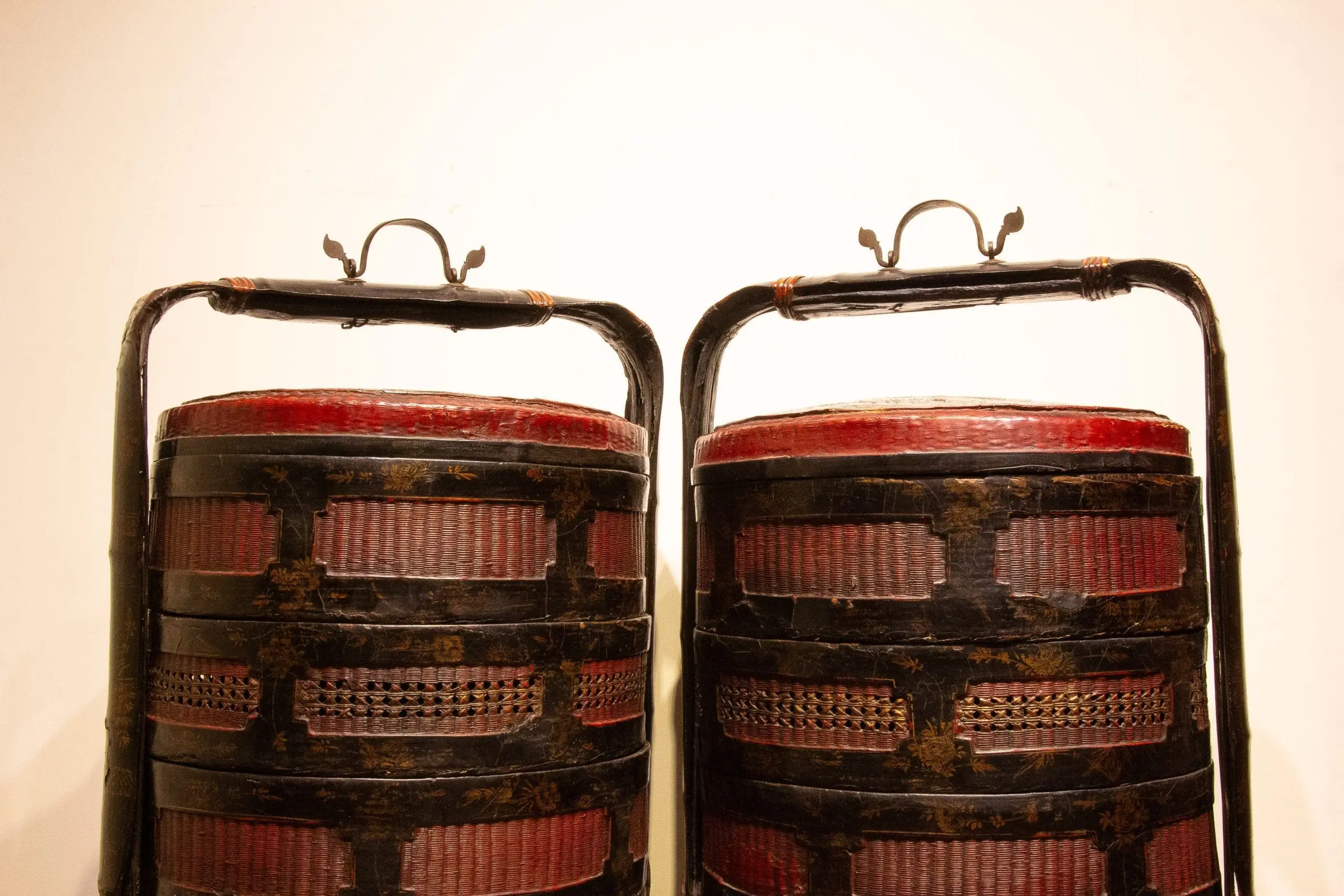 A very rare and unique pair of 4 tiered offering baskets finely woven rattan with bamboo handles, gilded paintings of couples, birds and flowers, on the lids and sides indicating that they might be wedding offering baskets.