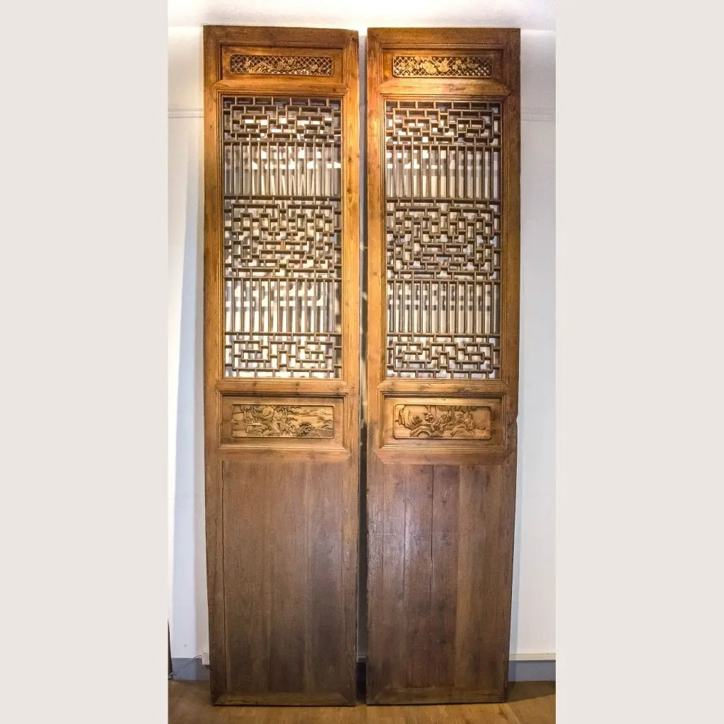 | Description | A fine pair of doors with honeycomb carvings above, center panel inset carvings of birds and bamboo, birds and lotus or mum flowers, solid planets below, beading on the frames. |