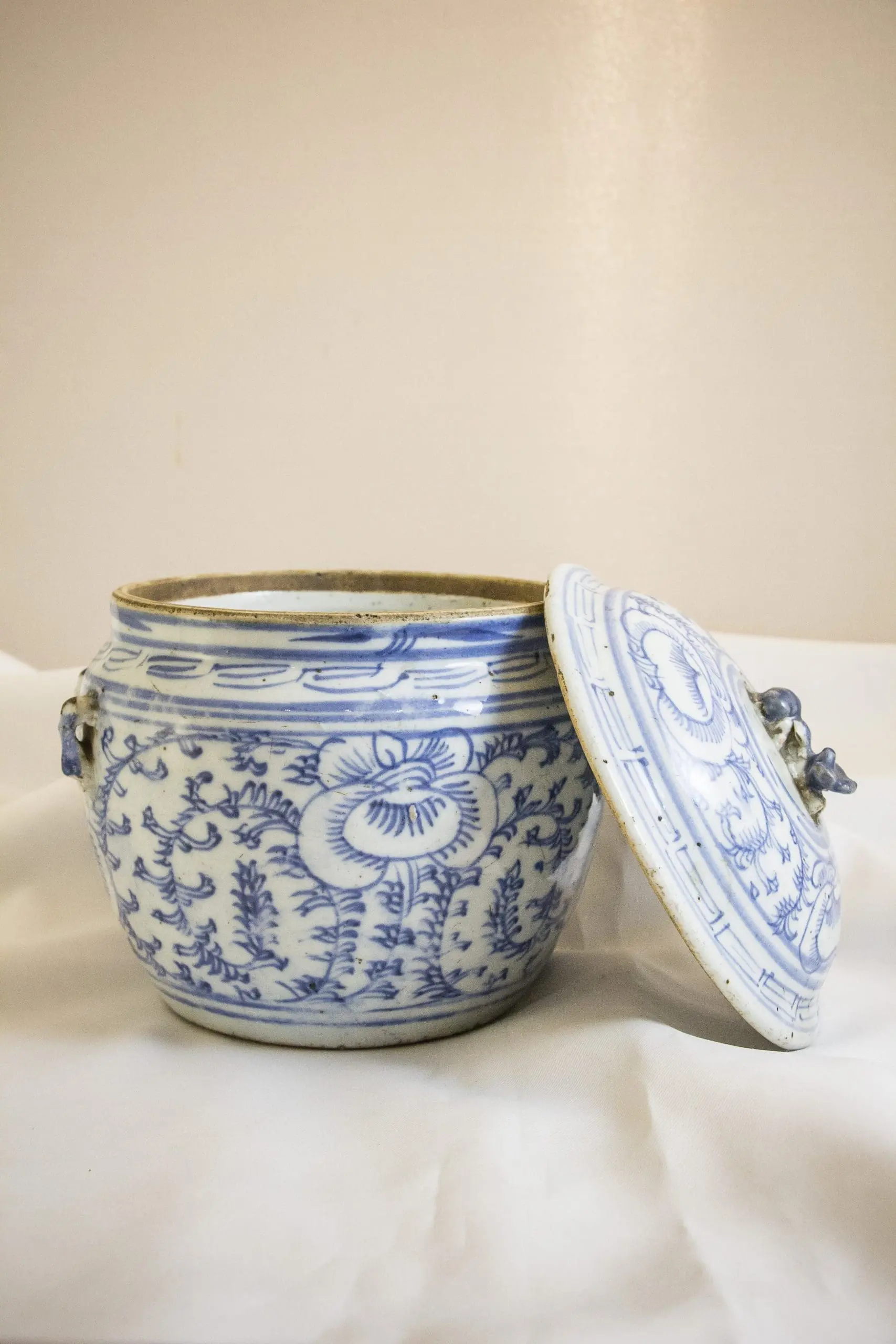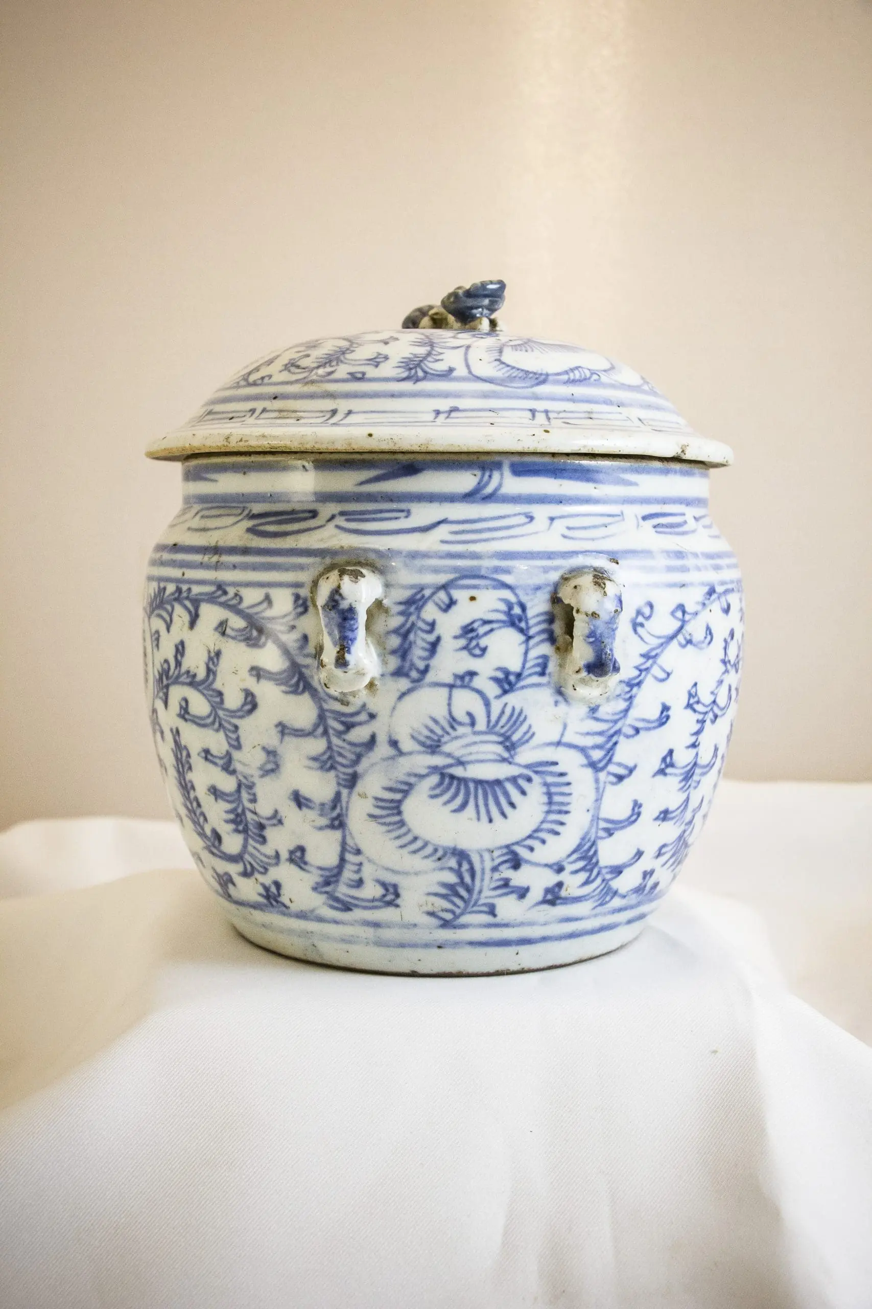 | Description | These blue and white porcelain Kamcheng (Hokkien for ‘covered jar’ jar with lid, were used for storing water, oil,, food and pickles. Painted with lotus flowers and scrolling vines which symbolise harmony and integrity, and topped with a lion knob known as a guardian lion for protection. The blue color is thought to symbolize heaven, and the white symbolizes purity. |