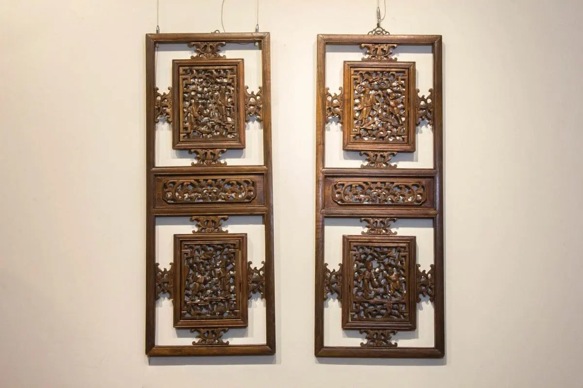 | Description | A pair of windows with perforated carvings of gentleman, women, and children in the upper and lower center panels, and a center panel of perforated carvings of vines. |
