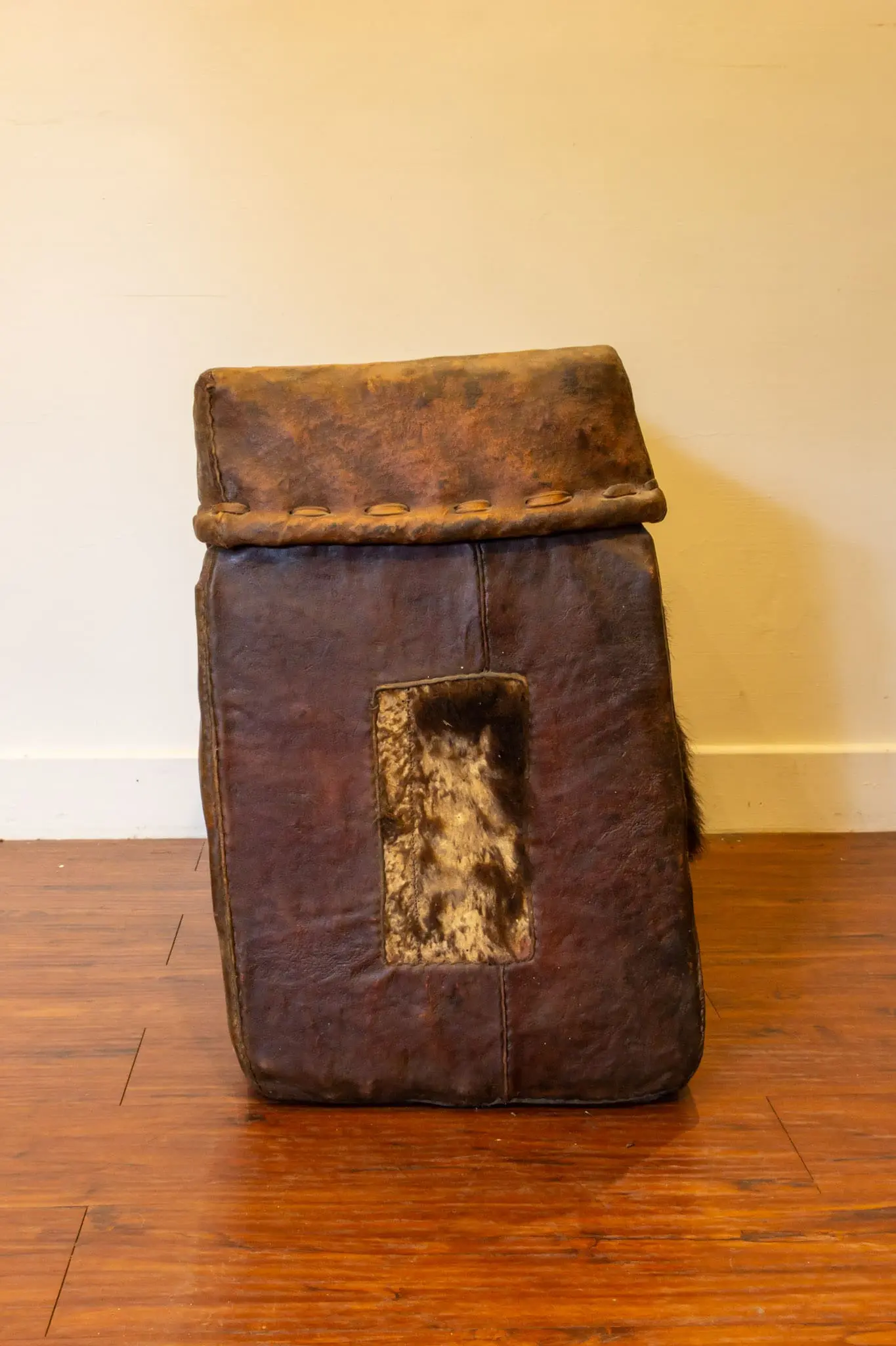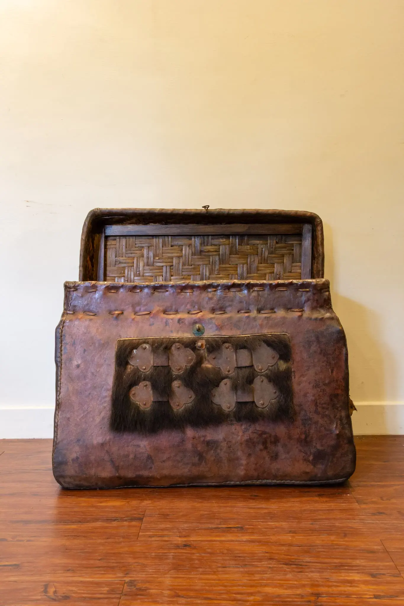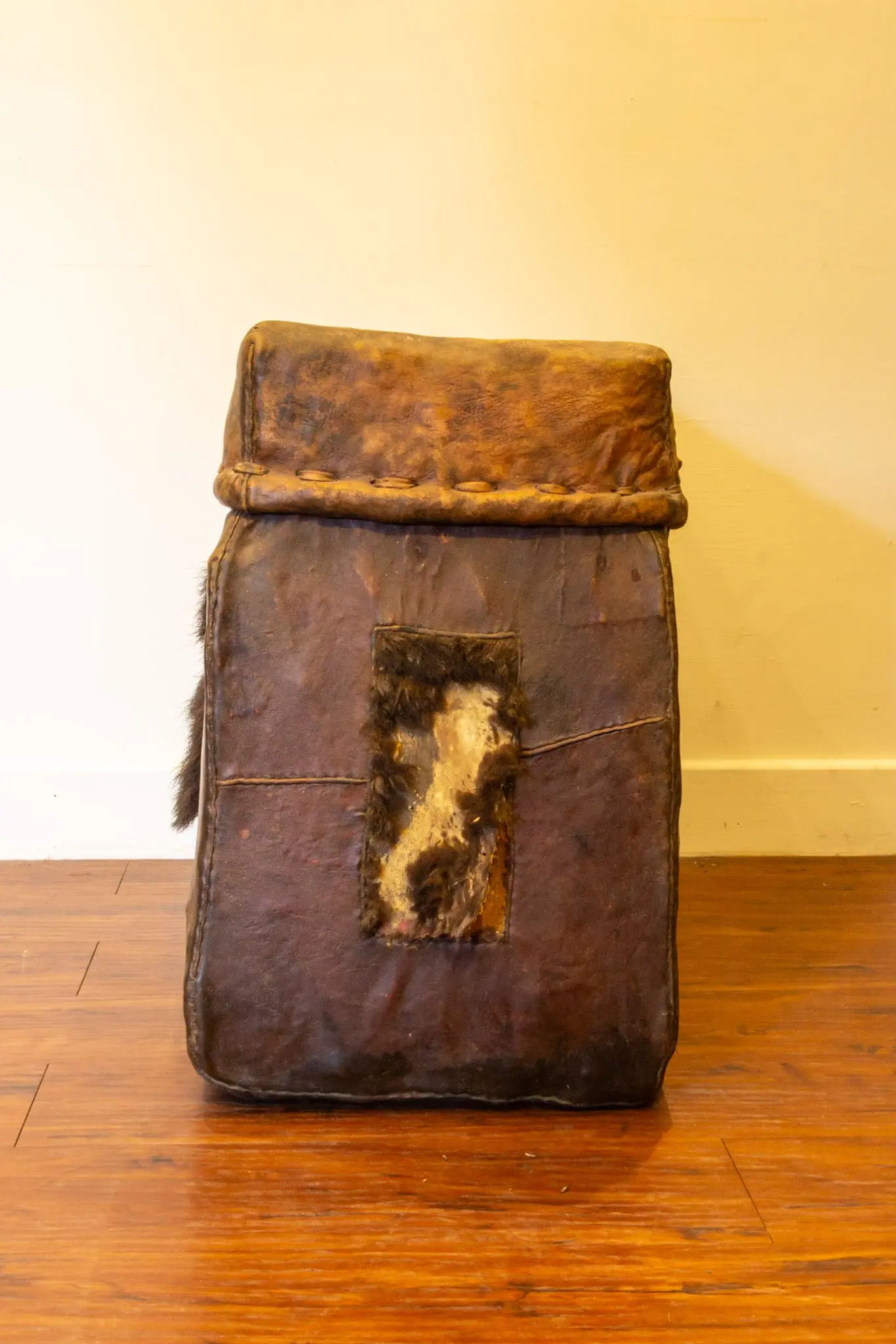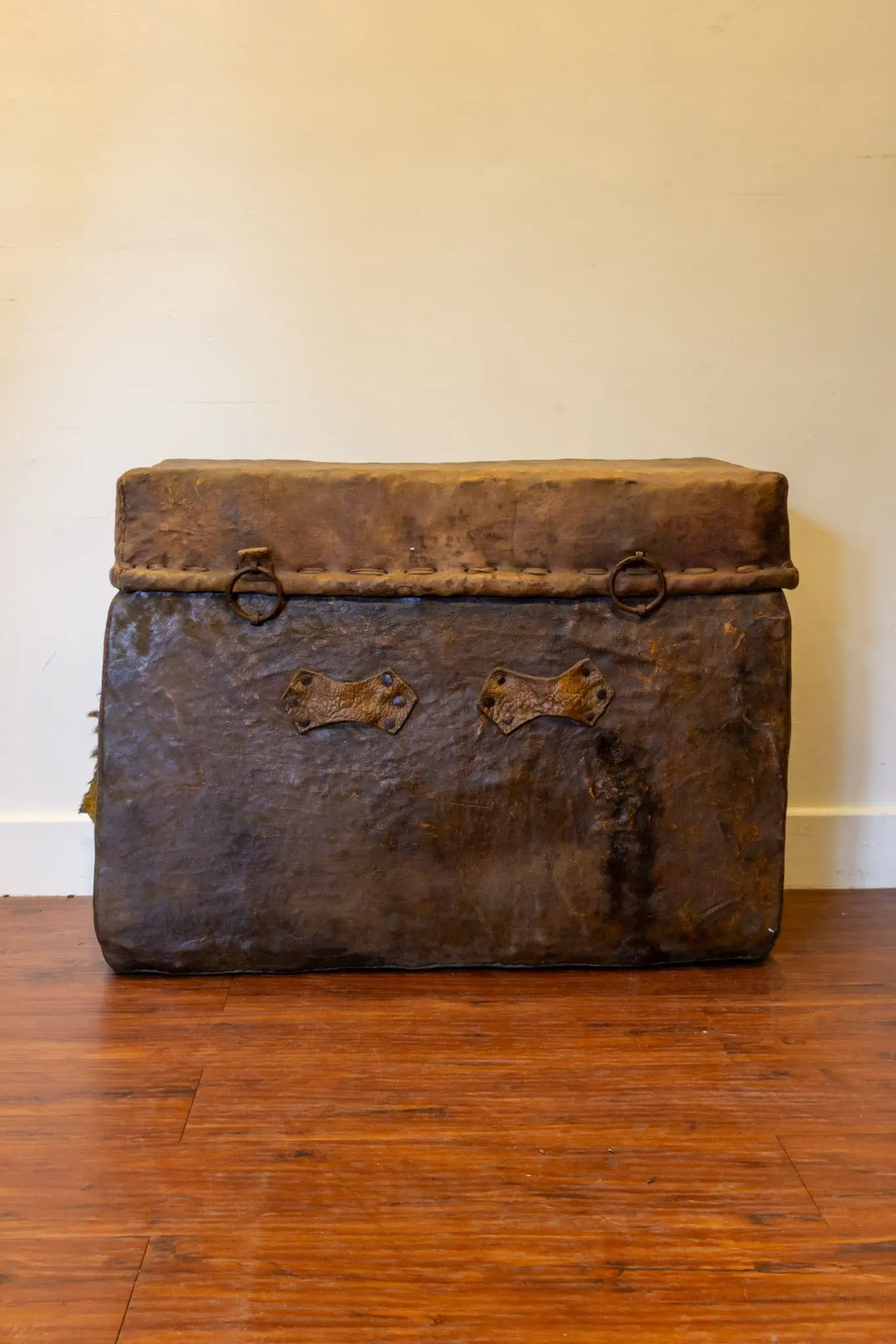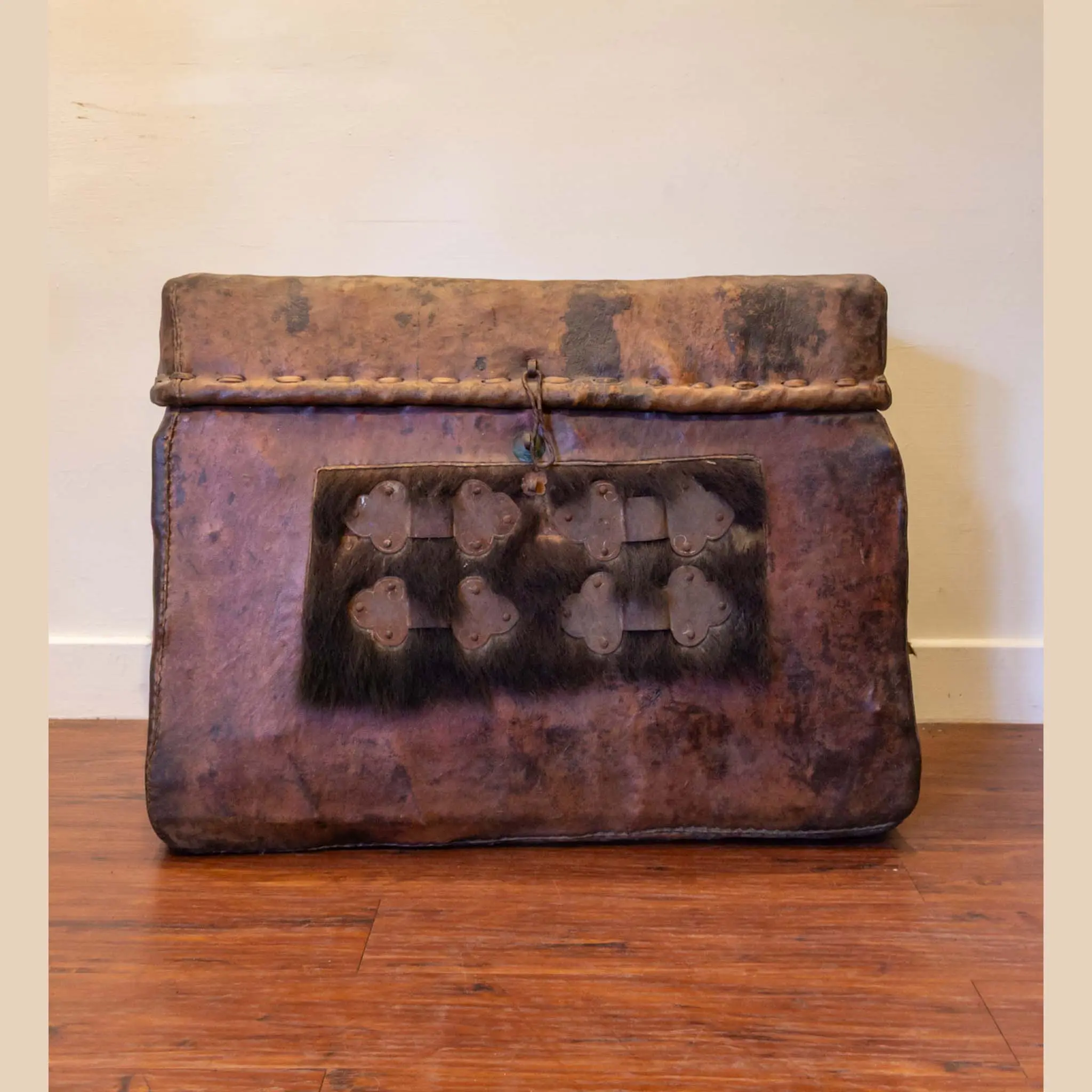 | Description | Mid-19th century Tibetan travel trunk wrapped in thick rawhide over a wooden core, with iron rings and ink calligraphy to the front. Richly patinated leather shows decades of use and shrinkage, creating powerful texture and character. Compact, portable form originally for nomadic storage, now an evocative decorative or display piece. |