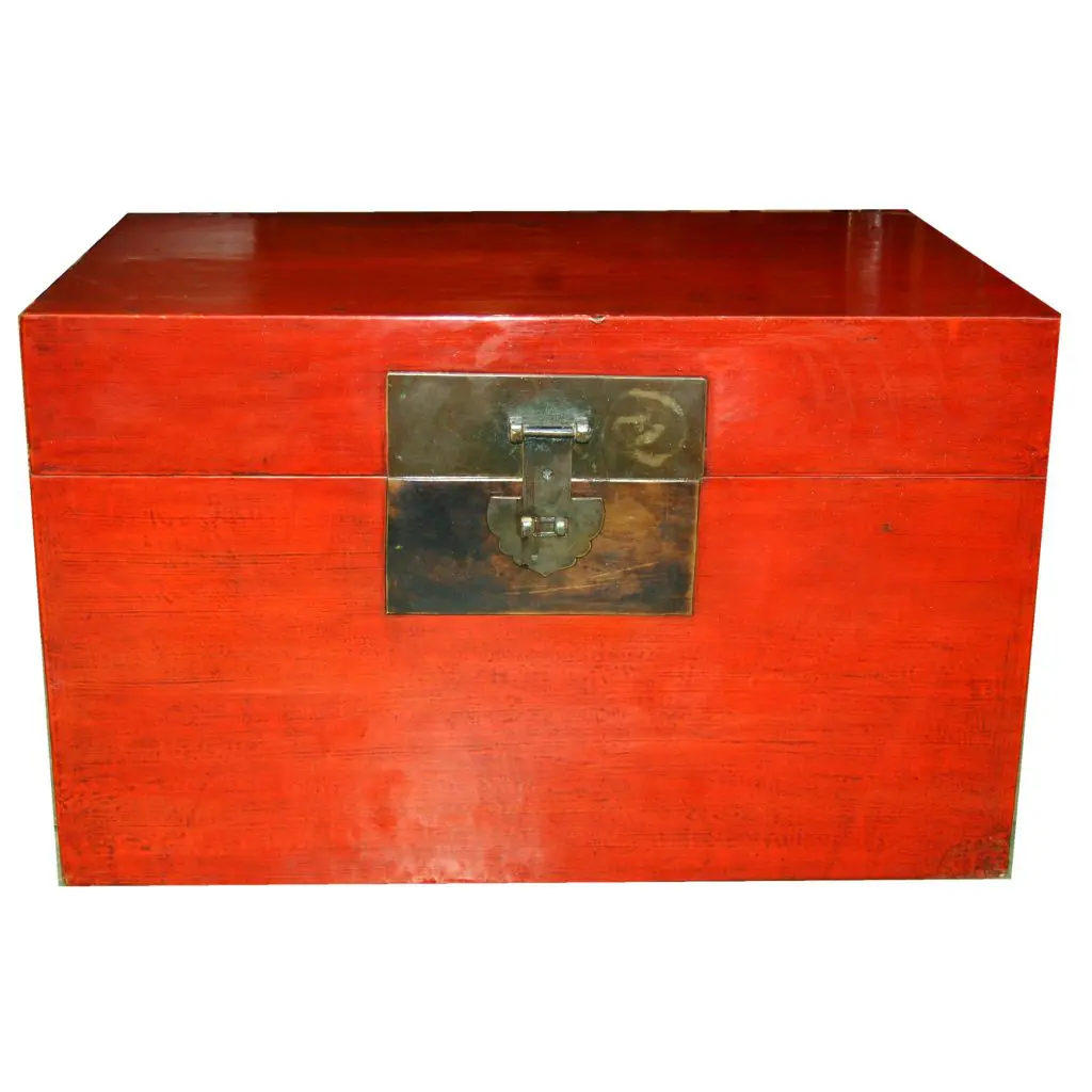 | Description | A well preserved large wood dowry chest with a brass rectangular lock plate and side handles with original red lacquer finish. |
