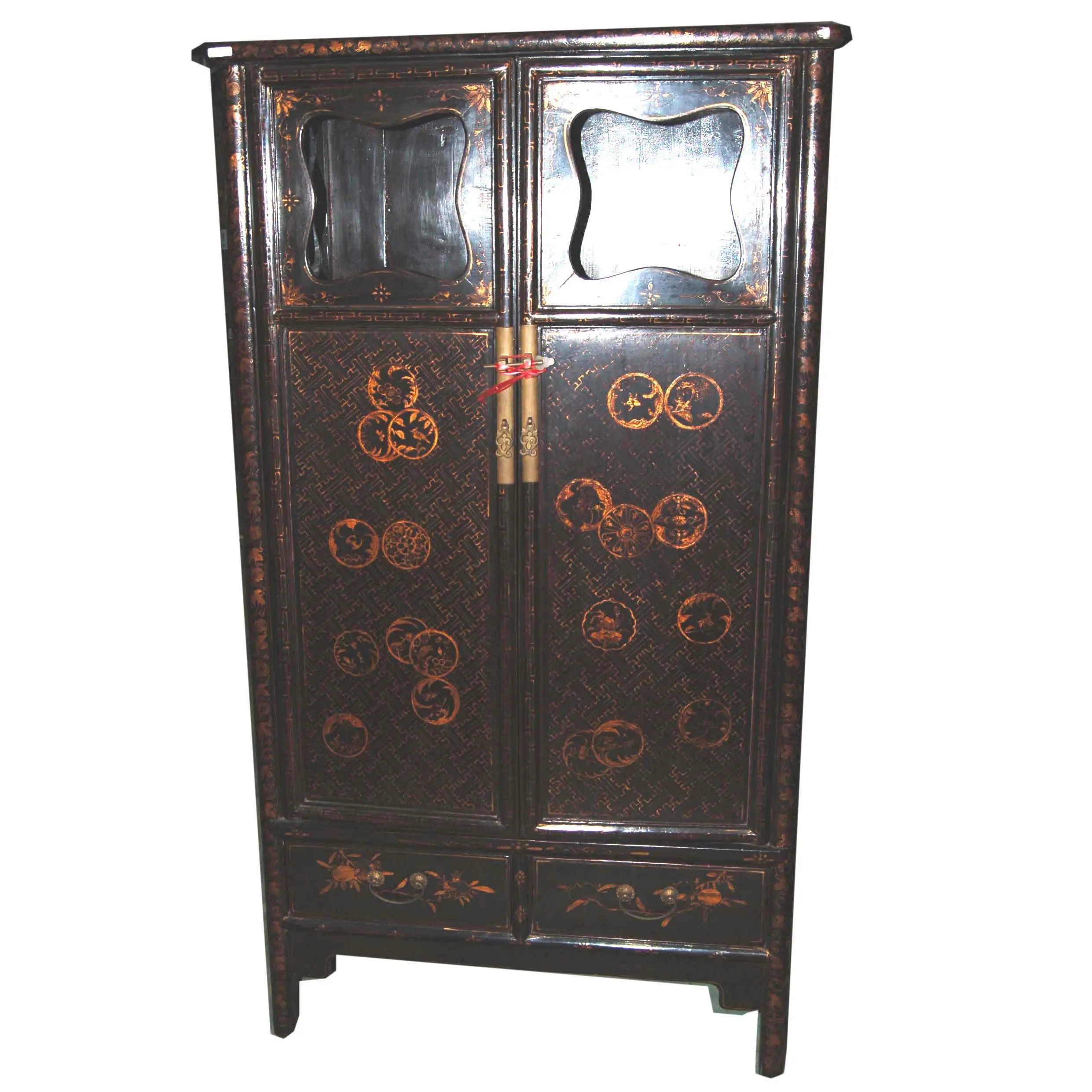 | Description | A large rectangular cabinet with an open scalloped frame above, two wide opening doors with brass handles below. The lower solid paneled doors contain paintings of gilded medallions on a geometric background. Flowers and fruit paintings are on the lower two drawers. |