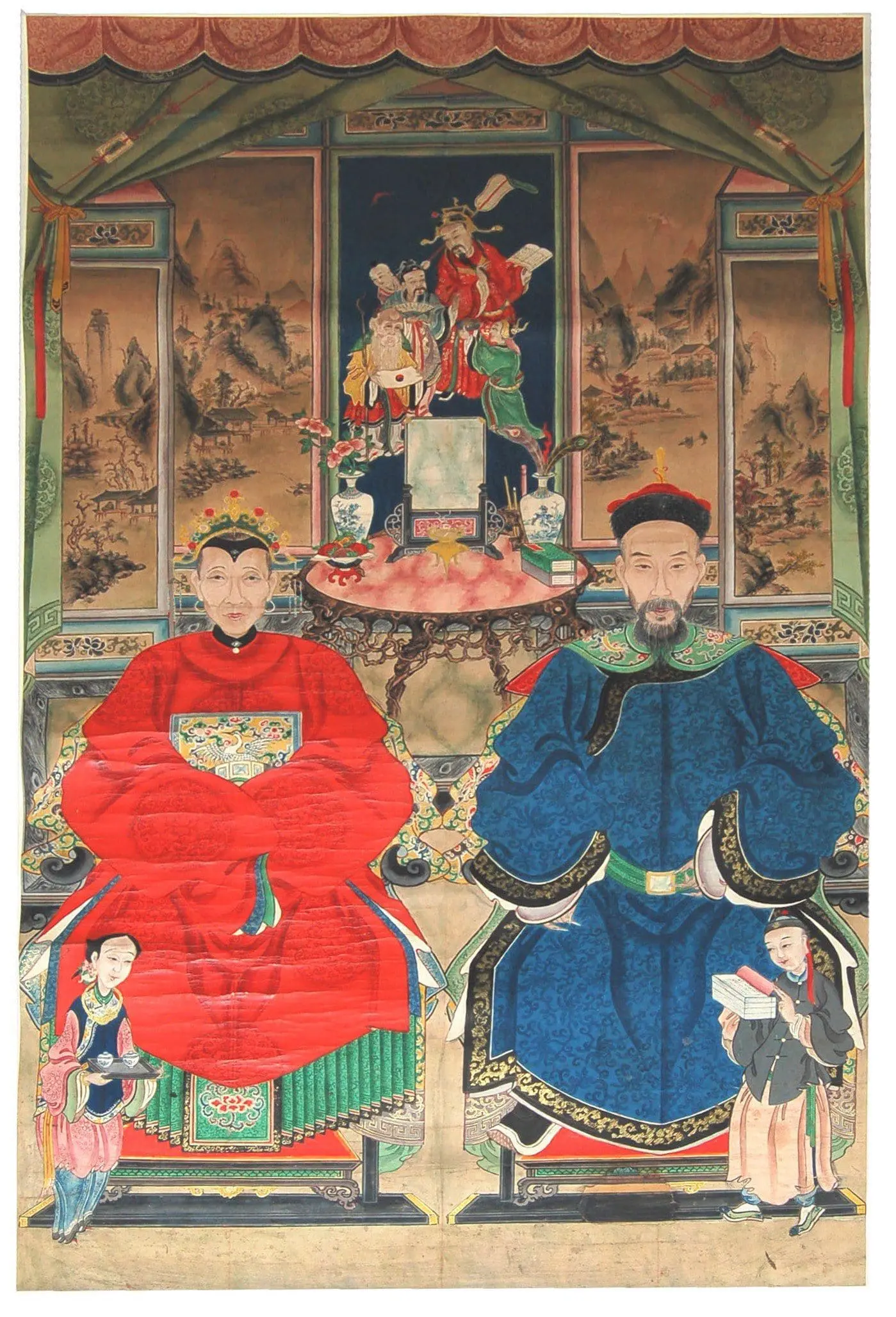 | Description | Qing Dynasty ancestral portrait: seated couple before an elaborate pavilion backdrop. Red and blue attire signifies status. Raised shrine and side panels suggest religious or historical themes. Formal poses and rich fabrics emphasize dignity and wealth. |