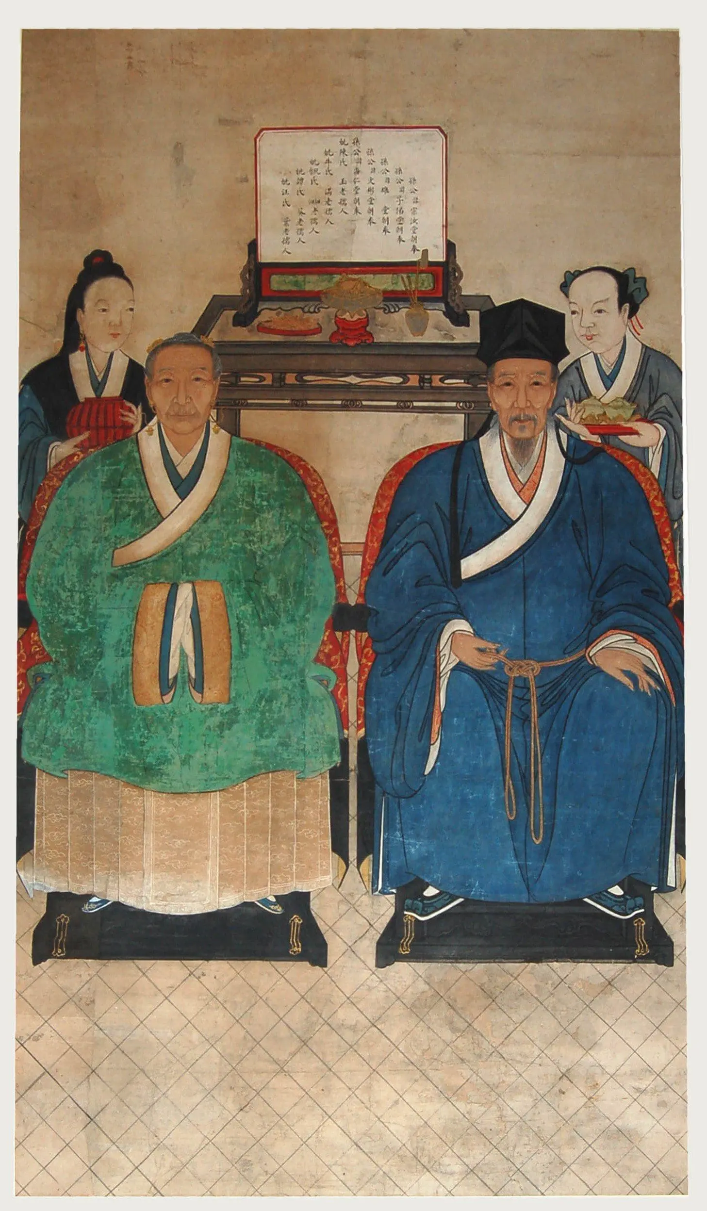 | Description | Qing Dynasty portrait: dignified couple in formal attire. Woman in red, with golden pheasant badge, denotes second-rank official's wife. Man in dark robes, hat with red finial, signifies his status. Flat style emphasizes dignity and lineage. |
