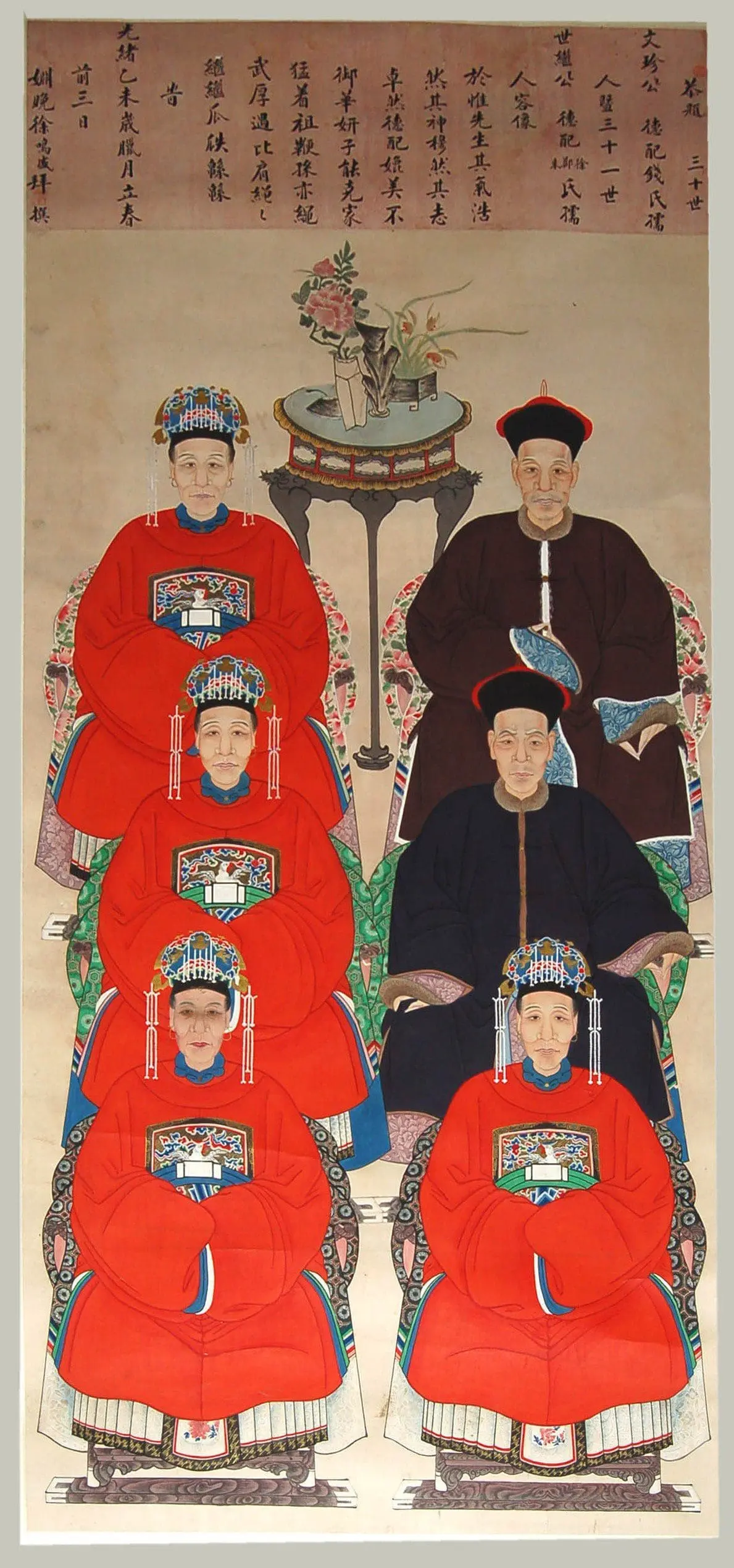 | Description | Qing Dynasty ancestral portrait: patriarch and matriarch in dark robes, seated above women in red. Mandarin squares indicate rank. Altar signifies ancestor worship. Calligraphy details lineage. Ornate headdresses and symmetrical arrangement reflect Confucian values and noble status. |