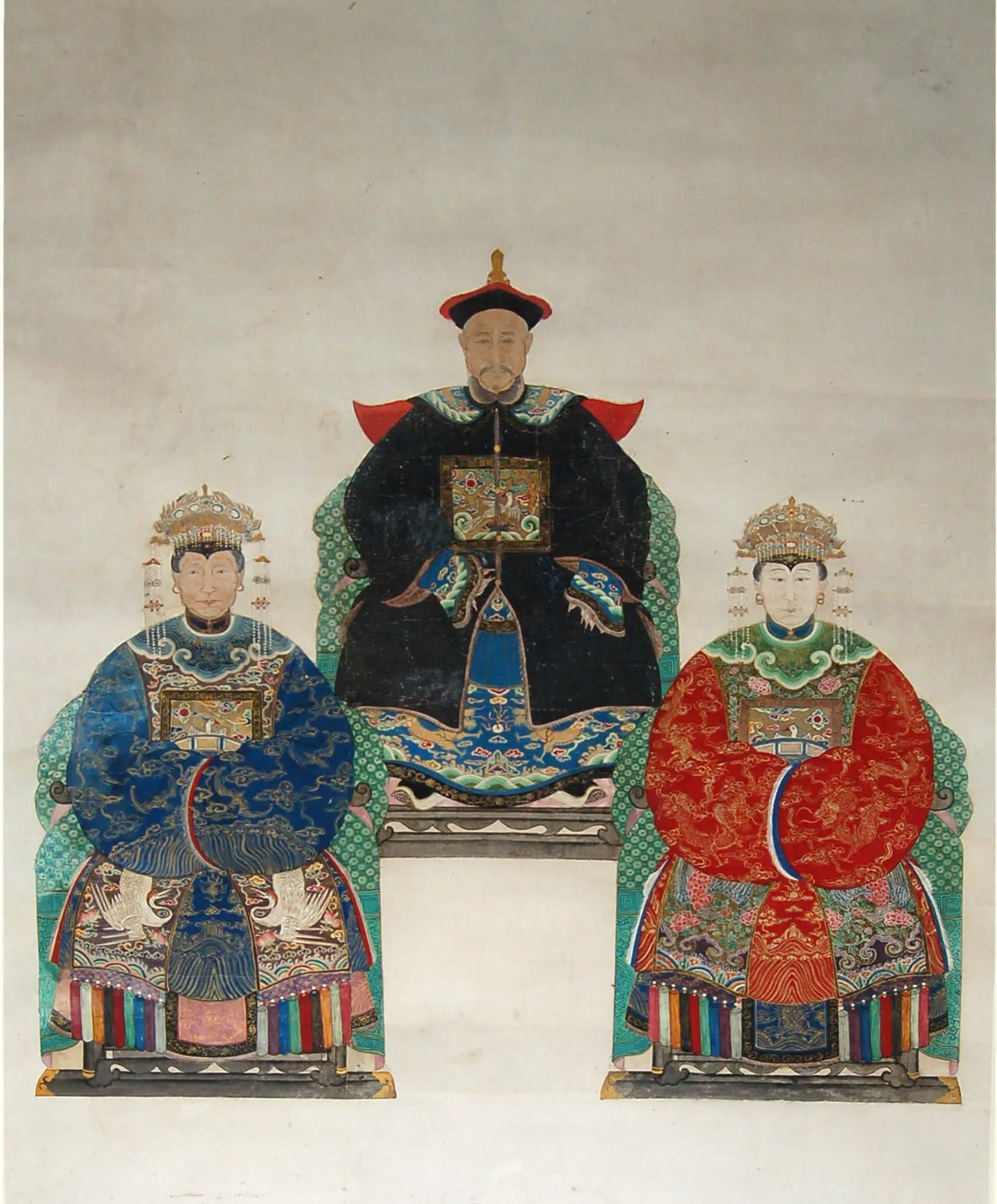 | Description | Qing Dynasty ancestral portrait: a male official, centrally elevated, flanked by two women. Their ornate robes and headdresses denote status. Formal poses and a neutral background emphasize lineage and hierarchy, reflecting traditional Chinese portraiture focus on pattern and rank. |