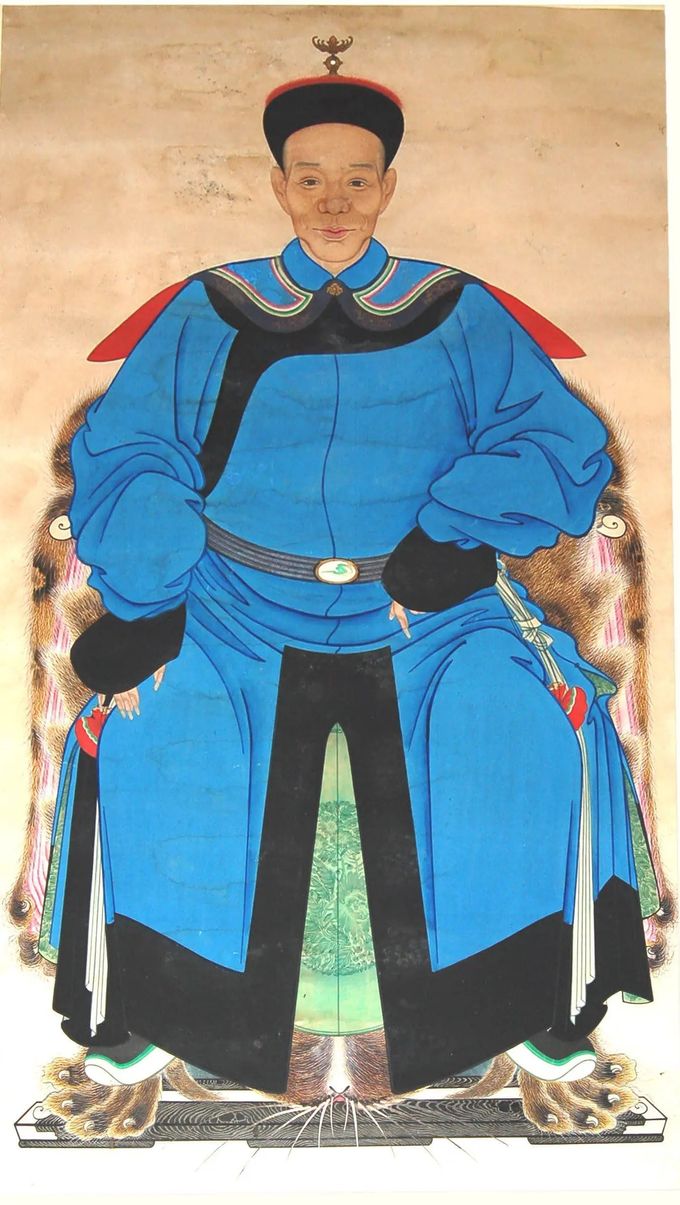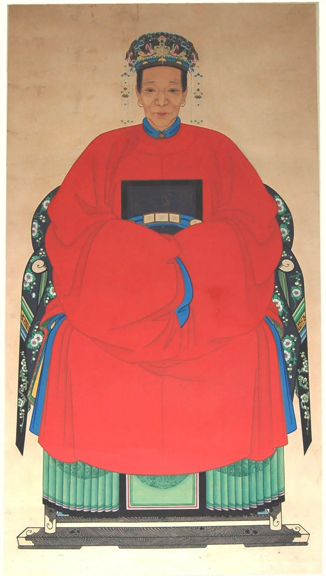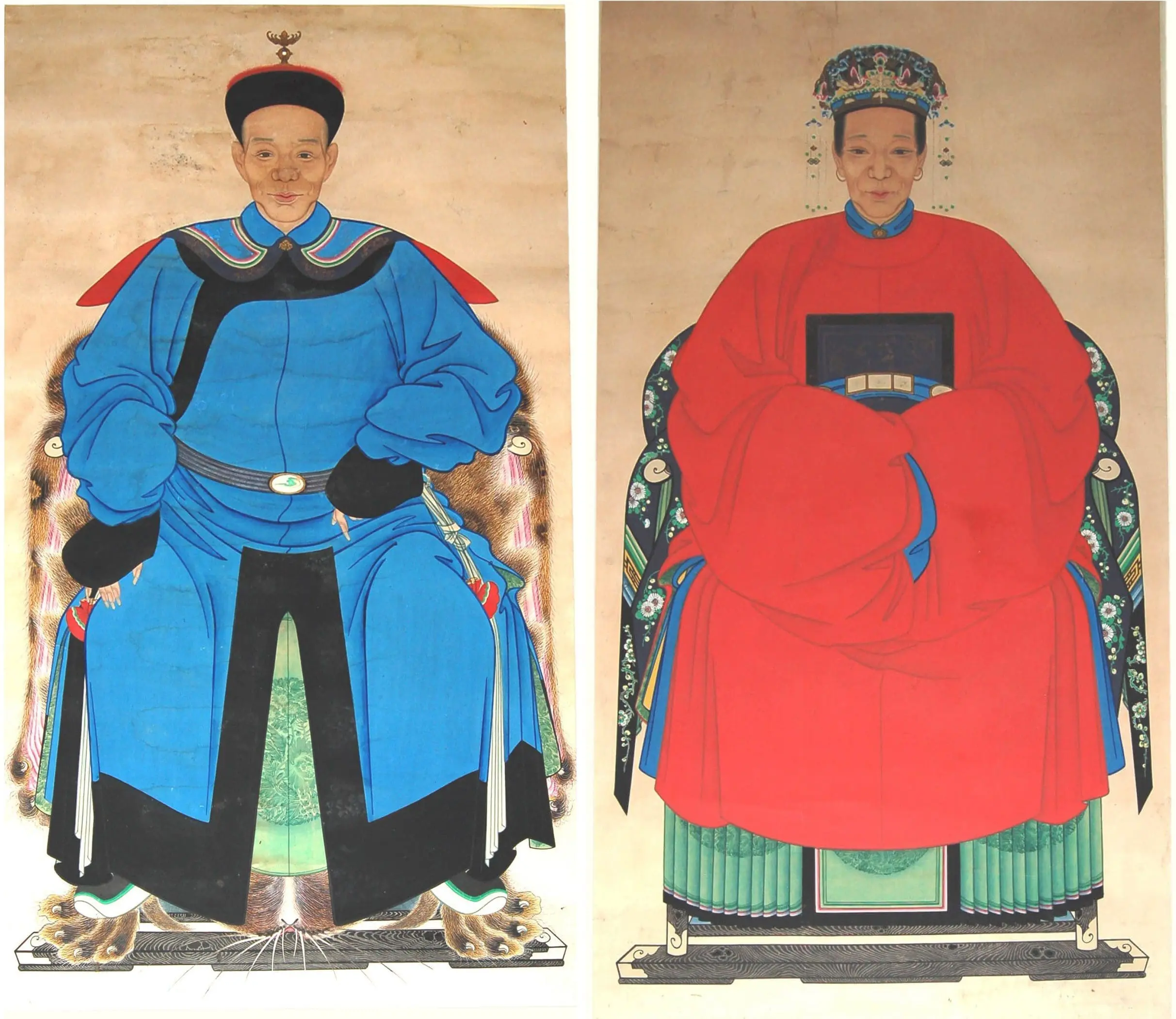 | Description | Qing Dynasty portrait: a dignified man in blue robes, seated formally. His black hat and jade belt suggest scholarly or official status, despite the lack of a mandarin badge. His upright pose reflects Confucian values of hierarchy and respect. Qing Dynasty portrait of a noblewoman in red robes, indicating high status. Her white pheasant badge suggests she's a fifth-rank official's wife. Ornate headdress and jeweled adornments denote wealth. The simple background highlights her dignified presence. |