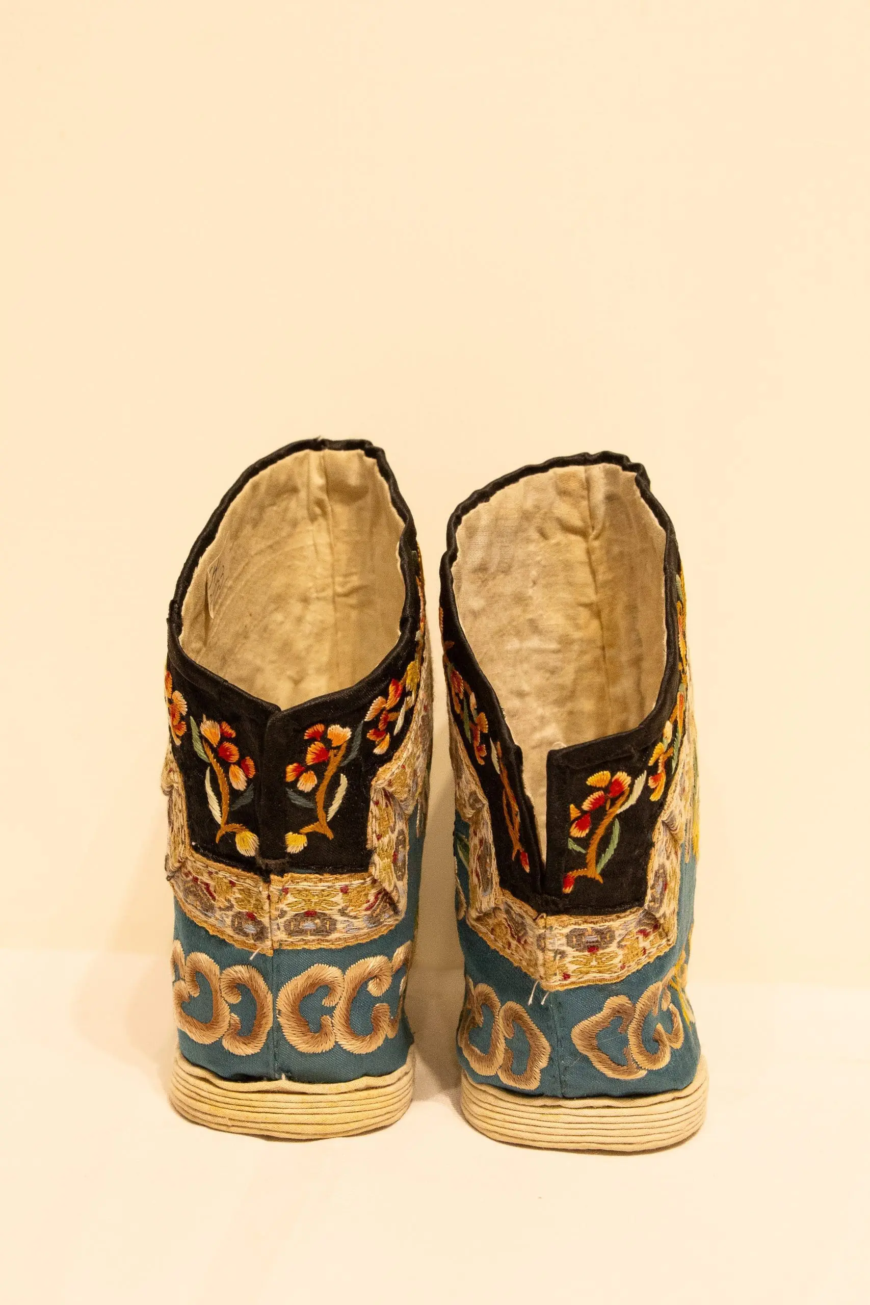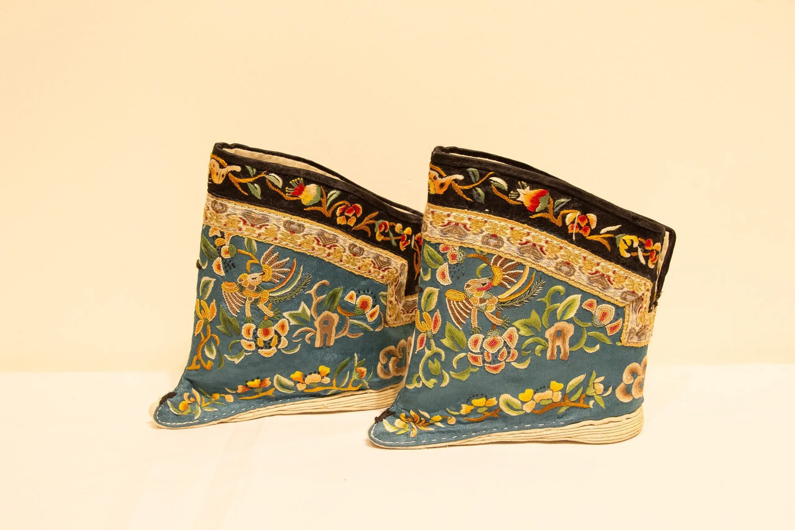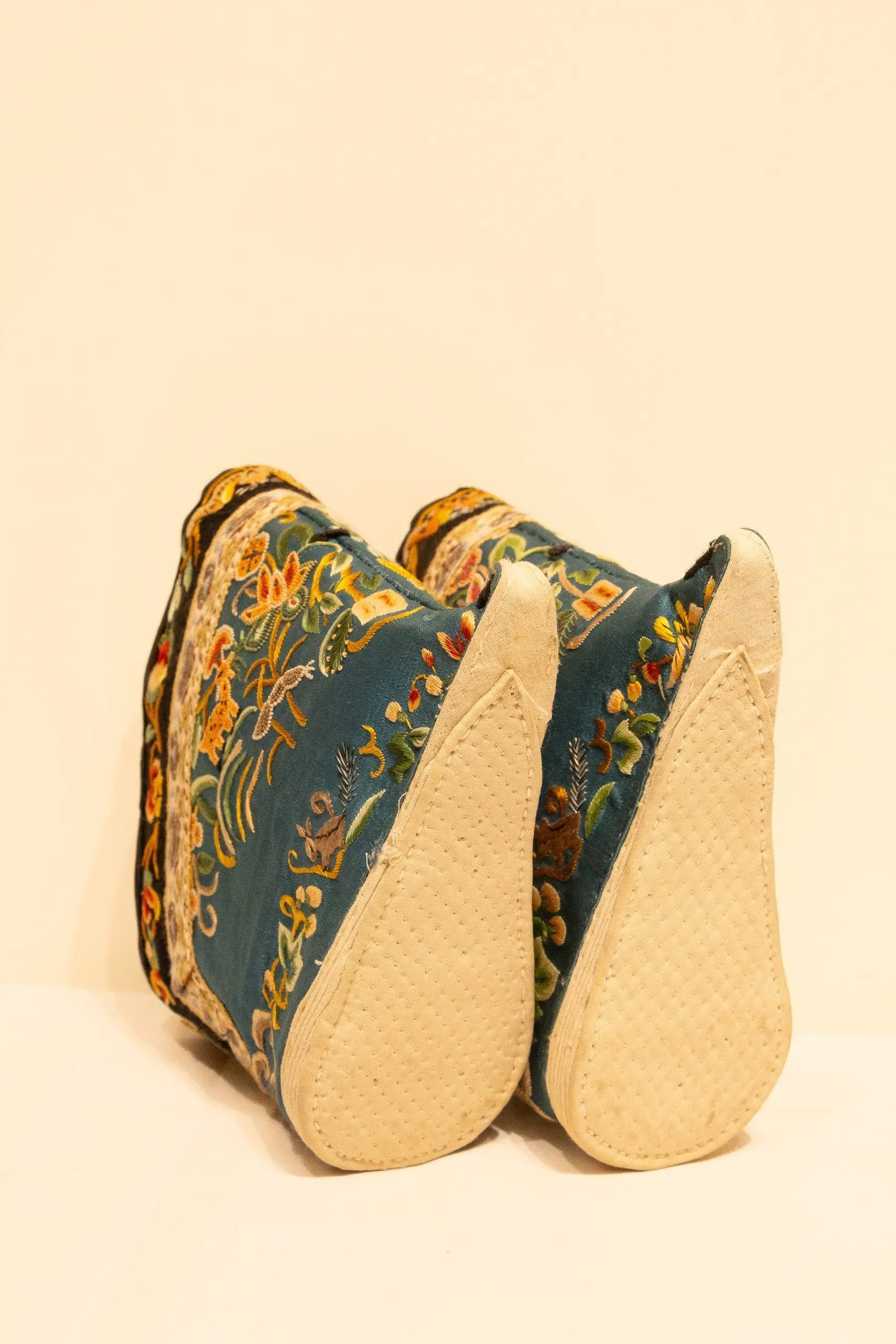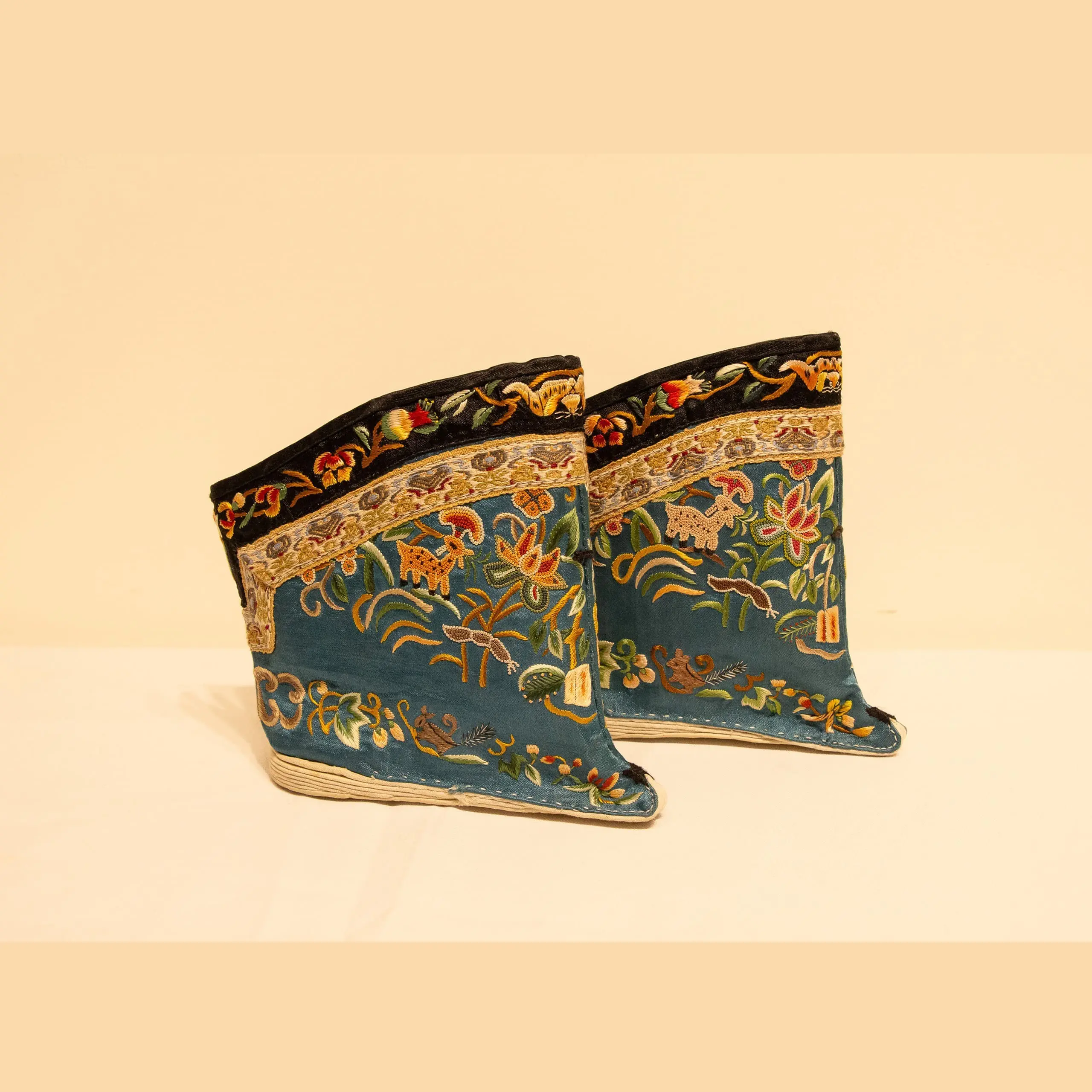 | Description | A vintage pair of lotus shoes, fashioned in vivid blue silk with elaborate embroidered floral and animal motifs, highlighted by gold-thread accents and multicolored designs. |