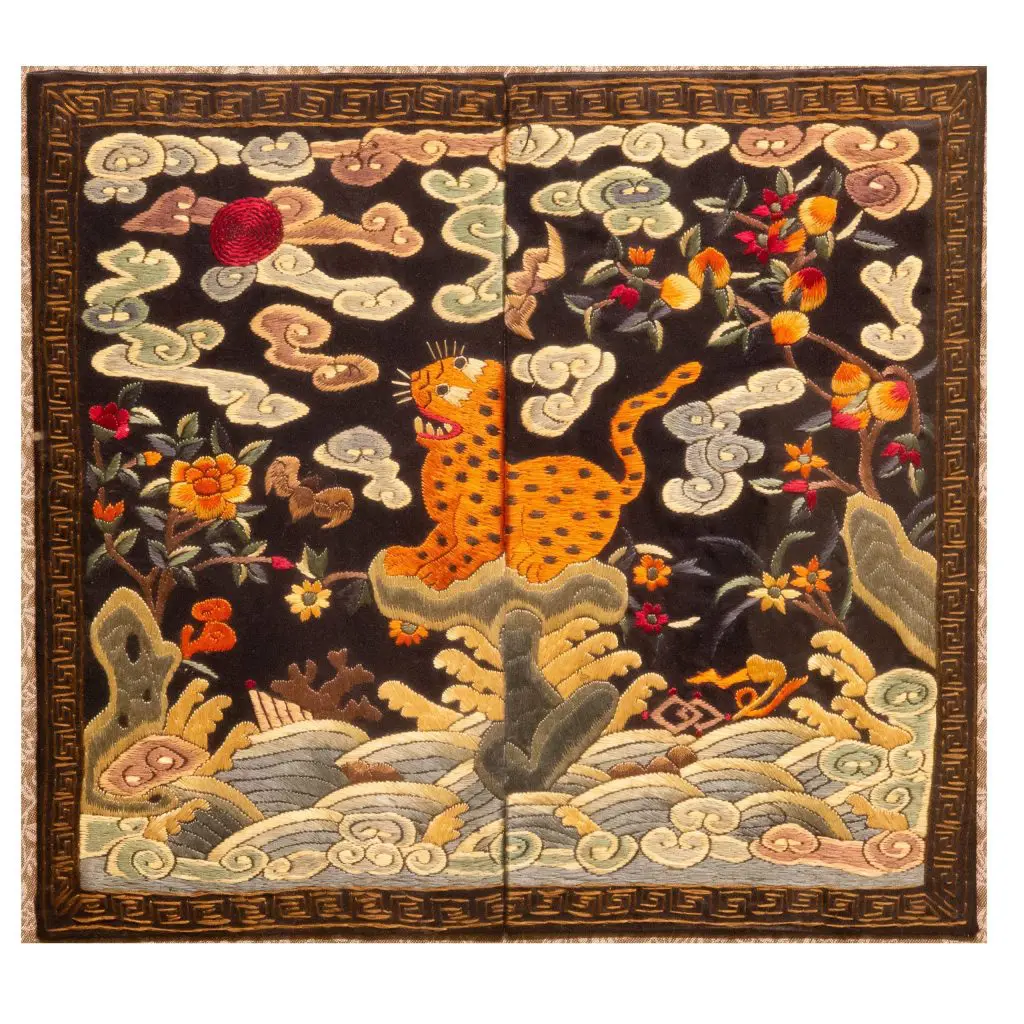 | Description | This vintage Chinese embroidered panel depicts a vibrant leopard standing on rocky waves beneath swirling clouds and floral sprays. Rendered in brightly colored silk threads on a dark ground, the work reflects traditional rank badge aesthetics while celebrating strength, agility, and auspicious symbolism within Chinese decorative art. |