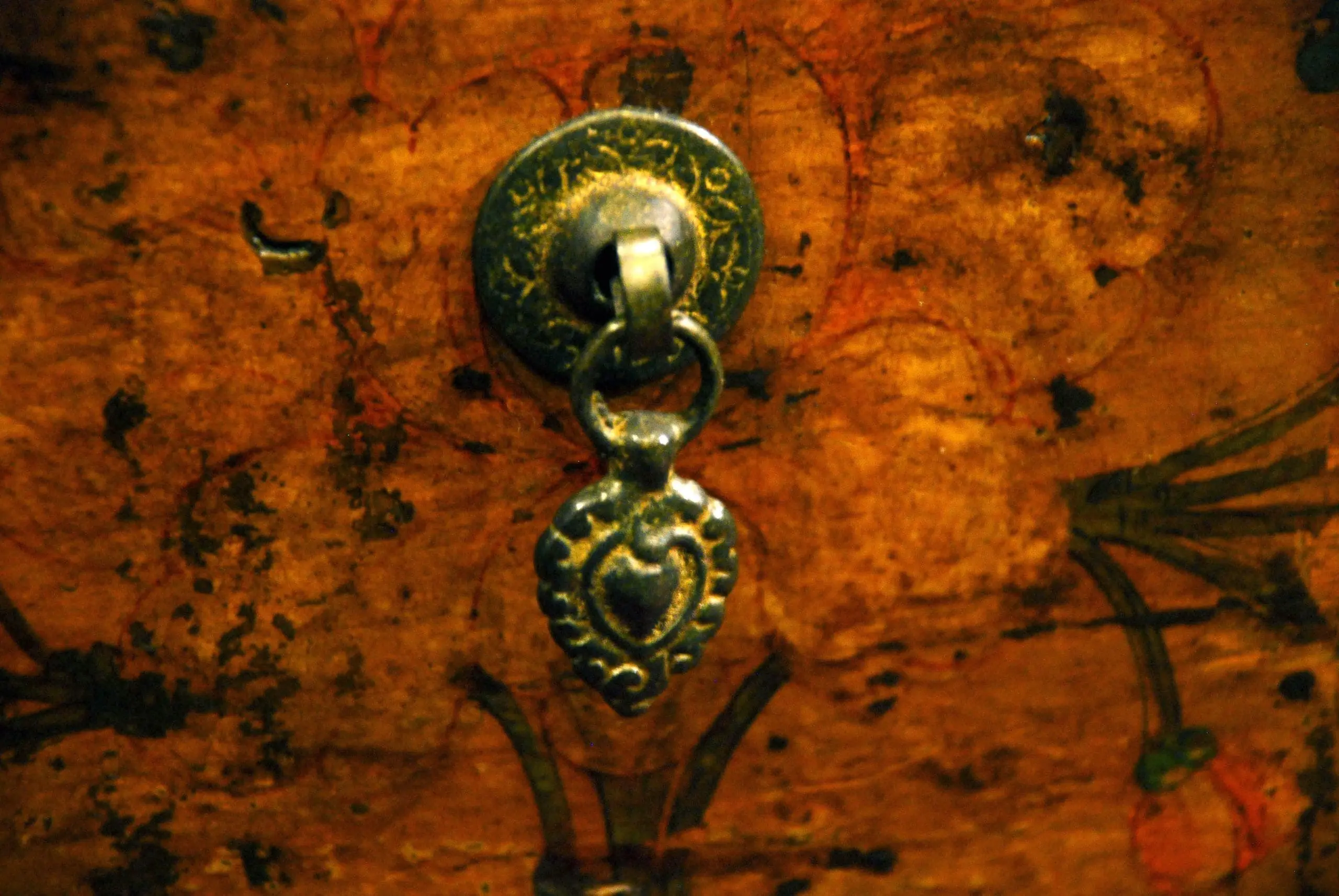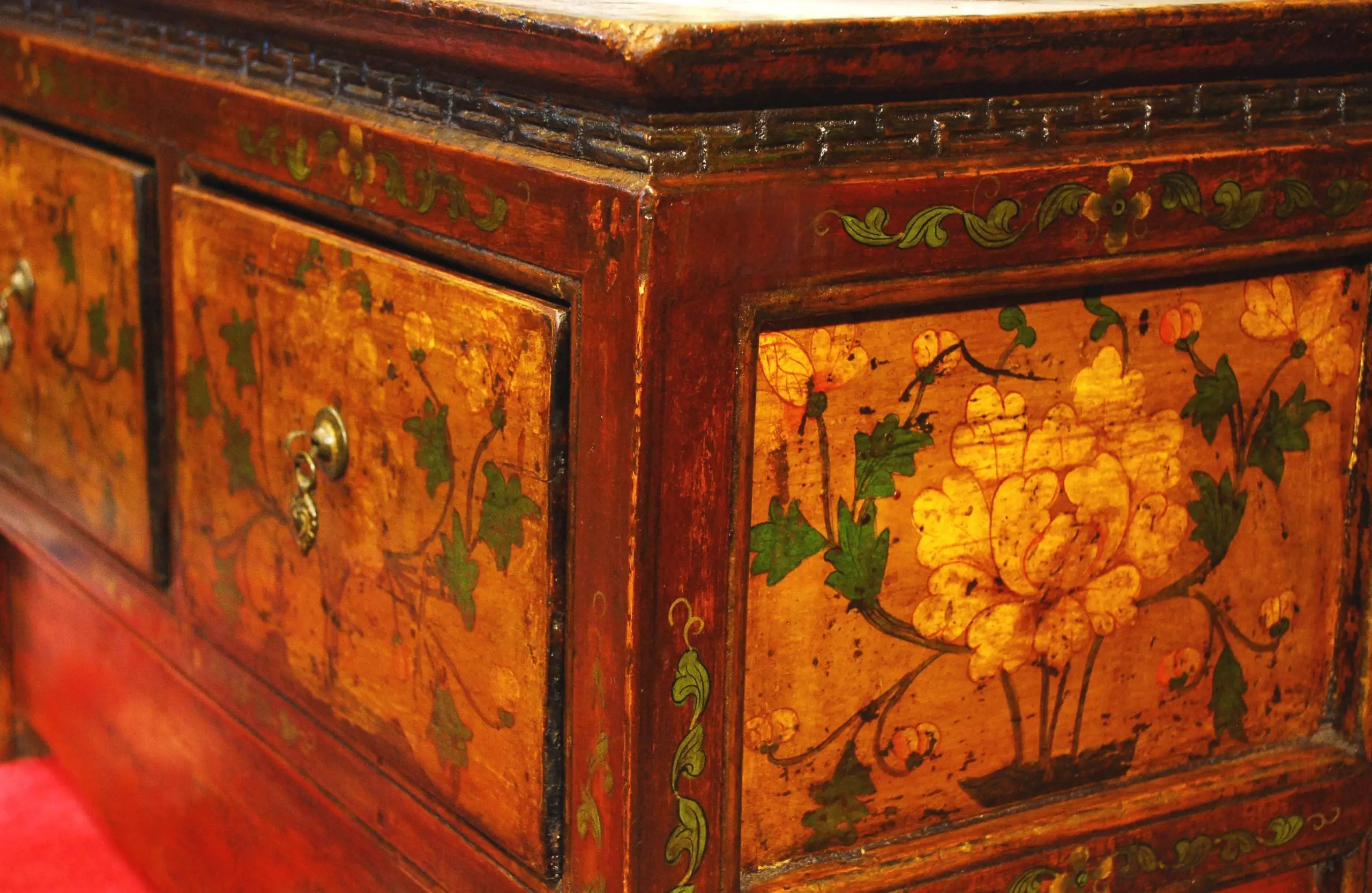 | Description | A small chest with a solid wooden top, beading and leaf paintings on the frame and polychrome floral paintings on the two sliding doors. |
