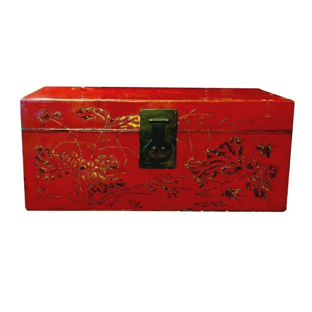 | Description | Red leather trunk with gold gilt paintings of flowers and butterflies. |
