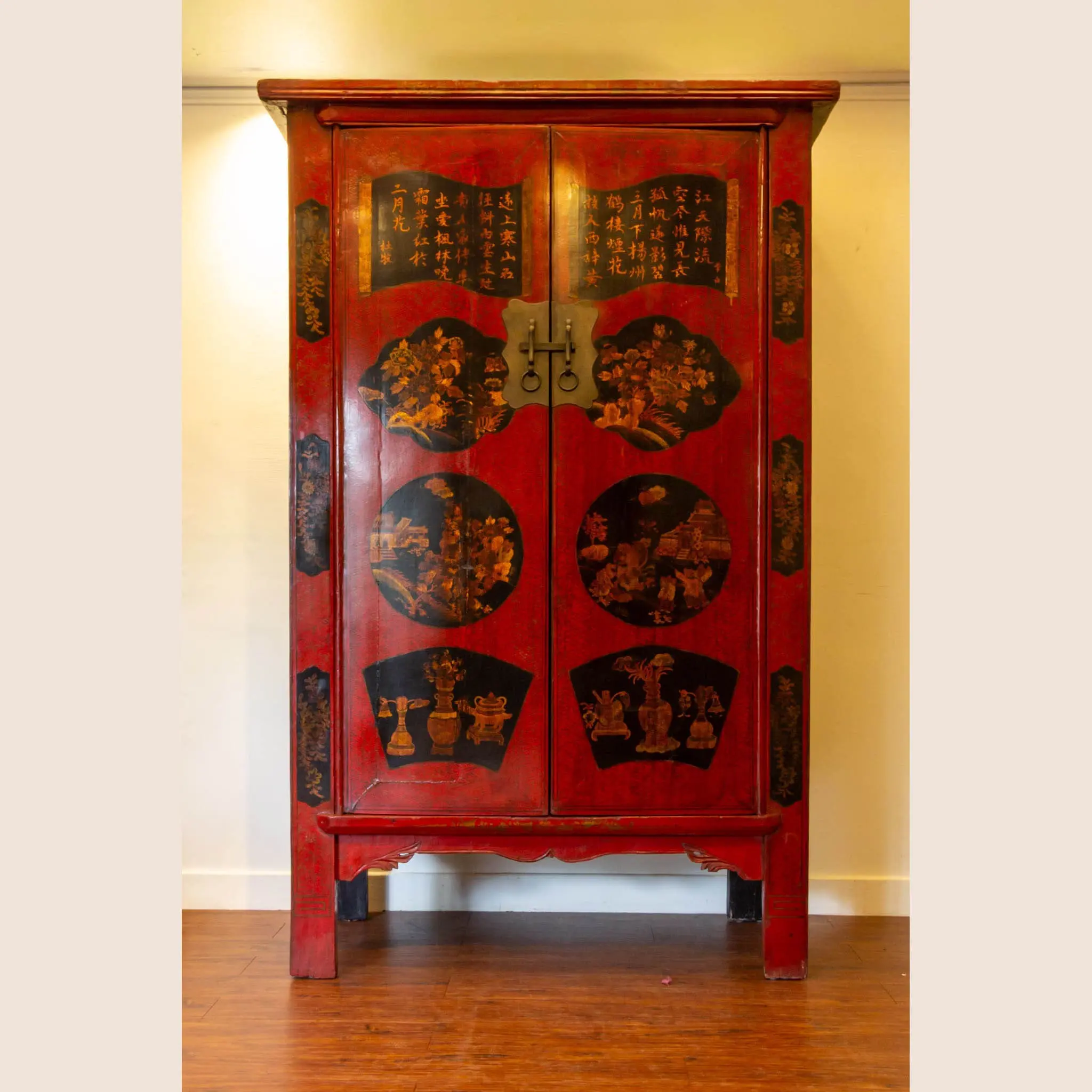 | Description | Elegant cabinet with auspicious painting of medallions applied over the original lacquer. The interior has three shelves, offering substantial storage. |