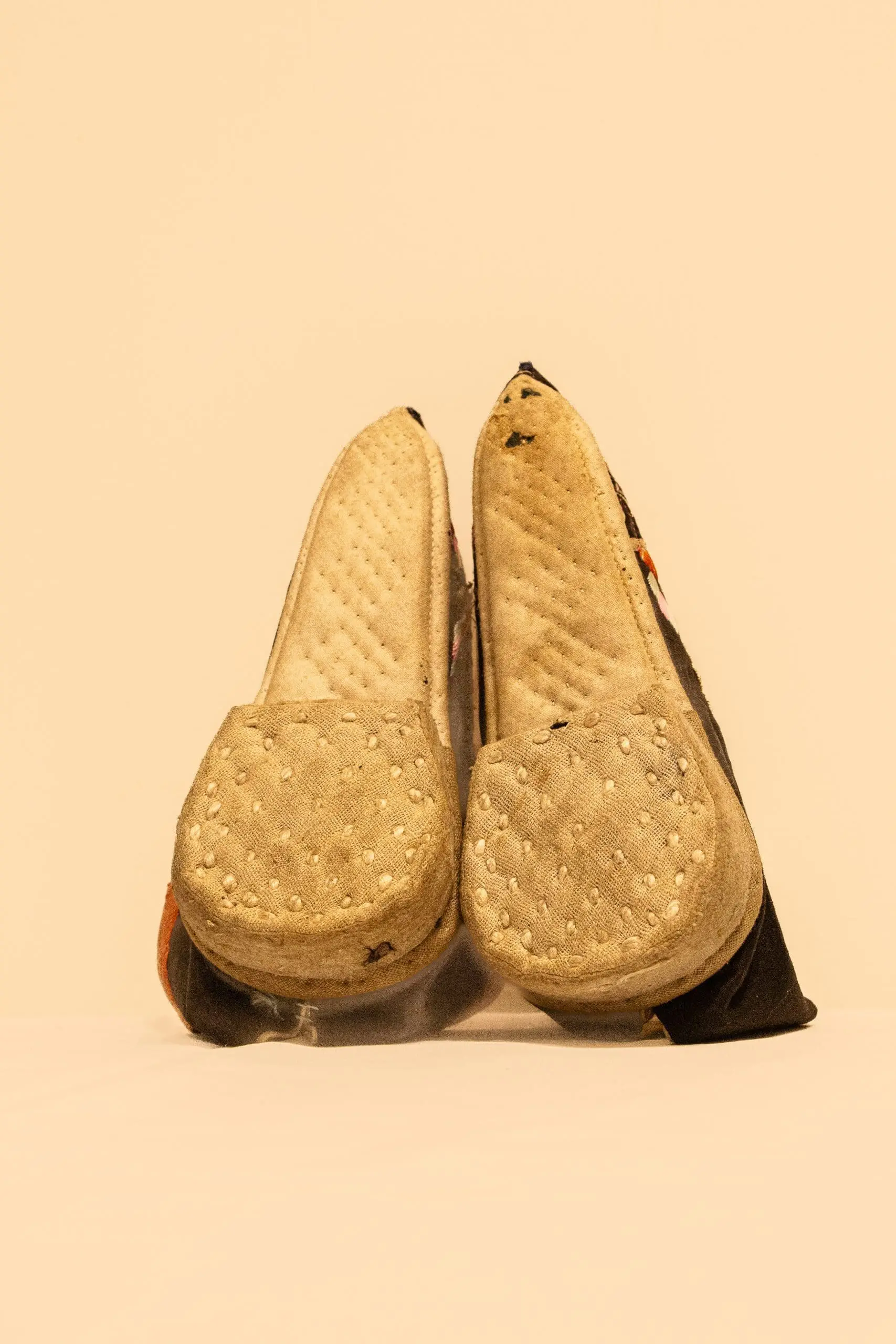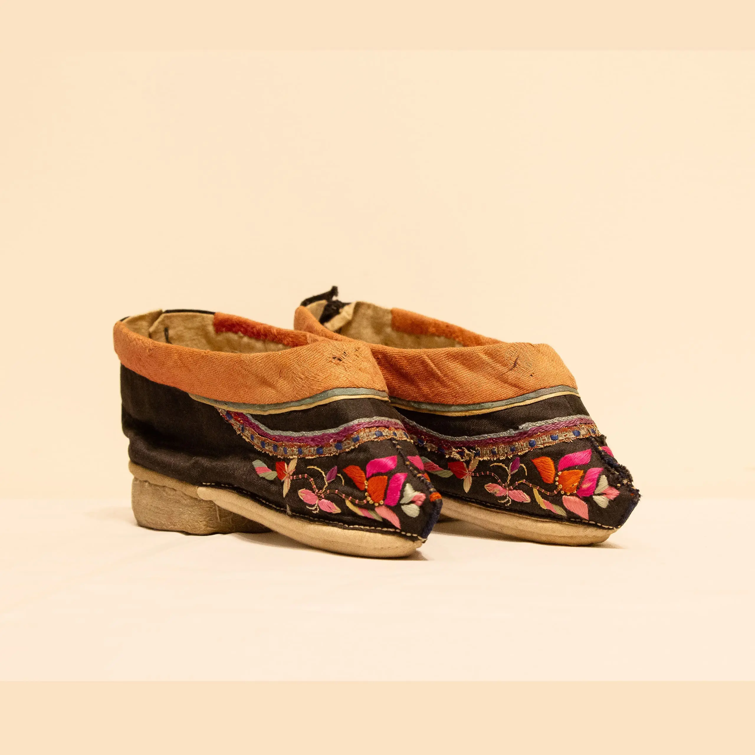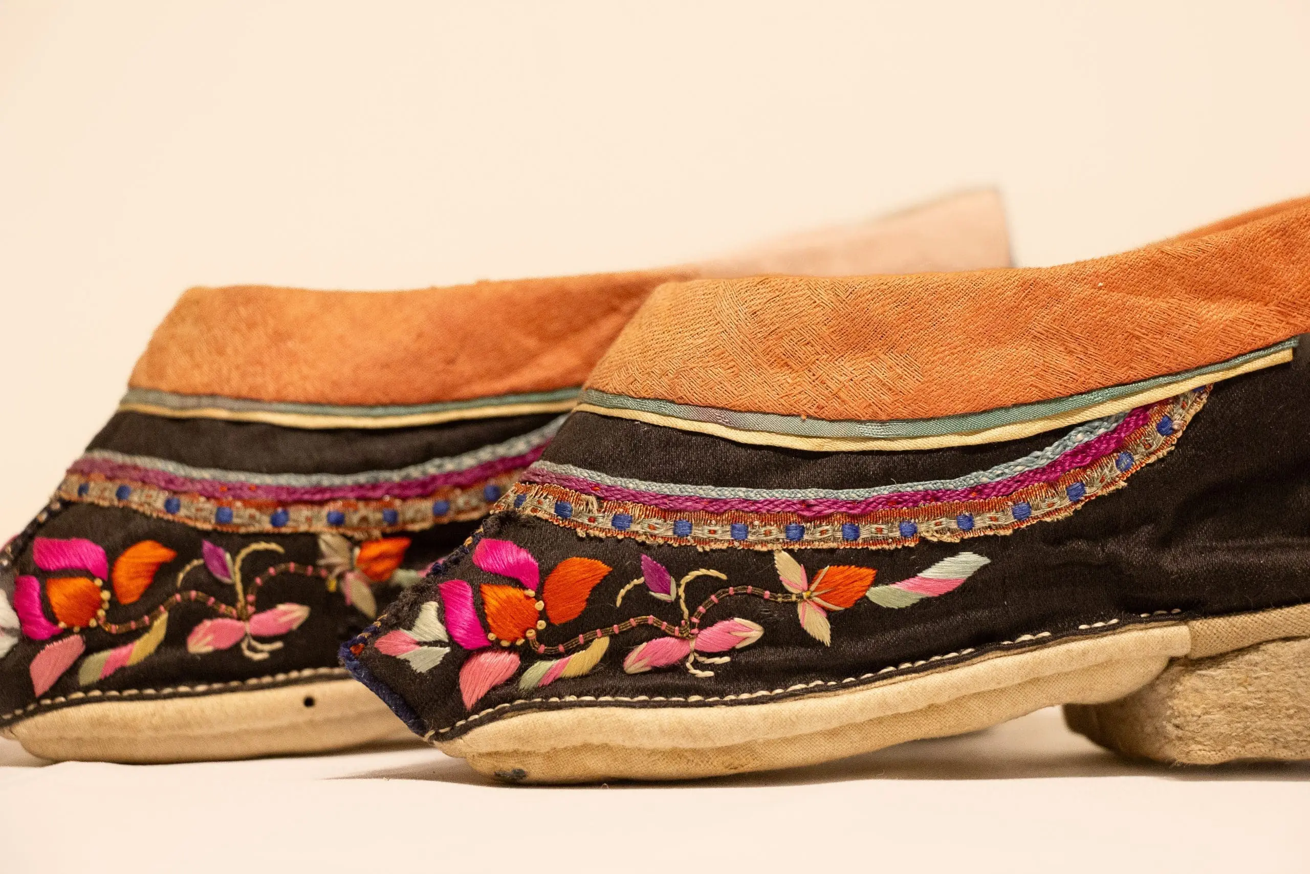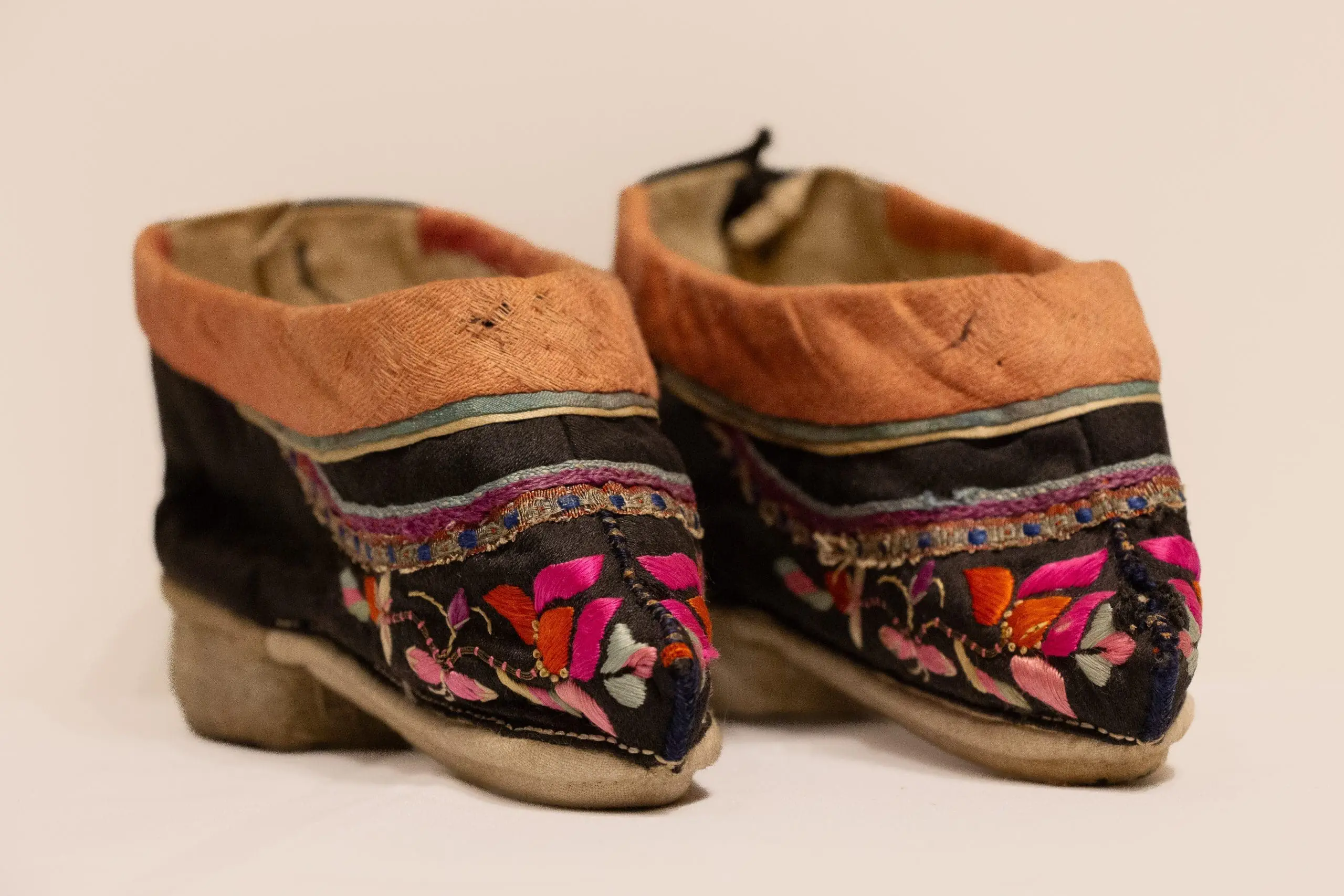 Description A pair of late 19th-century Chinese lotus shoes, crafted in black silk with brightly embroidered floral designs on the sides. Accented with blue piping and a raised heel and instep, these delicately proportioned shoes reflect the artistry of footbinding traditions.