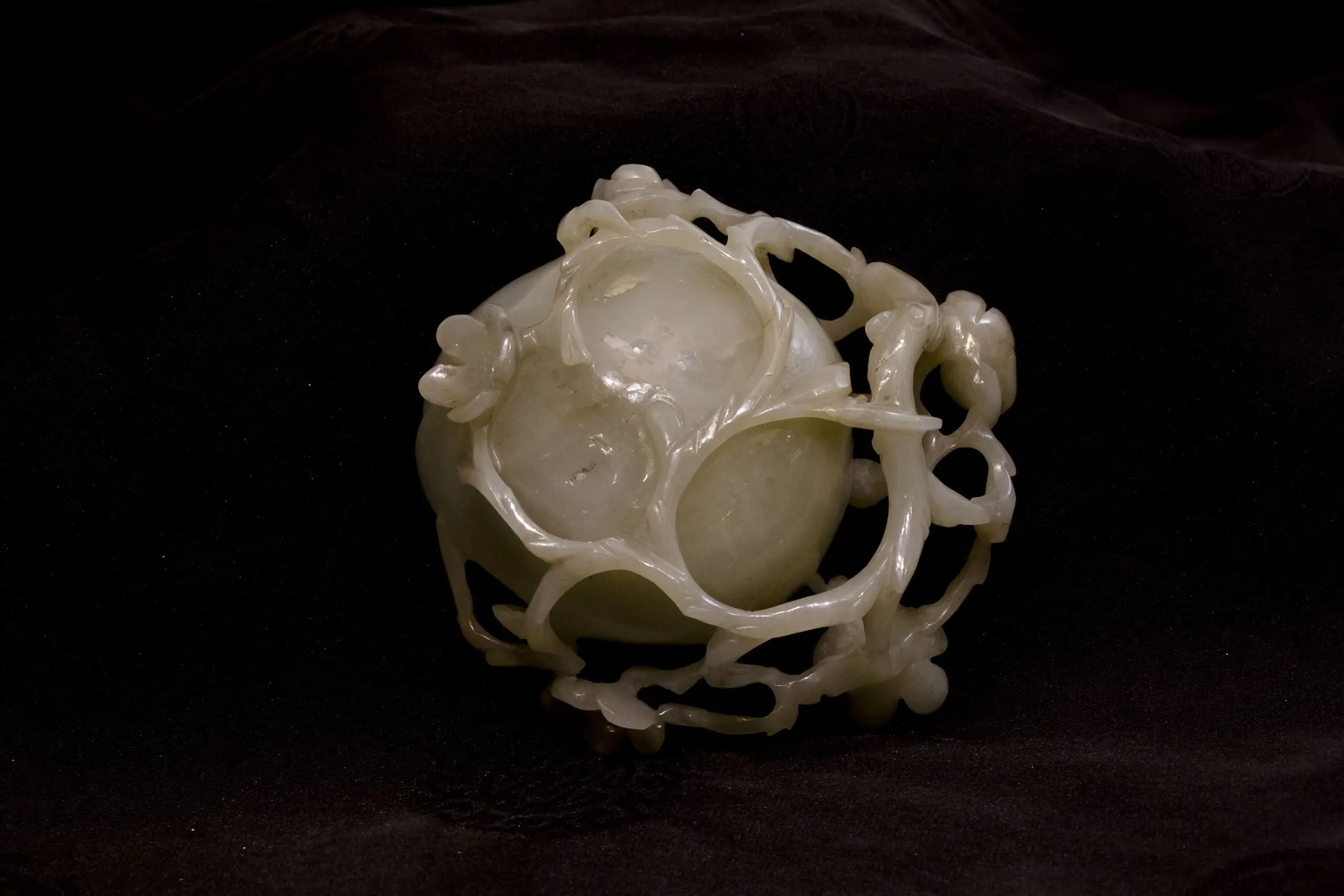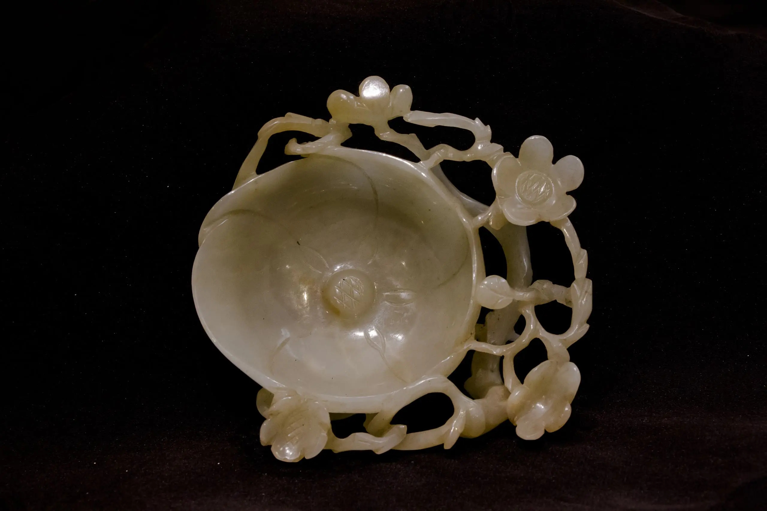 | Description | Small carved white and translucent jadeite bowl with leaves and peaches carved on sides. |
