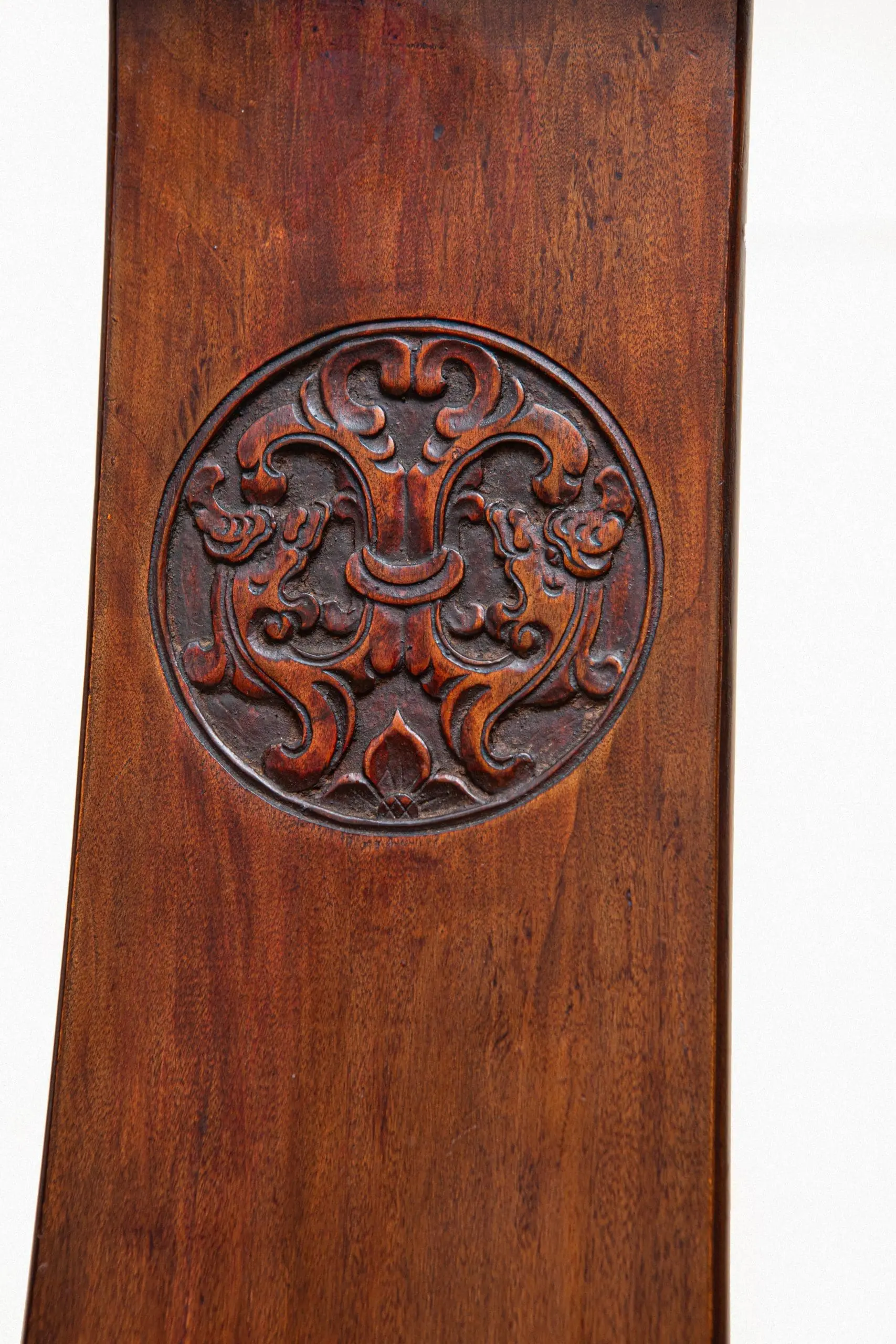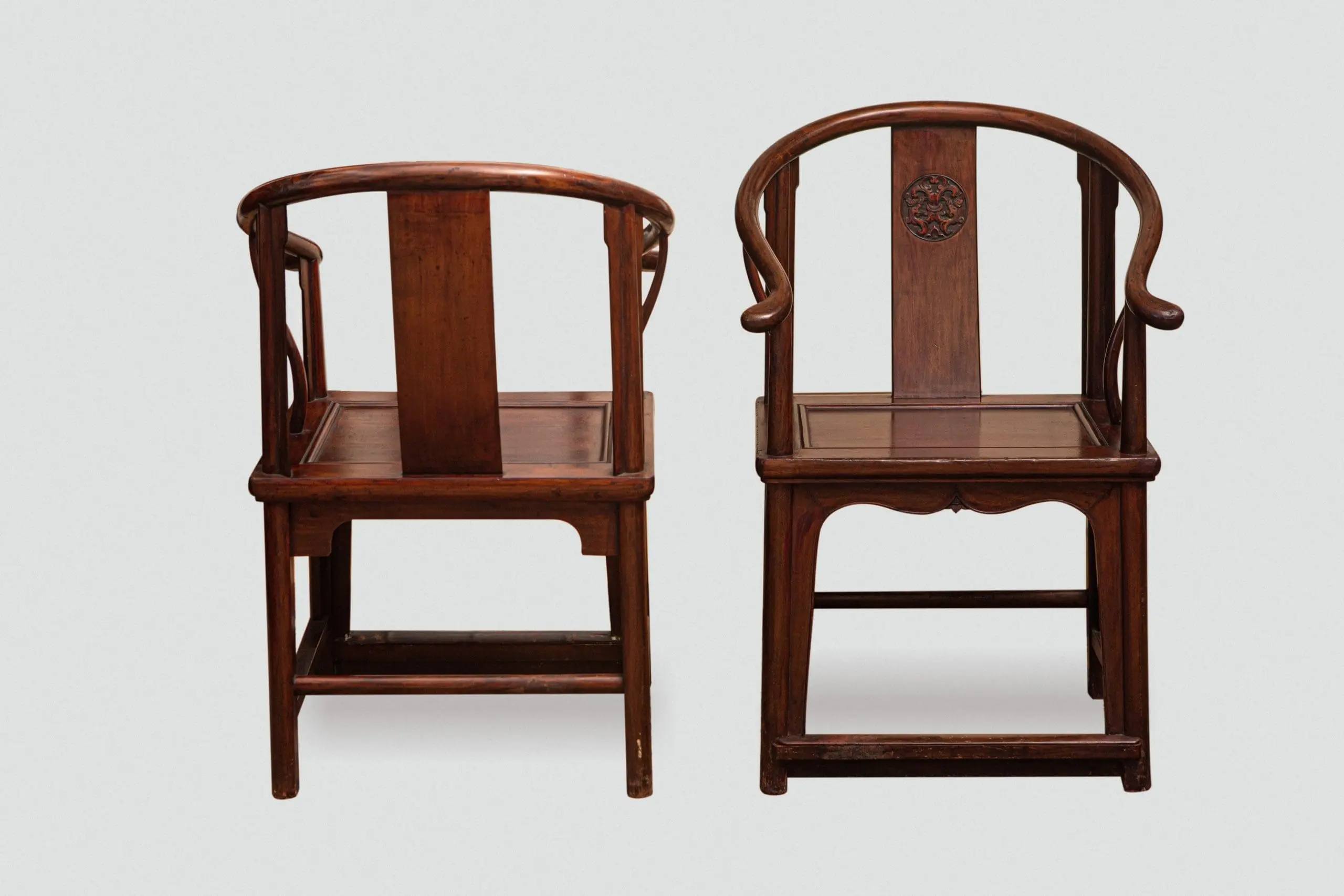 | Description | Pair of horseshoe back armchairs, with carved center medallions of archaic dragons on the gently sloped back splats, stretchers with bamboo covered foot rests. |