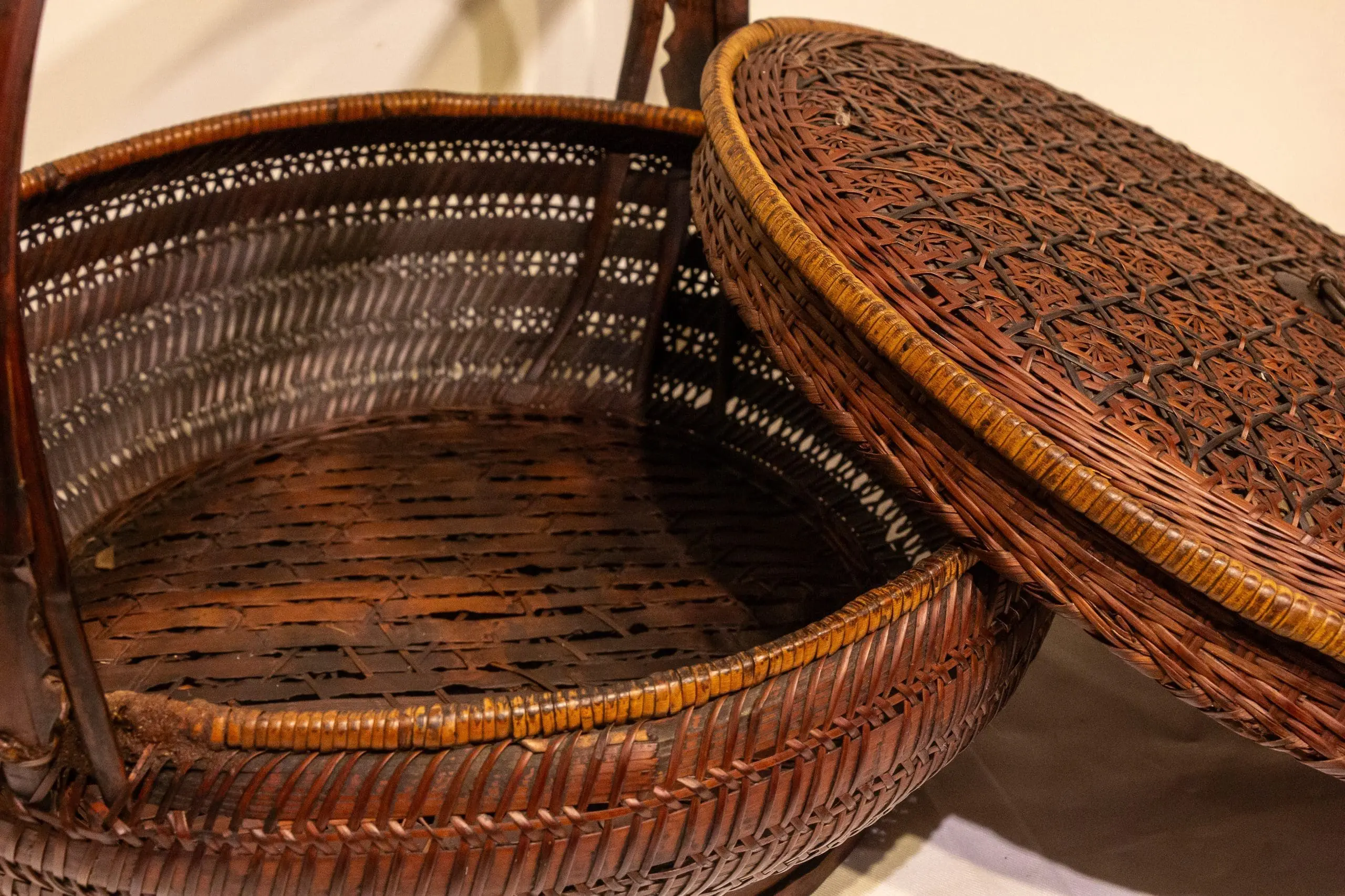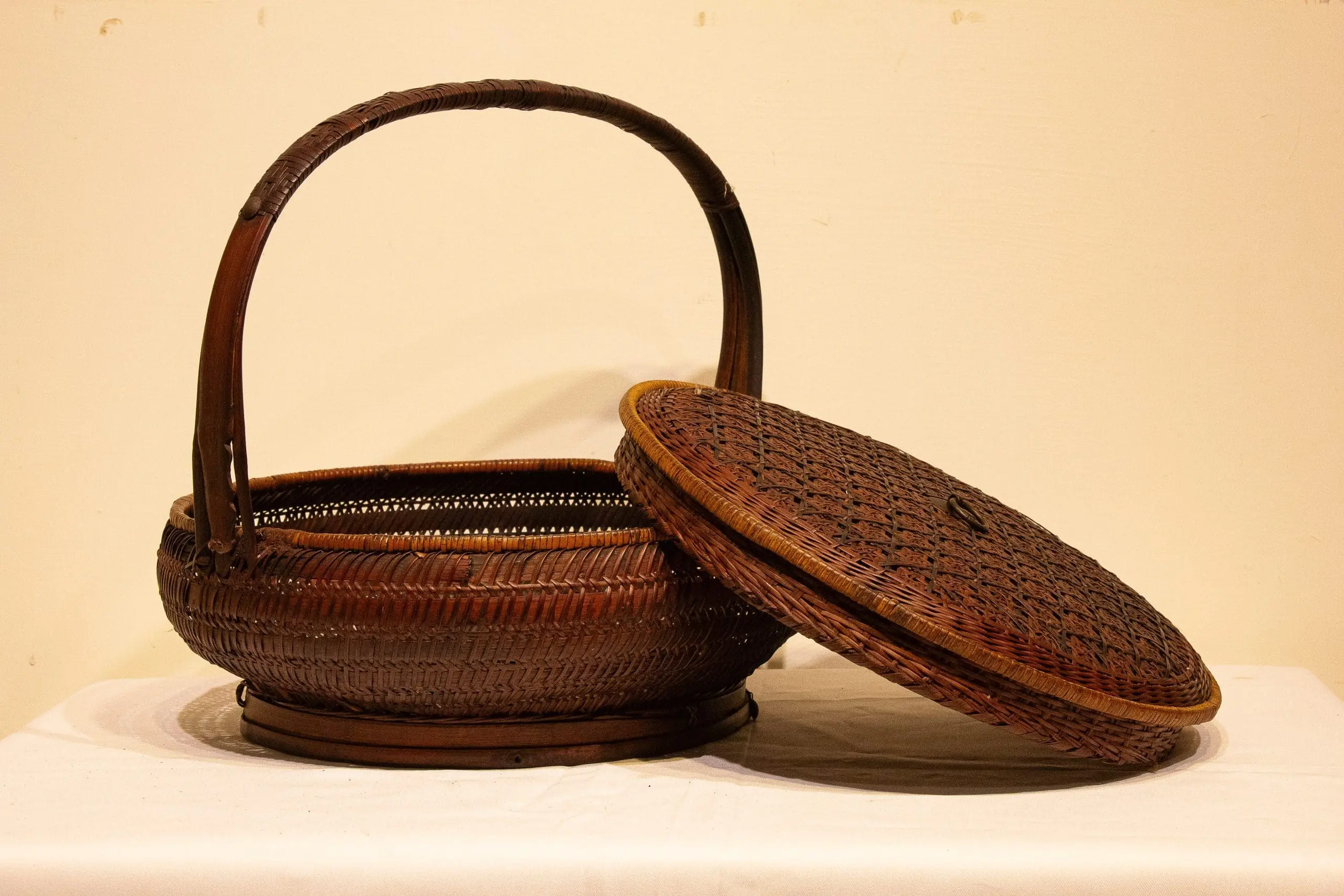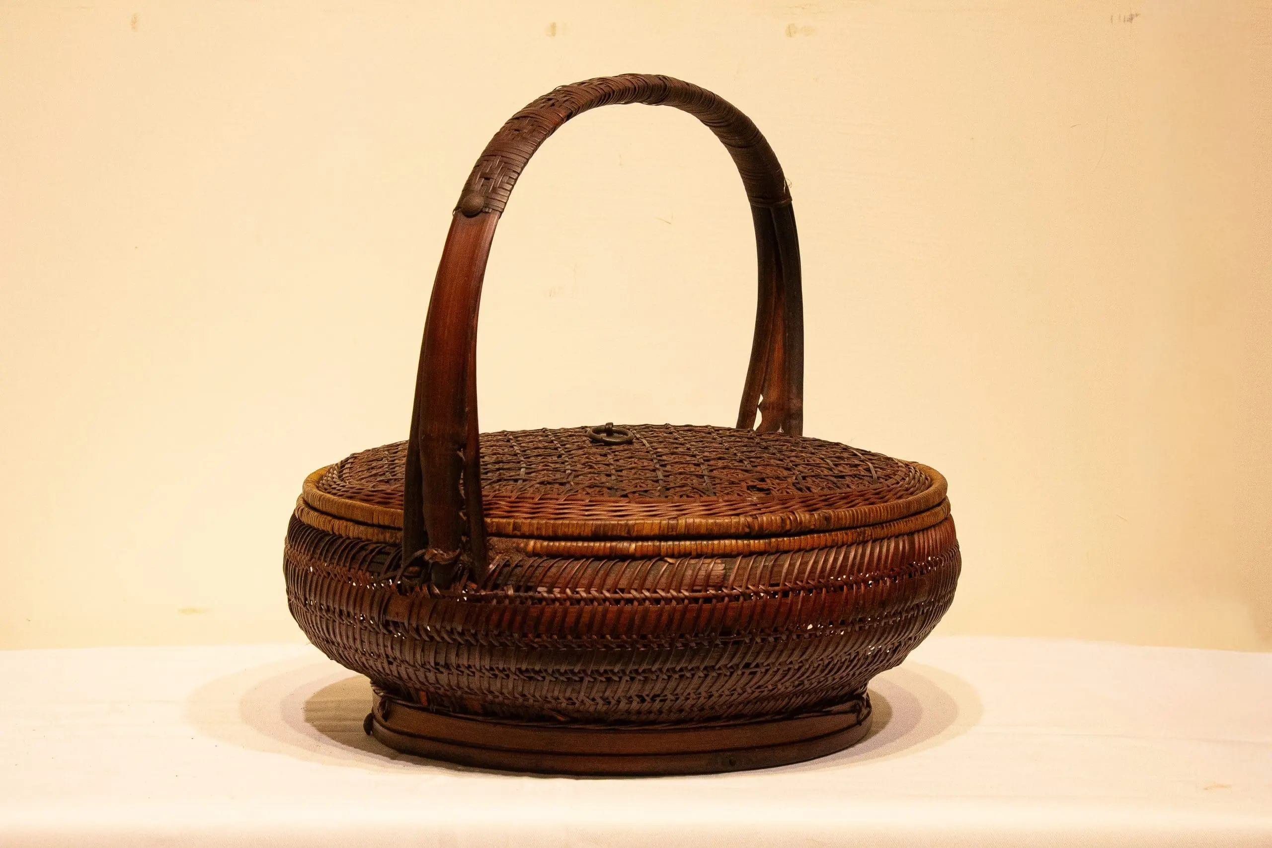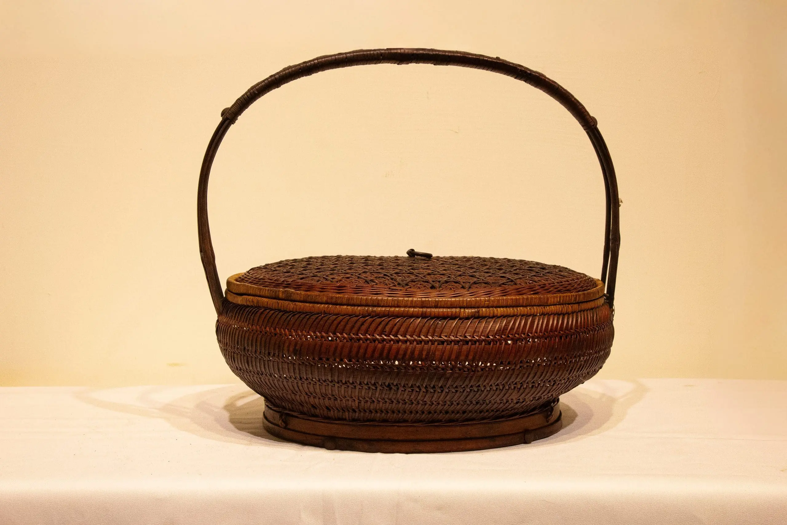 | Description | A finely woven single-tiered lidded basket crafted from split bamboo, featuring an intricate geometric weave on the lid and a gracefully arched handle. The basket’s warm patina and tight, uniform weaving highlight skilled late 19th-century Chinese craftsmanship. |