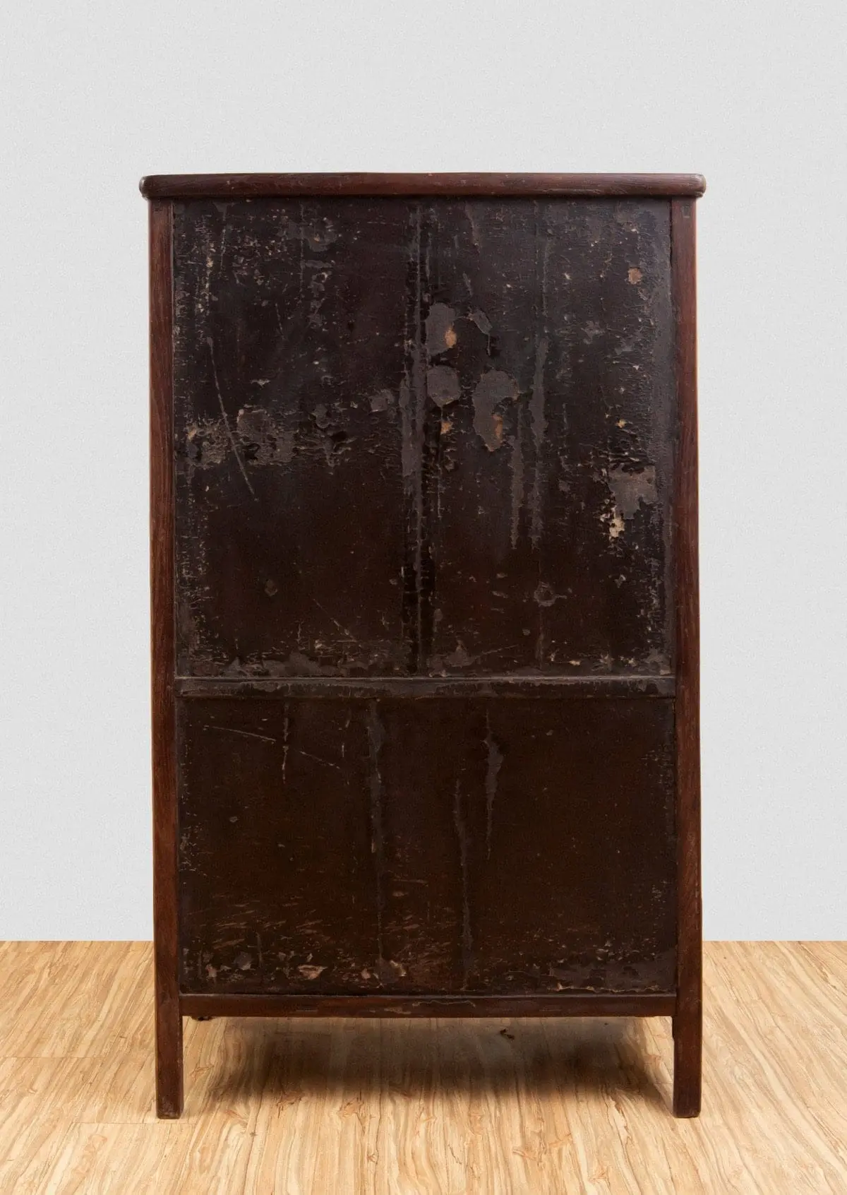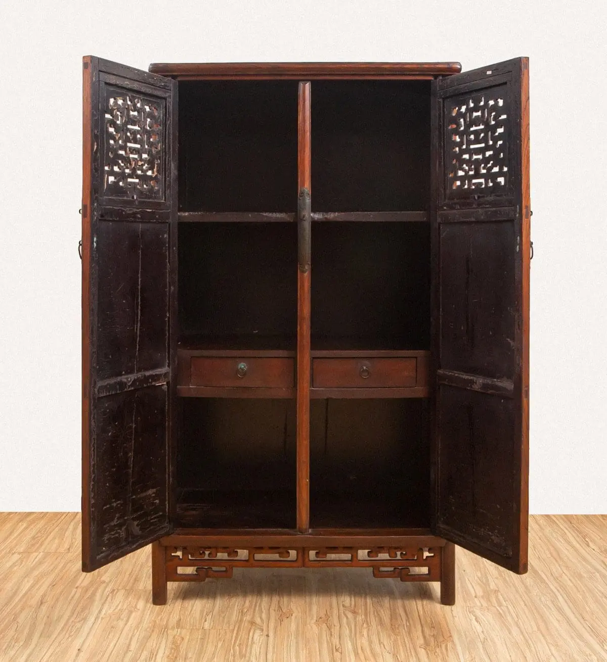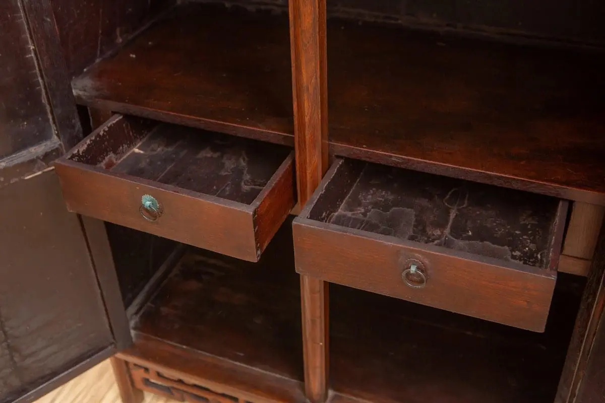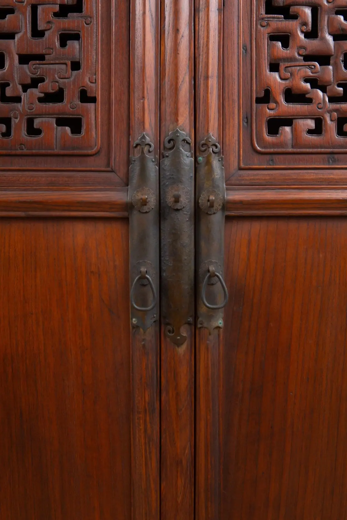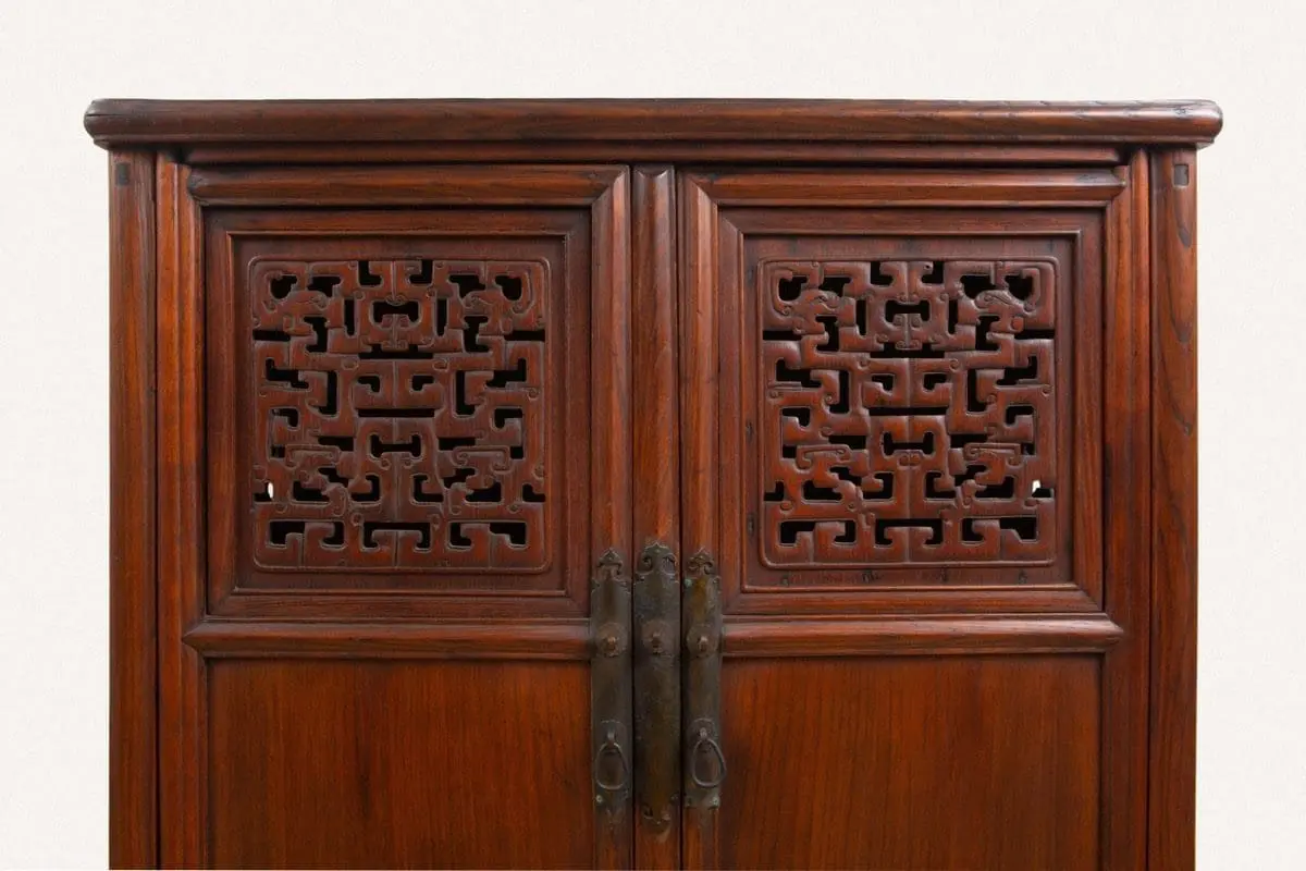 | Description | A large three barred cabinet with wide opening doors, an inset upper panel of openwork carved archaic dragons and foliage, beading on the frame and legs, geometric designed apron. |