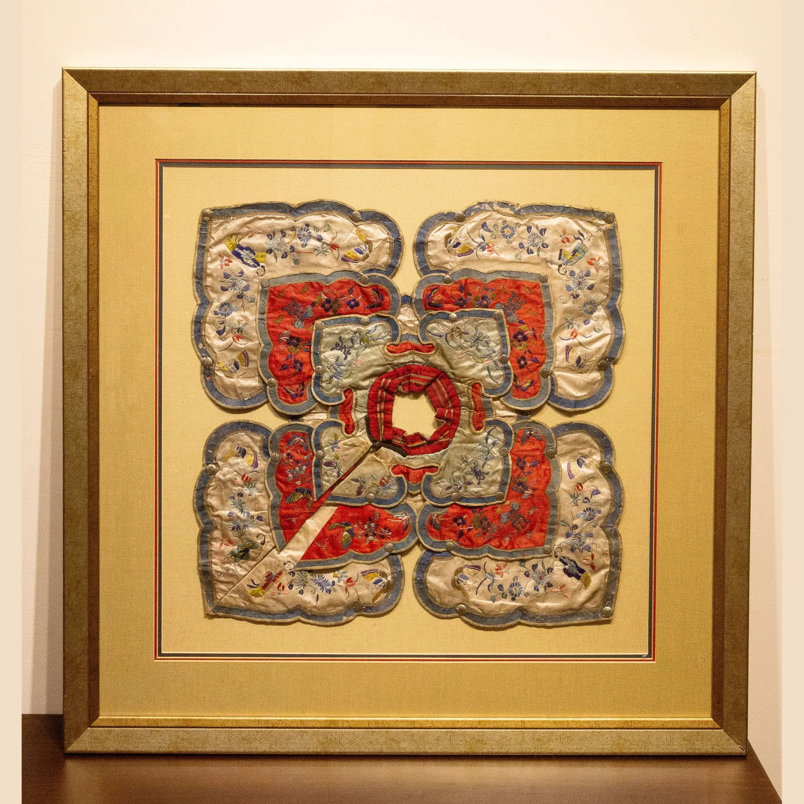 | Description | This mid-19th century Chinese silk collar displays finely embroidered floral motifs in vibrant red, white, and blue silk threads. Once part of a ceremonial robe ensemble, the collar’s auspicious flowers symbolize prosperity and harmony. |