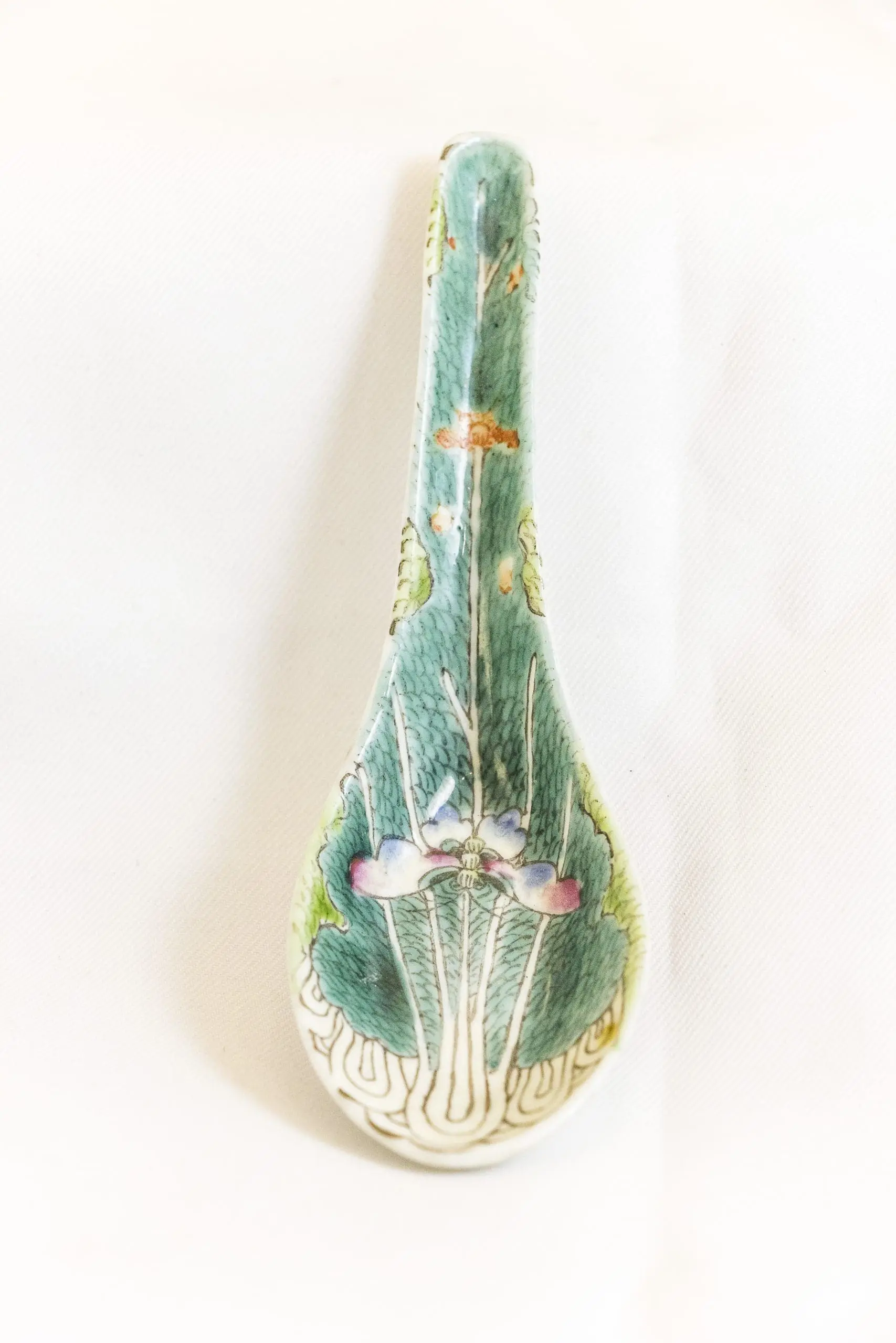 | Description | Set of 4 soup spoons with over glazed green floral design, potentially lotus flowers symbolizing integrity and harmony. |