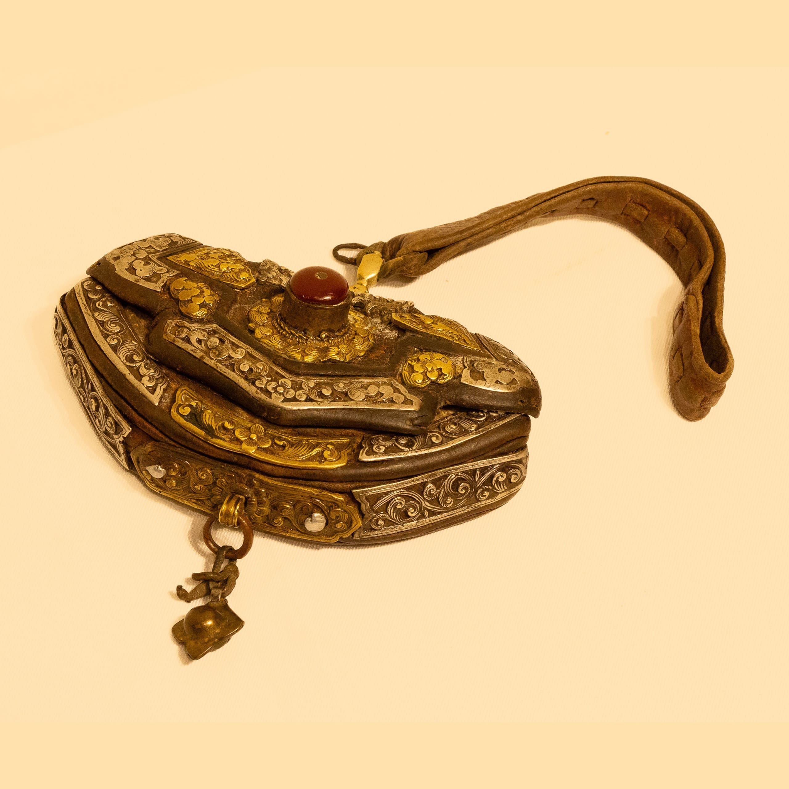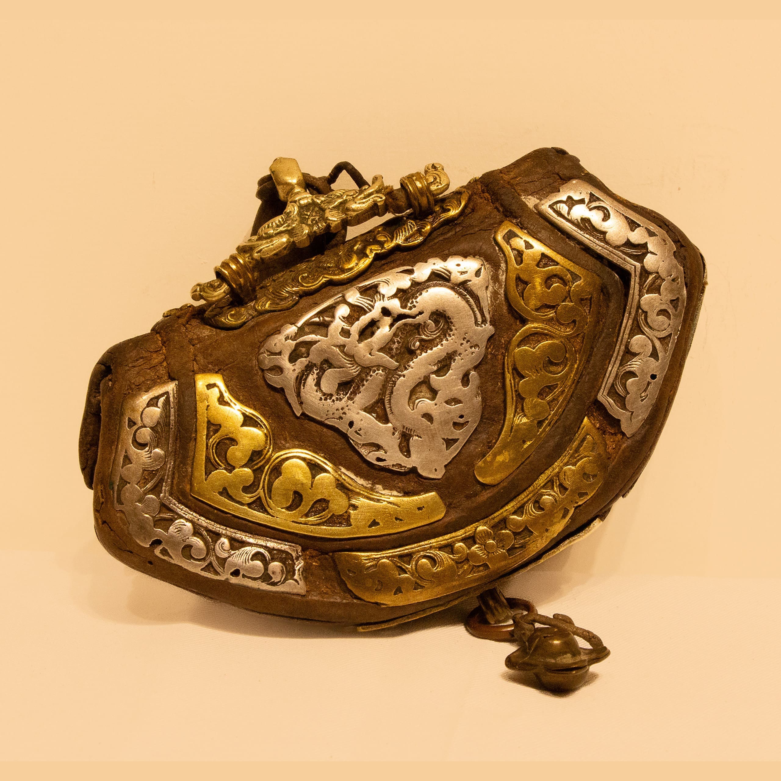 | Description | A Mongolian leather purse with dragon design handle ; silver fishes and flowers on the border; a coral in the center surrounded by clouds. auspicious symbols at the back; brass bell accessory. |