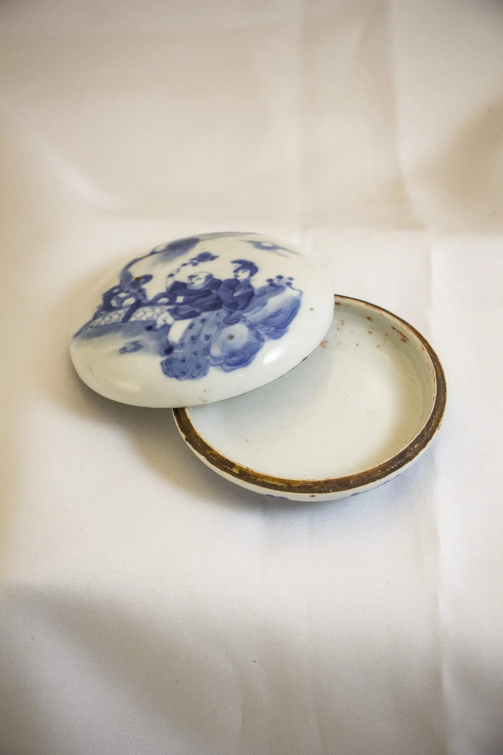 | Description | Small round seal paste box painted in underglaze blue of a woman and servant in a garden. Seal paste boxes were used by scholars to hold vermillion seal paste or ink. The blue color is thought to symbolize heaven, and the white symbolizes purity in this era of Chinese porcelain. |