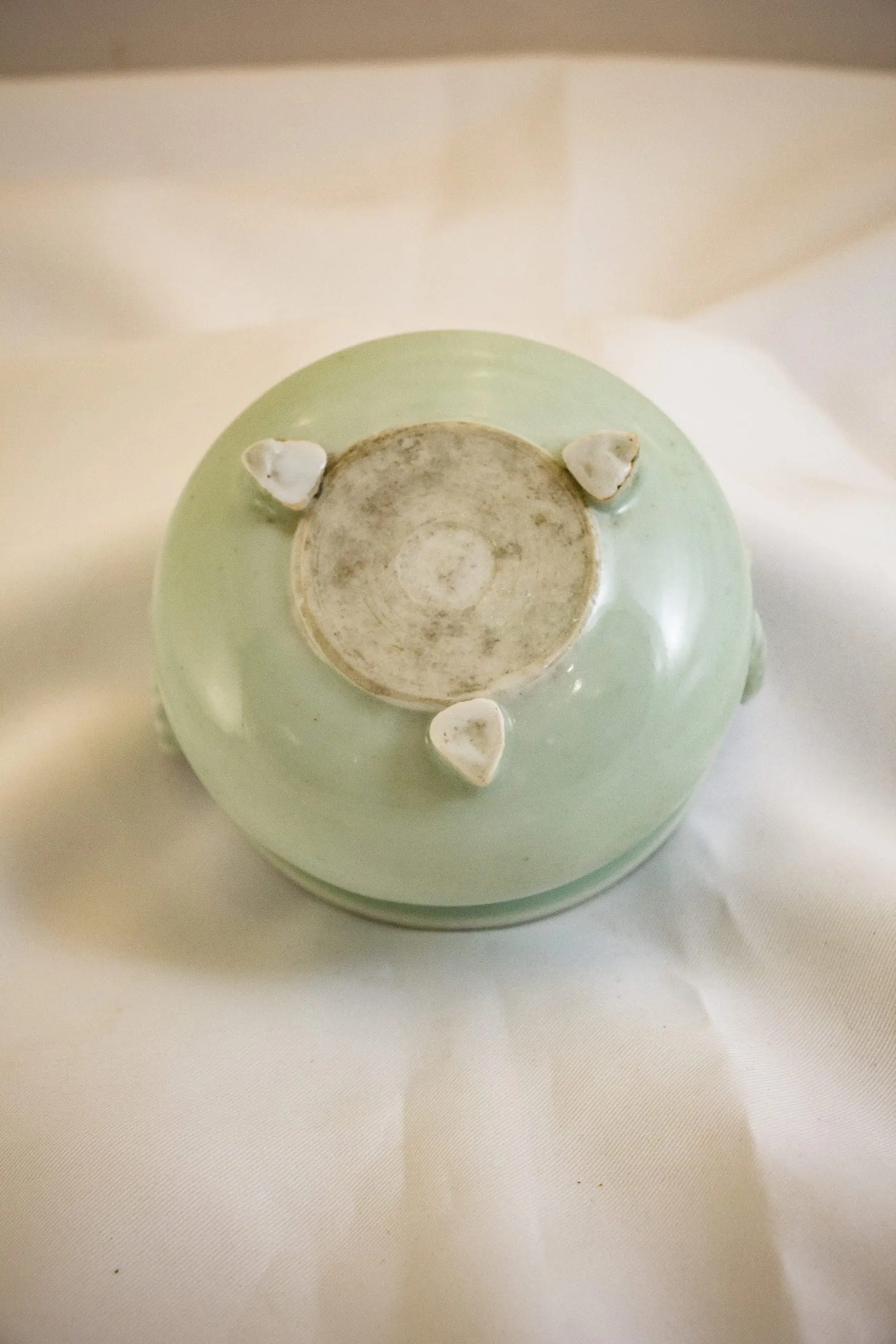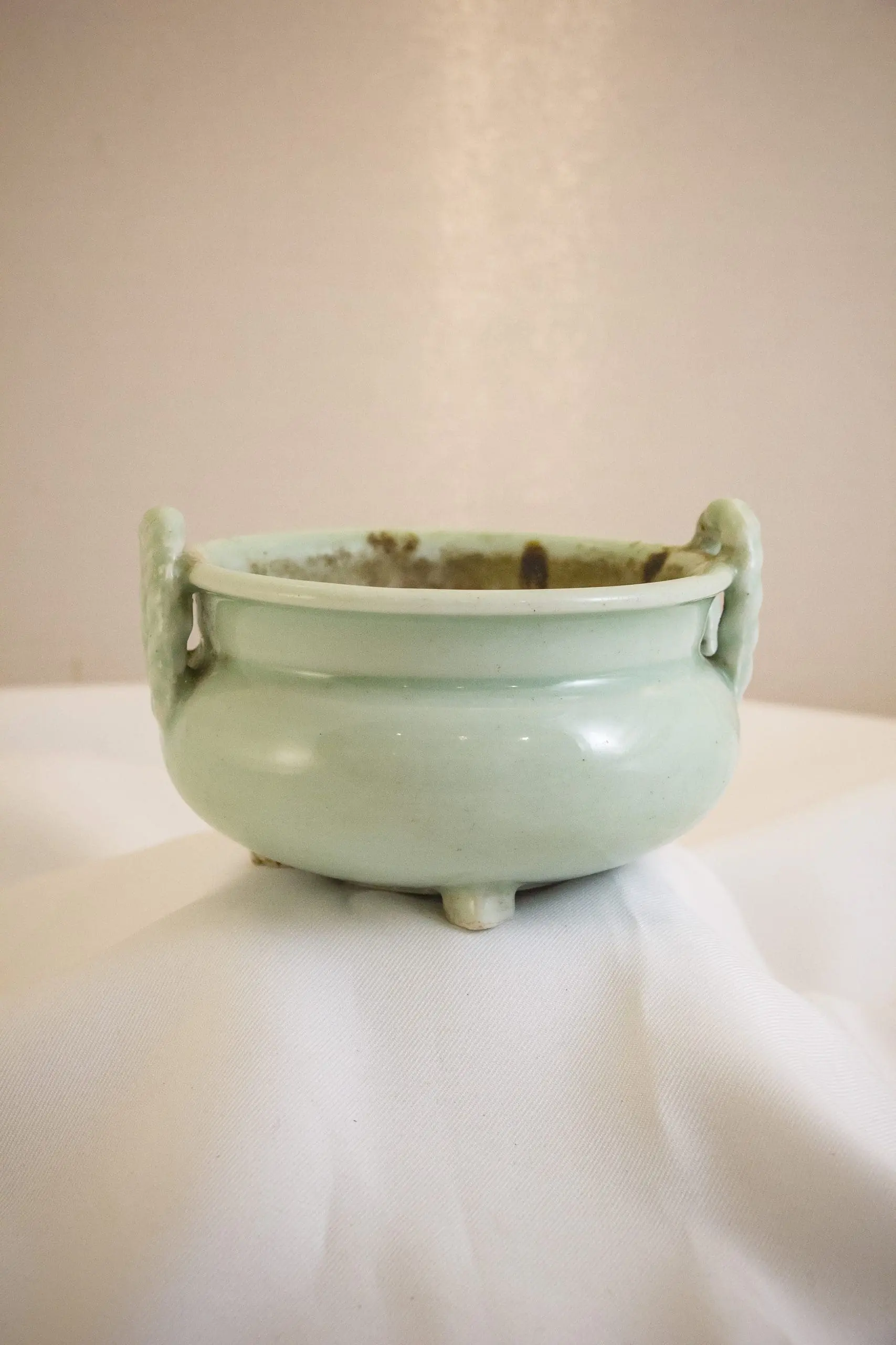 | Description | This elegant porcelain tripod censer features a compressed, globular body supported by three short, conical feet. It is covered in a beautiful, pale celadon green glaze that pools subtly in the recesses. The piece is accented by a pair of striking, looped handles sculpted with a tight spiral or braided pattern. |