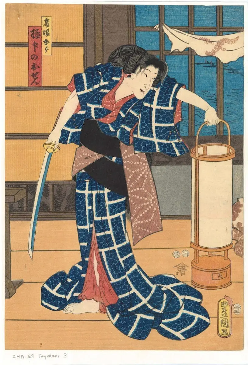By Utagawa Kunisada, this Edo-period ukiyo-e (circa 1852) depicts a dramatic Bijin in a patterned indigo kimono, gripping a sword while steadying a paper lantern. Set within a domestic interior, the composition blends theatrical tension, elegant linework, and refined textile detail typical of Kunisada’s mature style, and expressive narrative clarity.