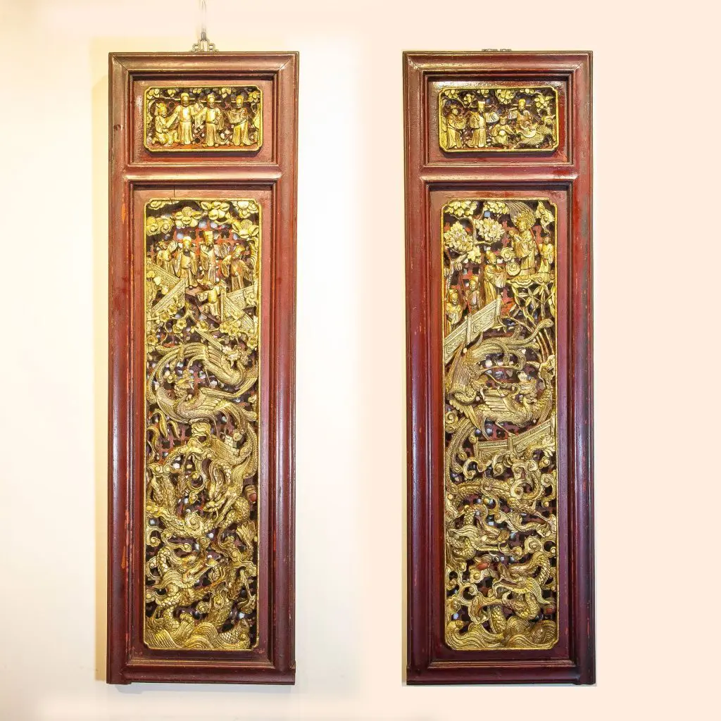 | Description | A pair of elaborate. deeply recessed carved bed side panels depicting a grouping of scholars and high officials amidst a sea of dragons, phoenixes, and fish. Original brown lacquer and gilded finish. |