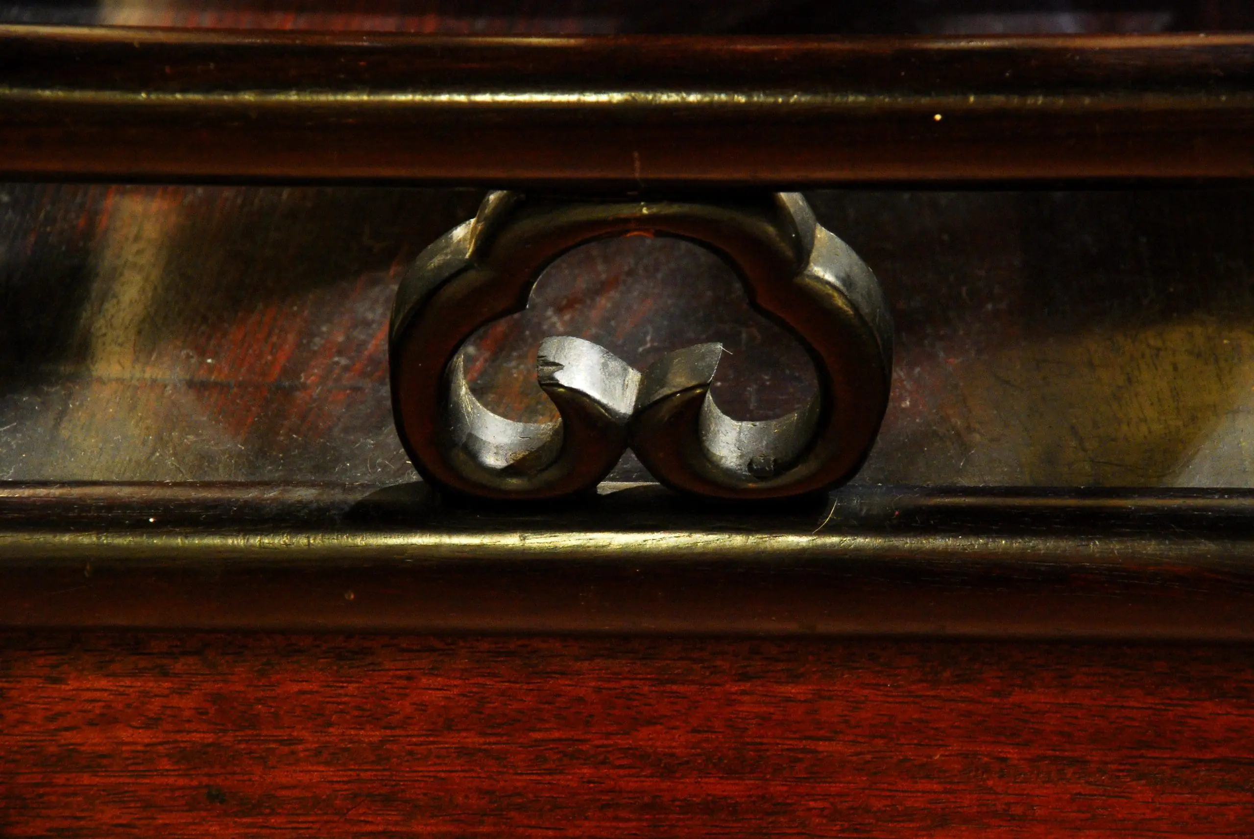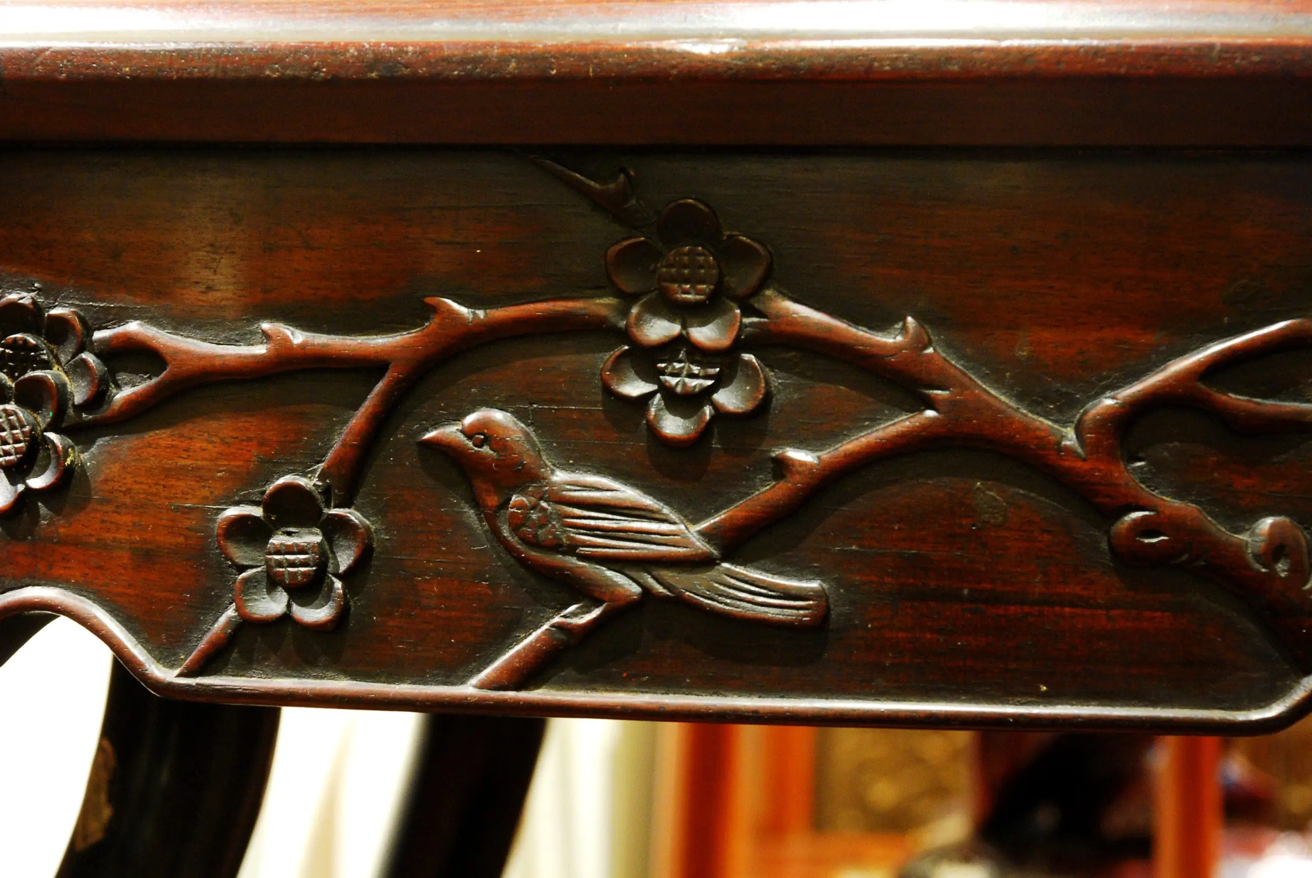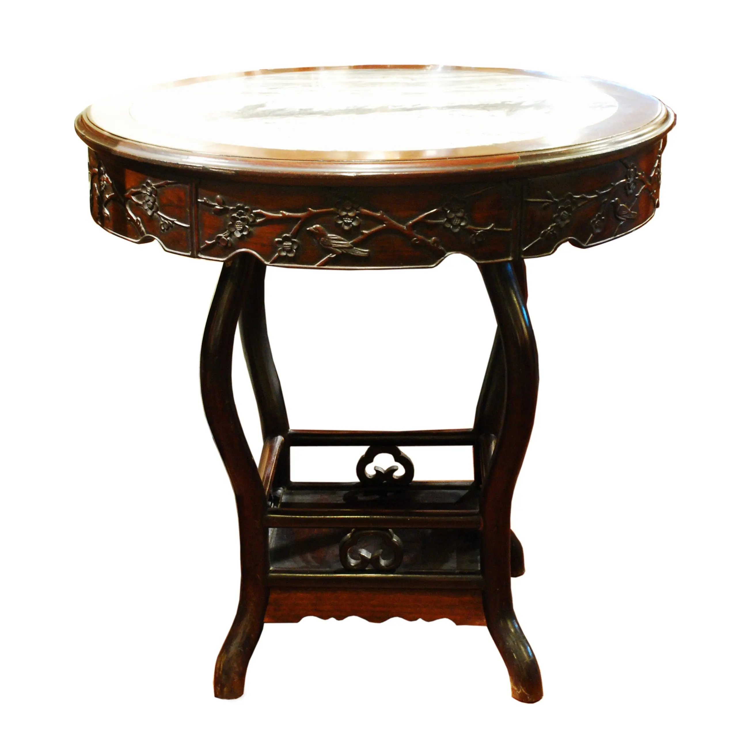 | Description | A unique round table of rosewood with an inset top of landscape marble, carvings of birds and apple blossom in relief around the apron, slim rounded cabriole legs and a pedestal base with carved braces on four sides. |