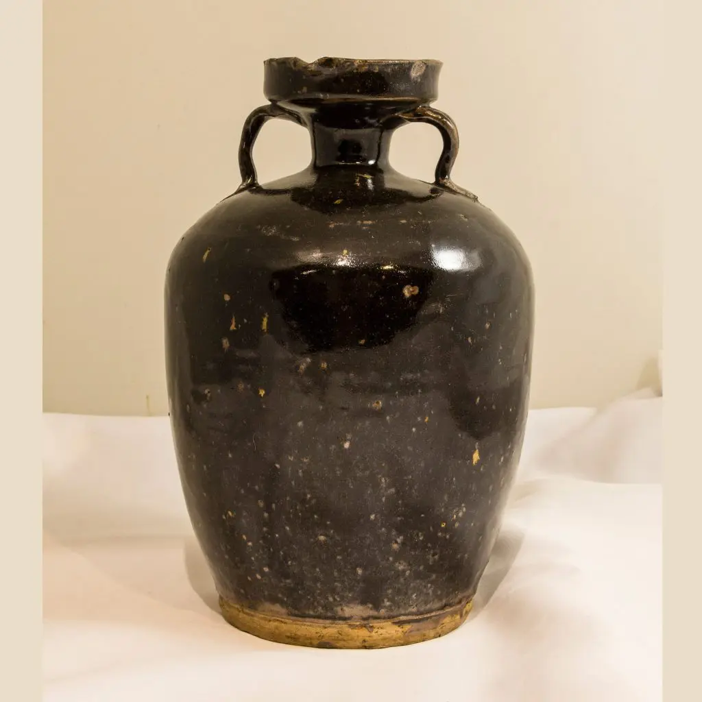 | Description | Black glazed ceramic jar with spout and two ears. |