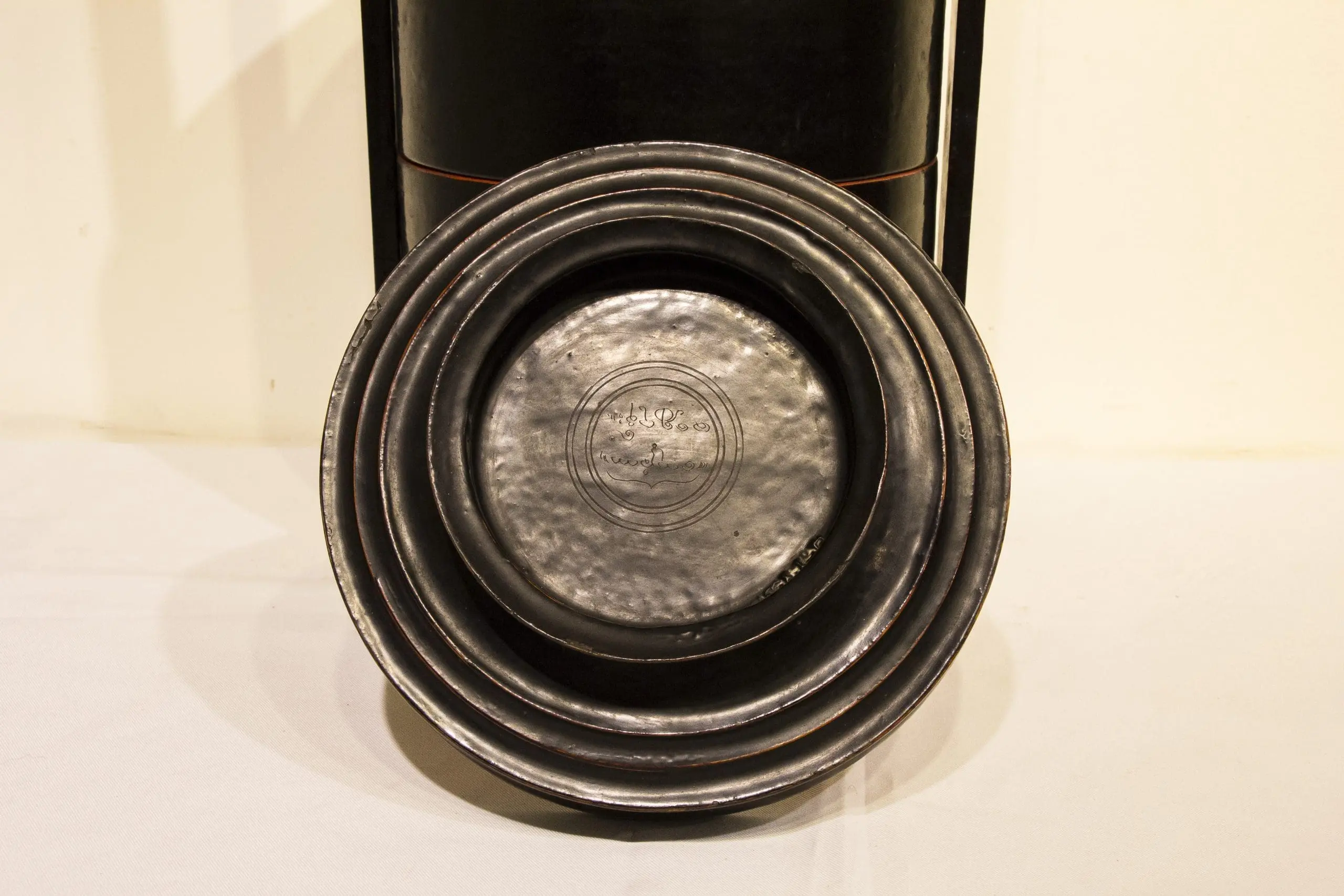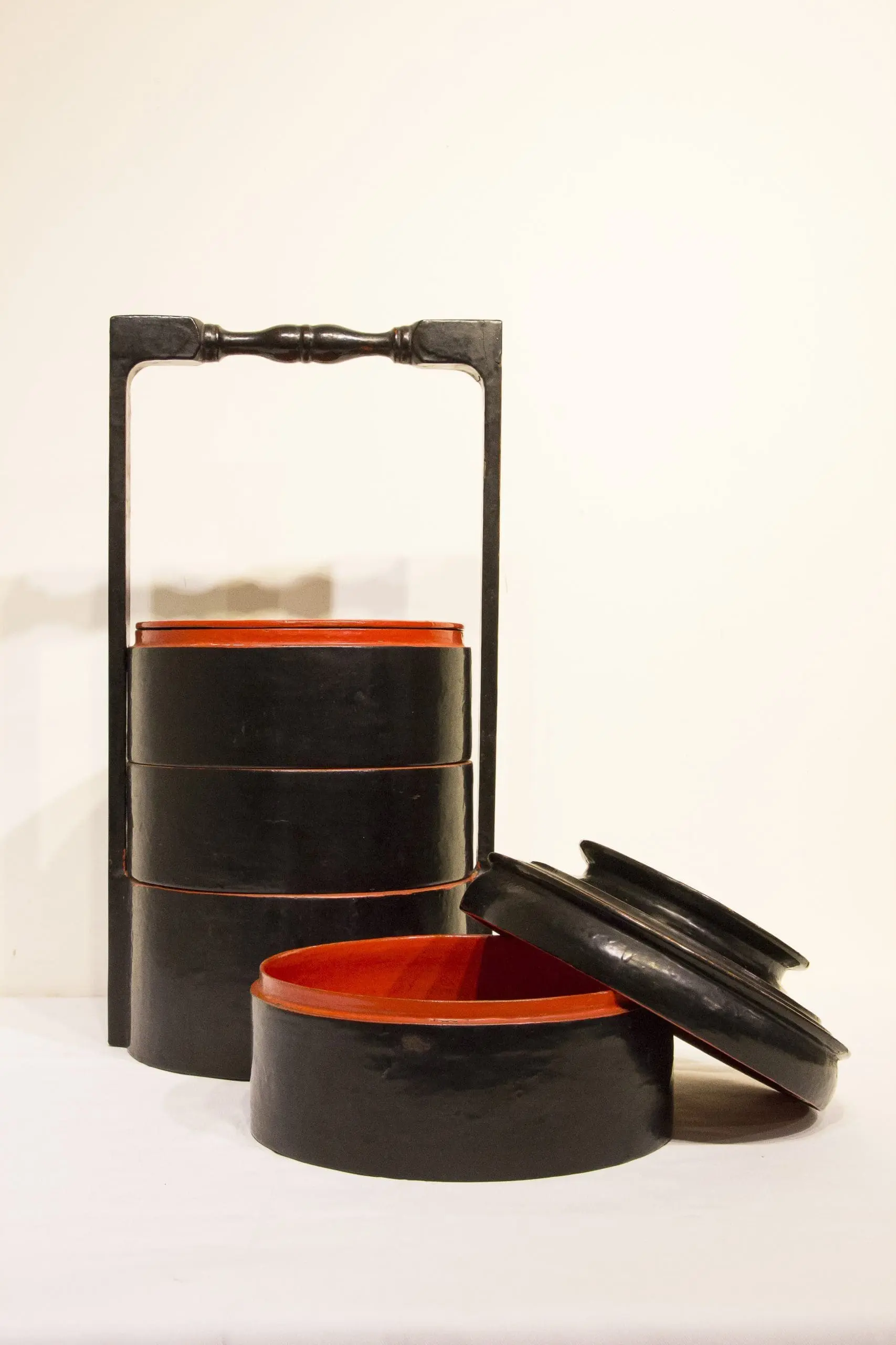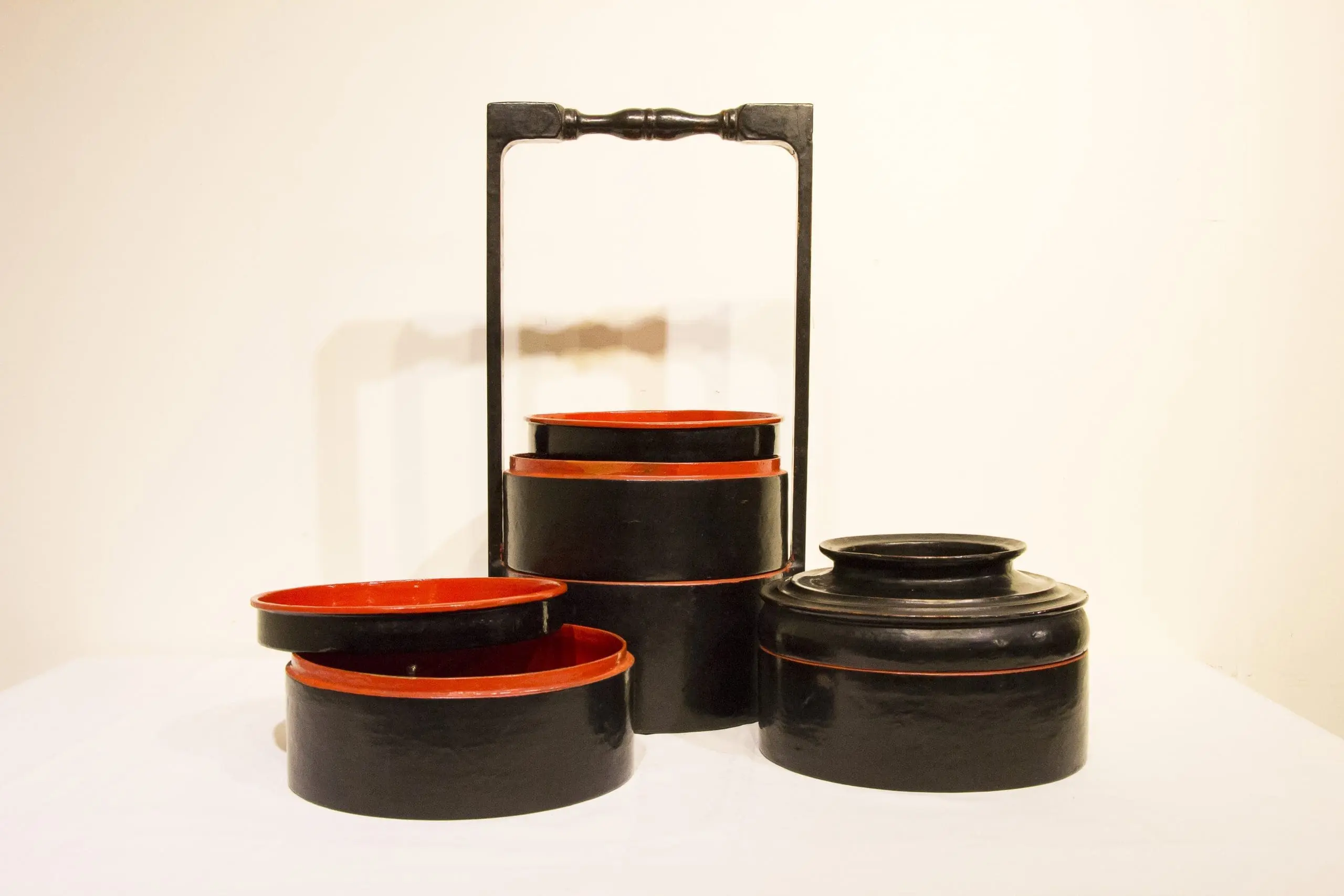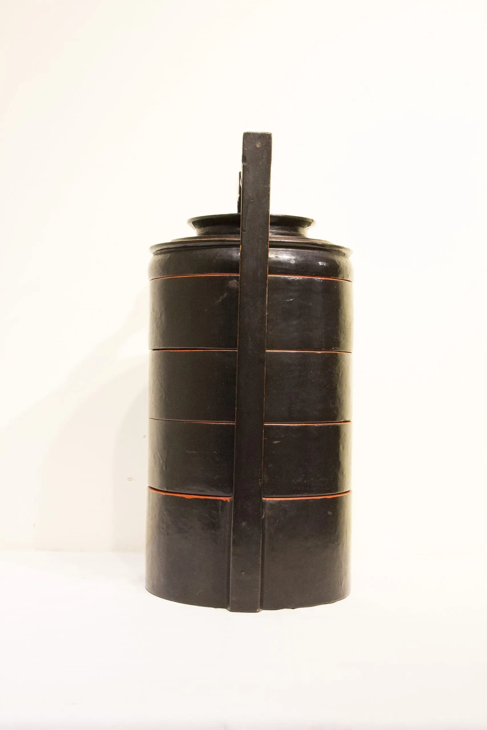 | Description | This traditional Burmese tiffin box consists of four stackable wood compartments held within a frame and finished in black lacquer with thin red bands marking each tier. The hand-turned wooden handle and fitted lid complete the portable design. Such vessels were commonly used for food offerings, travel, or storing prepared meals. |