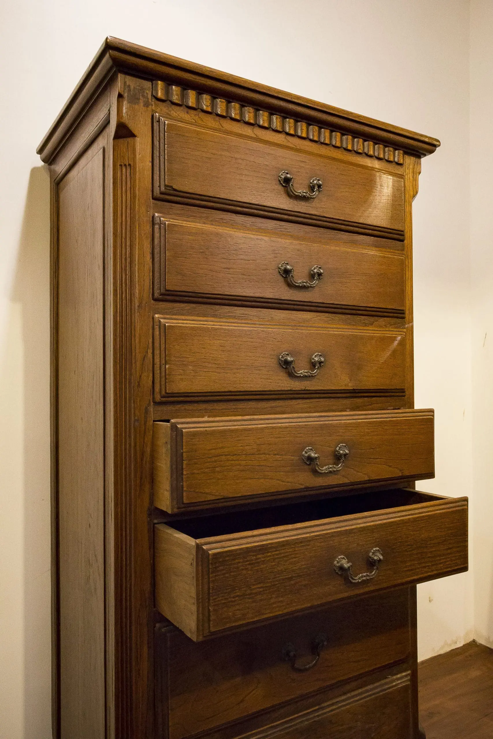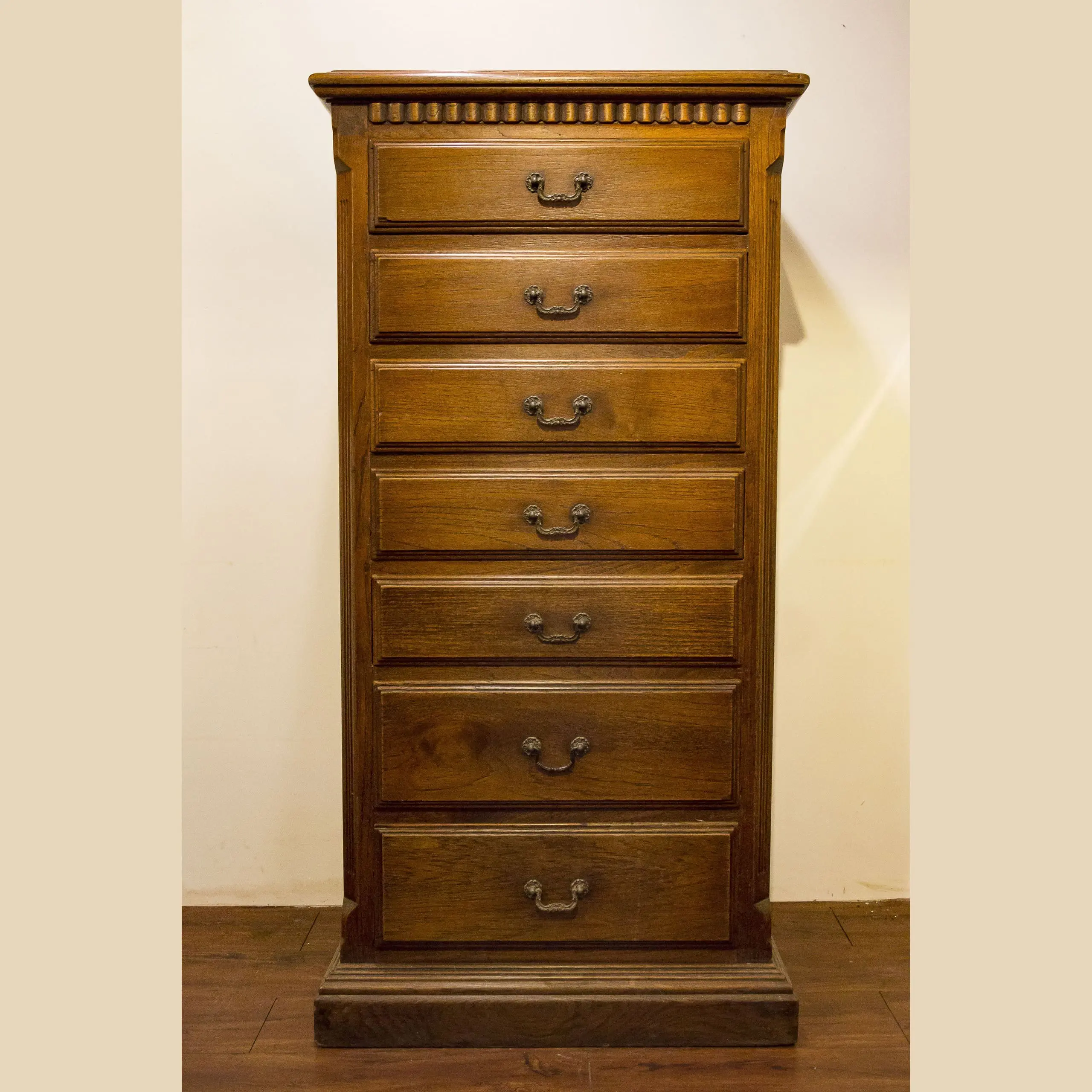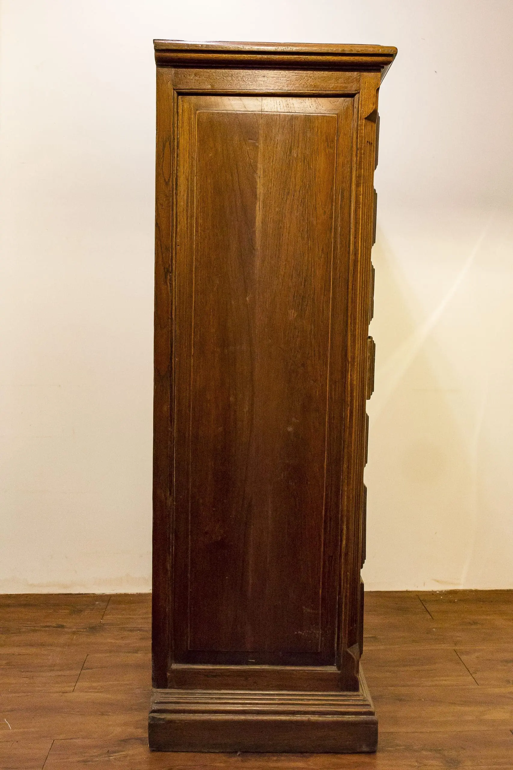 | Description | A practical merchant's file cabinet with a solid top, one row of rectangular drawers ranging from smaller to larger. |