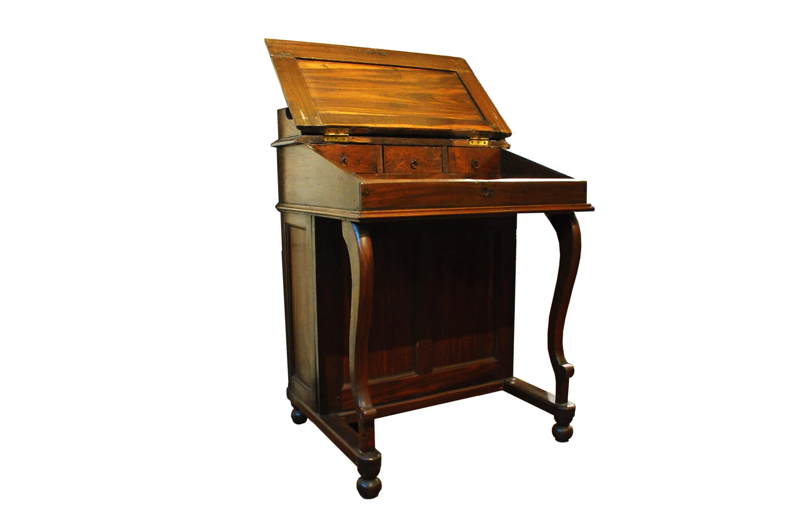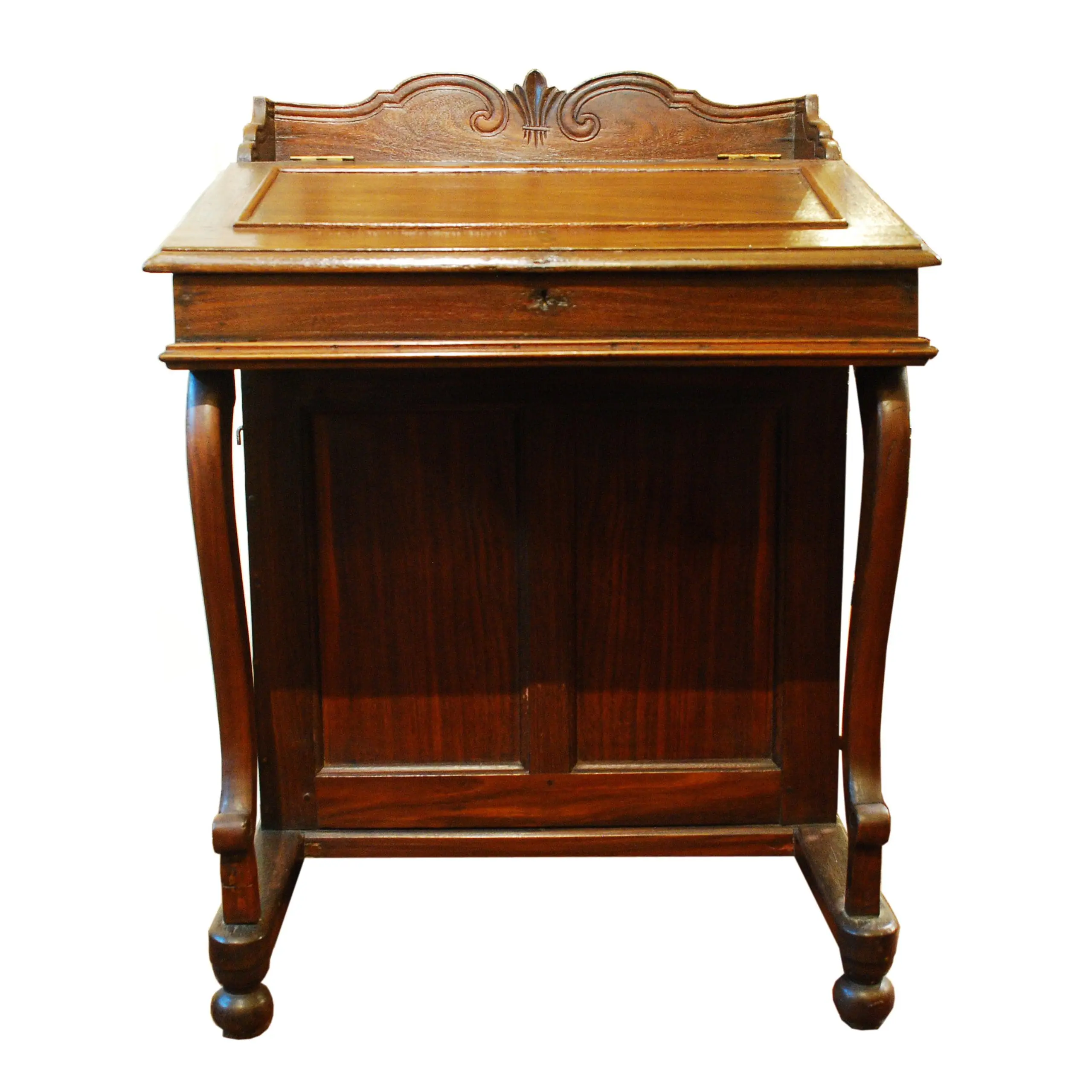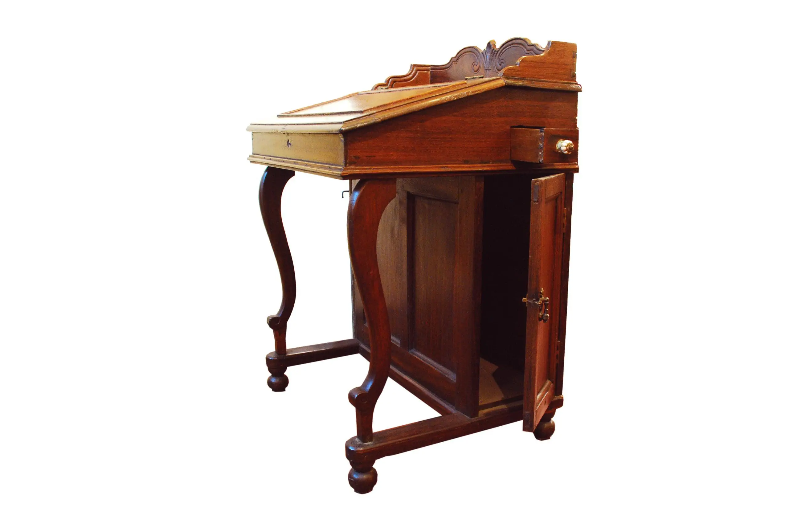 | Description | Late 19th–early 20th century Indochinese teak secretary desk with hinged slant-front writing lid, single drawer, and graceful cabriole legs ending in rounded feet. Crafted from dense golden teak with warm patina, its compact proportions and clean colonial design provide elegant, practical storage and writing space suited to traditional or contemporary interiors. |