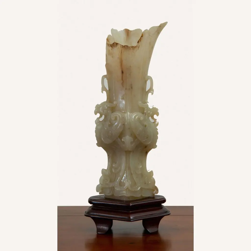 | Description | A rare jade vessel with deep carvings of two archaic dragons wrapped around the sides and a ru yi shaped lip with incised carvings. One side damaged . Nephrite. |
