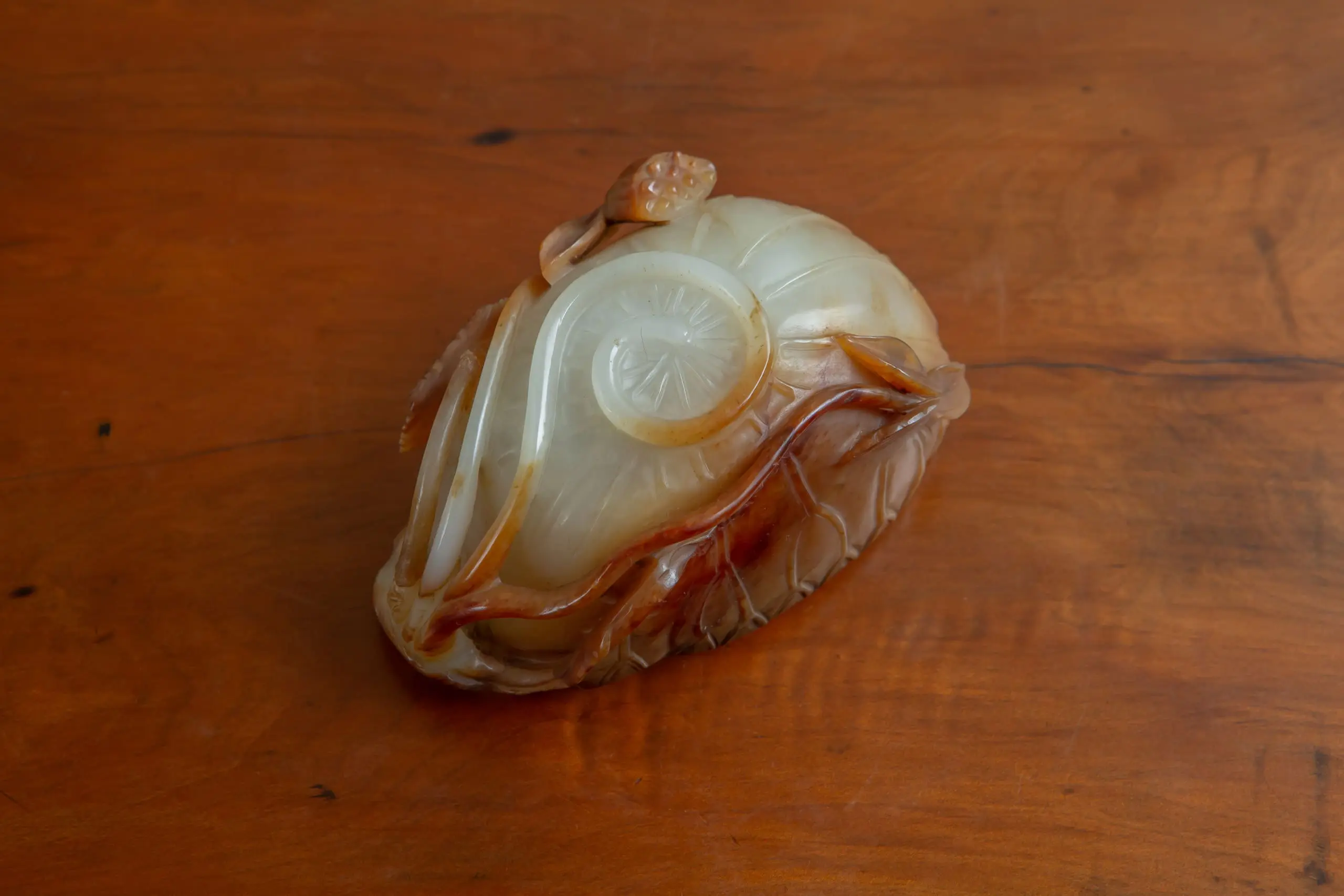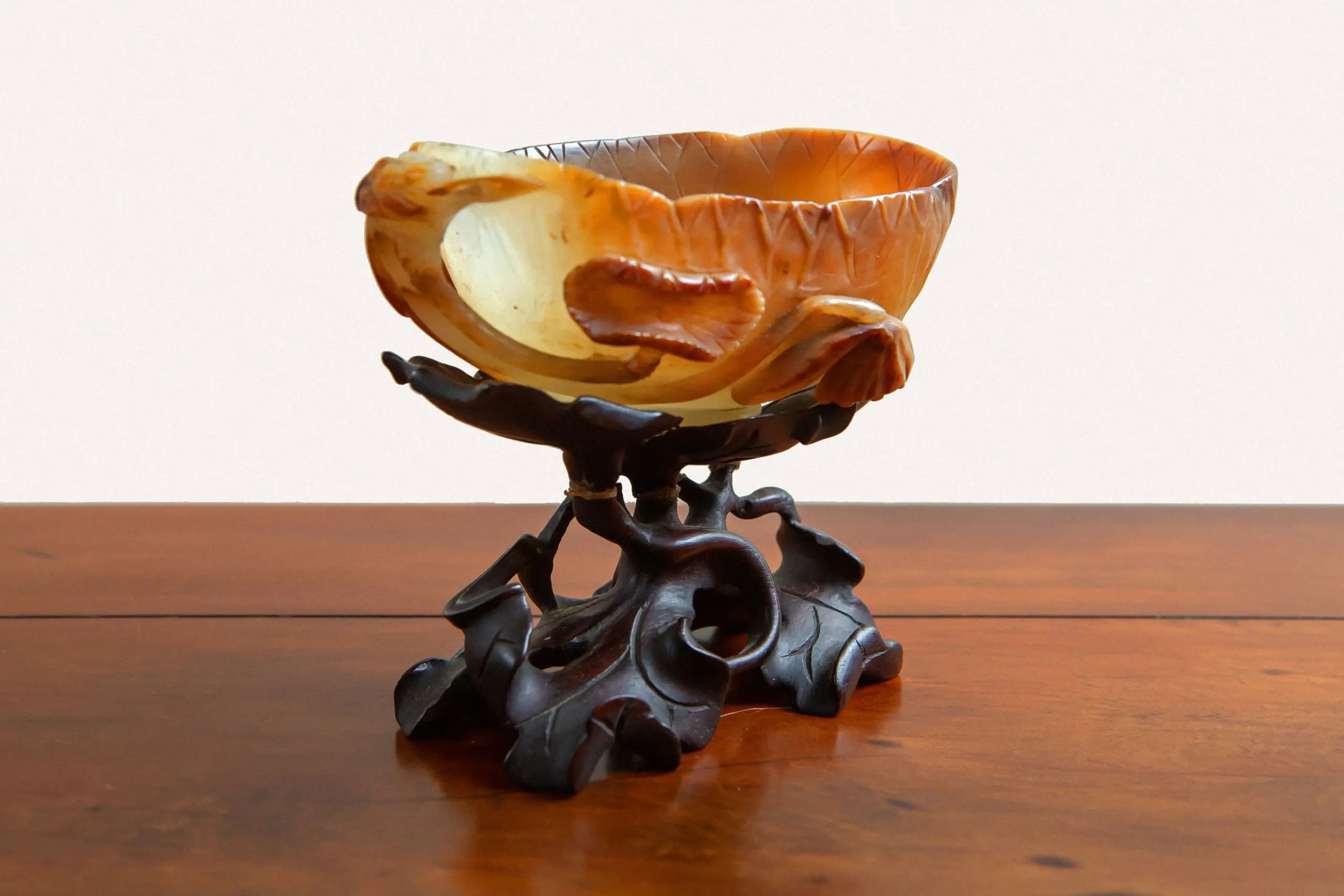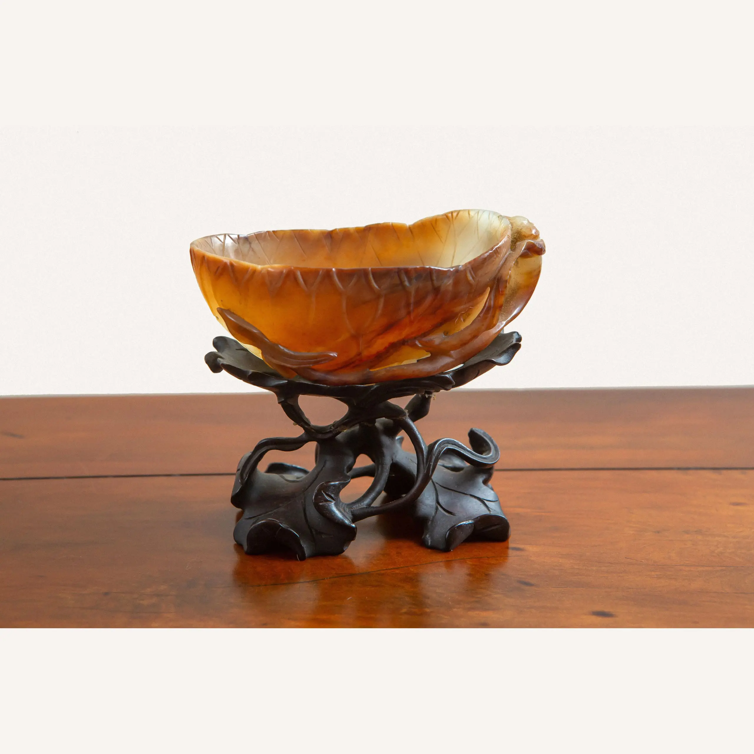 | Description | Carved Jade Bowl with Stand: A unique oblong jade bowl carved in a natural lotus bud shape with lotus leaves and stems in repousse on the side and base, incised carvings inside. Darker brown and lighter green, translucent jade. |